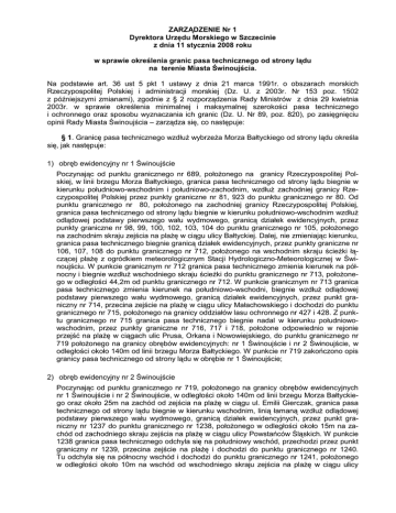 ZARZĄDZENIE Nr 1 Dyrektora Urzędu Morskiego w Szczecinie z dnia 11 stycznia 2008 roku w sprawie określenia granic pasa technicznego od strony lądu na terenie Miasta Świnoujścia. Na podstawie art. 36 ust 5 pkt 1 ustawy z dnia 21 marca 1991r. o obszarach morskich Rzeczypospolitej Polskiej i administracji morskiej (Dz. U. z 2003r. Nr 153 poz. 1502 z późniejszymi zmianami), zgodnie z § 2 rozporządzenia Rady Ministrów z dnia 29 kwietnia 2003r. w sprawie określenia minimalnej i maksymalnej szerokości pasa technicznego i ochronnego oraz sposobu wyznaczania ich granic (Dz. U. Nr 89, poz. 820), po zasięgnięciu opinii Rady Miasta Świnoujścia – zarządza się, co następuje: § 1. Granicę pasa technicznego wzdłuŜ wybrzeŜa Morza Bałtyckiego od strony lądu określa się, jak następuje: 1) obręb ewidencyjny nr 1 Świnoujście Poczynając od punktu granicznego nr 689, połoŜonego na granicy Rzeczypospolitej Polskiej, w linii brzegu Morza Bałtyckiego, granica pasa technicznego od strony lądu biegnie w kierunku południowo-wschodnim i południowo-zachodnim, wzdłuŜ zachodniej granicy Rzeczypospolitej Polskiej przez punkty graniczne nr 81, 923 do punktu granicznego nr 80. Od punktu granicznego nr 80, połoŜonego na zachodniej granicy Rzeczypospolitej Polskiej, granica pasa technicznego od strony lądu biegnie w kierunku południowo-wschodnim wzdłuŜ odlądowej podstawy pierwszego wału wydmowego, granicą działek ewidencyjnych, przez punkty graniczne nr 98, 99, 100, 102, 103, 104 do punktu granicznego nr 105, połoŜonego na zachodnim skraju zejścia na plaŜę w ciągu ulicy Bałtyckiej. Dalej, nie zmieniając kierunku, granica pasa technicznego biegnie granicą działek ewidencyjnych, przez punkty graniczne nr 106, 107, 108 do punktu granicznego nr 712, połoŜonego na wschodnim skraju ścieŜki łączącej plaŜę z ogródkiem meteorologicznym Stacji Hydrologiczno-Meteorologicznej w Świnoujściu. W punkcie granicznym nr 712 granica pasa technicznego zmienia kierunek na północny i biegnie wzdłuŜ wschodniego skraju ścieŜki do punktu granicznego nr 713, połoŜonego w odległości 44,2m od punktu granicznego nr 712. W punkcie granicznym nr 713 granica pasa technicznego zmienia kierunek na południowo-wschodni, biegnie wzdłuŜ odlądowej podstawy pierwszego wału wydmowego, granicą działek ewidencyjnych, przez punkt graniczny nr 714, przecina zejście na plaŜę w ciągu ulicy Małachowskiego i dochodzi do punktu granicznego nr 715, połoŜonego na granicy oddziałów lasu ochronnego nr 427 i 428. Z punktu granicznego nr 715 granica pasa technicznego biegnie nadal w kierunku południowowschodnim, przez punkty graniczne nr 716, 717 i 718, połoŜone odpowiednio w rejonie przejść na plaŜę w ciągach ulic Prusa, Orkana i Nowowiejskiego, do punktu granicznego nr 719 połoŜonego na granicy obrębów ewidencyjnych: nr 1 Świnoujście i nr 2 Świnoujście, w odległości około 140m od linii brzegu Morza Bałtyckiego. W punkcie nr 719 zakończono opis granicy pasa technicznego od strony lądu w obrębie nr 1 Świnoujście; 2) obręb ewidencyjny nr 2 Świnoujście Poczynając od punktu granicznego nr 719, połoŜonego na granicy obrębów ewidencyjnych nr 1 Świnoujście i nr 2 Świnoujście, w odległości około 140m od linii brzegu Morza Bałtyckiego oraz około 25m na zachód od zejścia na plaŜę w ciągu ul. Emilii Gierczak, granica pasa technicznego od strony lądu biegnie w kierunku wschodnim, linią łamaną wzdłuŜ odlądowej podstawy pierwszego wału wydmowego, granicą działek ewidencyjnych, przez punkt graniczny nr 1237 do punktu granicznego nr 1238, połoŜonego w odległości około 15m na zachód od zachodniego skraju zejścia na plaŜę w ciągu ulicy Powstańców Śląskich. W punkcie 1238 granica pasa technicznego odchyla się na południowy wschód, przechodzi przez punkt graniczny nr 1239, przecina zejście na plaŜę i dochodzi do punktu granicznego nr 1240. Tu odchyla się na północny wschód i dochodzi do punktu granicznego nr 1241, połoŜonego w odległości około 10m na wschód od wschodniego skraju zejścia na plaŜę w ciągu ulicy Powstańców Śląskich. Od punktu granicznego nr 1241 granica ponownie przyjmuje kierunek wschodni, biegnie do punktu granicznego nr 1242, przecina zejście na plaŜę w ciągu ulicy Trentowskiego, dalej biegnie przez punkty graniczne nr 1243 i 1244, przecina zejście na plaŜę w ciągu ulicy Bolesława Chrobrego i przez punkty graniczne nr 1245 i 1327 dochodzi do punktu granicznego nr 1246, połoŜonego na wysokości zabudowań byłego punktu obserwacyjnego StraŜy Granicznej. W punkcie granicznym nr 1246 granica pasa technicznego zmienia kierunek na południowy, dochodzi do punktu granicznego nr 1247, połoŜonego w naroŜniku ogrodzenia, tu zmienia kierunek na wschodni i dochodzi wzdłuŜ ogrodzenia do punktu granicznego nr 1248, w którym zmienia kierunek na południowy i dochodzi do punktu granicznego nr 1249, połoŜonego w linii ogrodzenia, w odległości 3,05m od punktu nr 1248. Od punktu granicznego nr 1249, granica pasa technicznego biegnie w kierunku wschodnim, przecina zjazd na plaŜę w ciągu ul. PlaŜowej i przez punkt graniczny nr 1321 dochodzi do punktu granicznego nr 1250, połoŜonego w odległości 43,9m od punktu nr 1249. Od punktu granicznego nr 1250 granica pasa technicznego biegnie nadal w kierunku wschodnim, linią łamaną wzdłuŜ odlądowej podstawy pierwszego wału wydmowego, granicą działek ewidencyjnych, przez punkty graniczne nr 1251, 1252, 1253, 1254, 1255, 1256 do punktu granicznego nr 1257, połoŜonego na zachodnim skraju zejścia na plaŜę w rejonie parkingu kończącego ul. Uzdrowiskową. Dalej nie zmieniając kierunku, granica pasa technicznego biegnie granicą działek ewidencyjnych przez punkty graniczne nr 1038 i 1191 do punktu granicznego nr 805 identycznego z punktem załamania granicy portu morskiego w Świnoujściu nr 466. W punkcie granicznym nr 805 gra