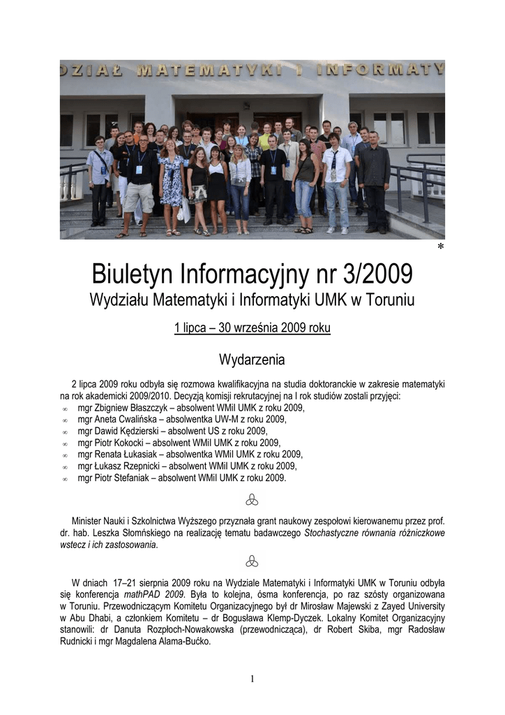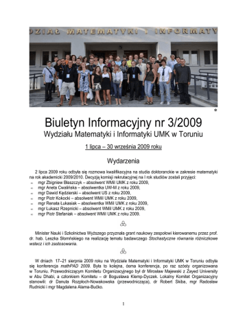 * Biuletyn Informacyjny nr 3/2009 Wydziału Matematyki i Informatyki UMK w Toruniu 1 lipca – 30 września 2009 roku Wydarzenia 2 lipca 2009 roku odbyła się rozmowa kwalifikacyjna na studia doktoranckie w zakresie matematyki na rok akademicki 2009/2010. Decyzją komisji rekrutacyjnej na I rok studiów zostali przyjęci: • mgr Zbigniew Błaszczyk – absolwent WMiI UMK z roku 2009, • mgr Aneta Cwalińska – absolwentka UW-M z roku 2009, • mgr Dawid Kędzierski – absolwent US z roku 2009, • mgr Piotr Kokocki – absolwent WMiI UMK z roku 2009, • mgr Renata Łukasiak – absolwentka WMiI UMK z roku 2009, • mgr Łukasz Rzepnicki – absolwent WMiI UMK z roku 2009, • mgr Piotr Stefaniak – absolwent WMiI UMK z roku 2009. Minister Nauki i Szkolnictwa WyŜszego przyznała grant naukowy zespołowi kierowanemu przez prof. dr. hab. Leszka Słomńskiego na realizację tematu badawczego Stochastyczne równania róŜniczkowe wstecz i ich zastosowania. W dniach 17–21 sierpnia 2009 roku na Wydziale Matematyki i Informatyki UMK w Toruniu odbyła się konferencja mathPAD 2009. Była to kolejna, ósma konferencja, po raz szósty organizowana w Toruniu. Przewodniczącym Komitetu Organizacyjnego był dr Mirosław Majewski z Zayed University w Abu Dhabi, a członkiem Komitetu – dr Bogusława Klemp-Dyczek. Lokalny Komitet Organizacyjny stanowili: dr Danuta Rozpłoch-Nowakowska (przewodnicząca), dr Robert Skiba, mgr Radosław Rudnicki i mgr Magdalena Alama-Bućko. 1 Celem konferencji było zaprezentowanie ciekawych zastosowań technologii komputerowych w nauczaniu matematyki, m.in. programów: Cabri, Geometer's Sketchpad, Scientific Notebook, Matlab Symbolic Math Toolbox oraz Microsoft Math. W konferencji wzięło udział ponad 70 uczestników, głównie nauczycieli matematyki oraz pracowników uczelni wyŜszych zajmujących się dydaktyką matematyki. Współorganizatorami konferencji były: Wydział Matematyki, Fizyki i Techniki UKW w Bydgoszczy oraz Kuratorium Oświaty w Bydgoszczy. Program konferencji przedstawia dokument nr 1. * W dniach 31 sierpnia - 4 września 2009 roku na Wydziale Matematyki i Informatyki UMK w Toruniu odbyły się warsztaty pod nazwą Toruńska Letnia Szkoła Matematyki: Współczesne trendy w matematyce. Szkoła została zorganizowana wspólnymi siłami Koła Naukowego Matematyków UMK i Wydziałowej Rady Samorządu Studenckiego WMiI, przy Ŝyczliwości władz Wydziału. Opiekę naukową nad warsztatami objęli: prof. dr hab. Taras Banakh, dr Zdzisław Dzedzej, dr hab. Stanisław Kasjan (prof. UMK), dr hab. Andrzej Rozkosz (prof. UMK) i dr hab. Piotr Zakrzewski (prof. UW). Warsztaty zaplanowane zostały w formie szkoły, podczas której odbywały się zarówno wykłady kursowe zaproszonych gości, jak i referaty uczestników. Odbyło się 5 kursów, mających na celu wprowadzenie uczestników w aktualną tematykę badań: analizę stochastyczną, teorię reprezentacji algebr, topologiczną teorię punktów stałych, topologię z geometrią i teorię mnogości. Wykłady z jednej strony prezentowały klasyczne wyniki danej dziedziny, z drugiej zaś zwracały uwagę na moŜliwości rozwoju i otwarte problemy, zachęcając tym samym do zainteresowania się prezentowaną tematyką. Wydaje się, Ŝe rozwiązanie to zyskało uznanie uczestników. Półgodzinny referat wygłosił równieŜ prof. Akira Kono z Uniwersytetu w Kioto, przebywający z wizytą naukową w Toruniu. Uczestnicy szkoły zaprezentowali 14 referatów. Trzy z nich przygotowali studenci WMiI UMK. (Program szkoły przedstawia dokument nr 2.) Głównym celem warsztatów było poszerzenie zainteresowań naukowych uczestników, a takŜe nawiązanie i zacieśnienie współpracy ze studentami z innych ośrodków matematycznych. W Toruńskiej Letniej Szkole Matematyki wzięło udział 54 uczestników; warto podkreślić, Ŝe byli to studenci i doktoranci uczelni nie tylko polskich, lecz takŜe ukraińskich. (mgr Zbigniew Błaszczyk, członek Komitetu Organizacyjnego) 3 lipca i 11 września 2009 roku odbyły się rozmowy kwalifikacyjne na Środowiskowe Studia Doktoranckie w zakresie informatyki. Na pierwszy rok studiów w roku akademickim 2009/2010 zostali przyjęci: • mgr Anna Gogolińska – absolwentka WMiI UMK z roku 2009, • mgr Przemysław Krysztowiak – absolwent WMiI UMK z roku 2009, • mgr Grzegorz Marczak – absolwent WMiI UMK z roku 2009, • mgr Michał Matuszak – absolwent WMiI UMK z roku 2009, • mgr inŜ. Jarosław Pakulski – absolwent PG z roku 1995, • mgr Agnieszka Polak – absolwentka WMiI UMK z roku 2009, • mgr Anna Sieradzka – absolwentka WMiI UMK z roku 2009. W dniach 21–26 września 2009 roku odbyły się warsztaty naukowe Forum Obiektowych Baz Danych zorganizowane w Zbicznie przez Wydział Matematyki i Informatyki UMK oraz firmę GLOSSA SJO 2 Krzysztof Hennig. W skład Komitetu Naukowego warsztatów wchodzili dr hab. Krzysztof Stencel, prof. UMK i dr Piotr Wiśniewski. Celem warsztatów było dokładne omówienie współczesnych trendów w badaniach dotyczących obiektowych baz danych oraz składowania danych półstrukturalnych. Zaprezentowano główne nurty badań przedstawiane na konferencjach ICOODB Zurich 2009, VLDB Lyon 2009, ADBIS Ryga 2009. Warsztaty adresowane były do doktorantów przygotowujących rozprawy doktorskie w tematyce baz danych. W wyniku rekrutacji na rok akademicki 2009/2010 na studia stacjonarne I stopnia na kierunku Informatyka przyjęto 46 osób, na kierunku Matematyka – 38 osób (w tym na specjalność ogólną – 18 osób, na specjalność Nauczanie matematyki i informatyki – 7 osób, na specjalność Nauczanie matematyki i fizyki – 3 osoby, na specjalność Matematyka w ekonomii i finansach – 10 osób), a na kierunku Matematyka i ekonomia – 95 osób. Na studia stacjonarne II stopnia na kierunku Informatyka przyjęto 58 osób, a na kierunku Matematyka – 47 osób. • • • • • • • • • 30 września 2009 roku p