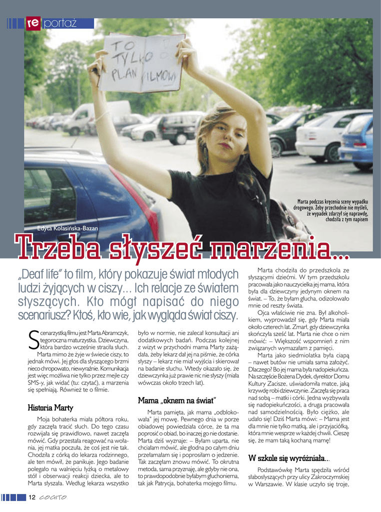 re portaż Marta podczas kręcenia sceny wypadku drogowego. Żeby przechodnie nie myśleli, że wypadek zdarzył się naprawdę, chodziła z tym napisem Edyta Kolasińska-Bazan Trzeba słyszeć marzenia... „Deaf life” to film, który pokazuje świat młodych ludzi żyjących w ciszy... Ich relacje ze światem słyszących. Kto mógł napisać do niego scenariusz? Ktoś, kto wie, jak wygląda świat ciszy. S cenarzystką filmu jest Marta Abramczyk, tegoroczna maturzystka. Dziewczyna, która bardzo wcześnie straciła słuch. Marta mimo że żyje w świecie ciszy, to jednak mówi. Jej głos dla słyszącego brzmi nieco chropowato, niewyraźnie. Komunikacja jest więc możliwa nie tylko przez mejle czy SMS-y, jak widać (tu: czytać), a marzenia się spełniają. Również te o filmie. Historia Marty Moja bohaterka miała półtora roku, gdy zaczęła tracić słuch. Do tego czasu rozwijała się prawidłowo, nawet zaczęła mówić. Gdy przestała reagować na wołania, jej matka poczuła, że coś jest nie tak. Chodziła z córką do lekarza rodzinnego, ale ten mówił, że panikuje. Jego badanie polegało na walnięciu łyżką o metalowy stół i obserwacji reakcji dziecka, ale to Marta słyszała. Według lekarza wszystko 12 cogito było w normie, nie zalecał konsultacji ani dodatkowych badań. Podczas kolejnej z wizyt w przychodni mama Marty zażądała, żeby lekarz dał jej na piśmie, że córka słyszy – lekarz nie miał wyjścia i skierował na badanie słuchu. Wtedy okazało się, że dziewczynka już prawie nic nie słyszy (miała wówczas około trzech lat). Mama „oknem na świat” Marta pamięta, jak mama „odblokowała” jej mowę. Pewnego dnia w porze obiadowej powiedziała córce, że ta ma poprosić o obiad, bo inaczej go nie dostanie. Marta dziś wyznaje: – Byłam uparta, nie chciałam mówić, ale głodna po całym dniu przełamałam się i poprosiłam o jedzenie. Tak zaczęłam znowu mówić. To okrutna metoda, sama przyznaję, ale gdyby nie ona, to prawdopodobnie byłabym głuchoniema, tak jak Patrycja, bohaterka mojego filmu. Marta chodziła do przedszkola ze słyszącymi dziećmi. W tym przedszkolu pracowała jako nauczycielka jej mama, która była dla dziewczyny jedynym oknem na świat. – To, że byłam głucha, odizolowało mnie od reszty świata. Ojca właściwie nie zna. Był alkoholikiem, wyprowadził się, gdy Marta miała około czterech lat. Zmarł, gdy dziewczynka skończyła sześć lat. Marta nie chce o nim mówić: – Większość wspomnień z nim związanych wymazałam z pamięci. Marta jako siedmiolatka była ciapą – nawet butów nie umiała sama założyć. Dlaczego? Bo jej mama była nadopiekuńcza. Na szczęście Bożena Dydek, dyrektor Domu Kultury Zacisze, uświadomiła matce, jaką krzywdę robi dziewczynie. Zaczęła się praca nad sobą – matki i córki. Jedna wyzbywała się nadopiekuńczości, a druga pracowała nad samodzielnością. Było ciężko, ale udało się! Dziś Marta mówi: – Mama jest dla mnie nie tylko matką, ale i przyjaciółką, która mnie wesprze w każdej chwili. Cieszę się, że mam taką kochaną mamę! W szkole się wyróżniała... Podstawówkę Marta spędziła wśród słabosłyszących przy ulicy Zakroczymskiej w Warszawie. W klasie uczyło się troje, Główne bohaterki: Ola i Agnieszka przychodzą zgłosić swój udział w konkursie ...podobnie jak syrop malinowy, imitujący krew podczas kręcenia sceny wypadku fot. archiwum D.K. ZACISZE Profesjonalny make-up był niezbędny na planie... Dziewczyny przygotowują się do turnieju, ćwicząc swój układ taneczny czworo uczniów. Dziewczyna nie czuła się tam zbyt dobrze. Bardzo się wyróżniała – uczyła się najlepiej w klasie, była najlepsza z plastyki. Spokojna i zdyscyplinowana. Nic dziwnego, że szybko zaczęto traktować ją jak kujonkę. W gimnazjum Marta zaczęła się otwierać na ludzi, chciała pozbyć się opinii kujonki (jeszcze bezskutecznie). Wie, co to bunt, bo sama go przeżyła. Zna smak alkoholu, papierosów. Chodziła też na wagary. Jest młodą dziewczyną, która ma za sobą nastoletnie grzeszki. Ale ma też pasje, z których narodziły się ciekawe projekty... Czy zastanawiałeś się... ...jak wiele jest w codziennym życiu drobiazgów, które dla niesłyszących stanowią poważne bariery? Może warto, byś zobaczył „Deaf life”. Ten film to bardzo ważny w tej dyskusji. A scenarzystką jest Twoja rówieśniczka – licealistka Marta Abramczyk. Mangowe pasje Martę najbardziej pasjonuje manga i anime, bo mają niepowtarzalny klimacik i humor, jakiego nie spotka się w innych komiksach ani kreskówkach. Dziewczyna w dzieciństwie bardzo często oglądała „Czarodziejki z księżyca” i „Pokemony”, „Dragon Ball”. Pasją zaraziła się od Rafała, jej najstarszego brata. Lubiła też grać w gry wymagające kreatywności lub programy komputerowe – w „Simsach” budowała rodziny, domy, miasta, a nawet wymyślała wydarzenia i je realizowała. Według niej najlepsze były „Simsy 2”, gdzie dzięki kodom mogła np. włączyć Mrocznego Kosiarza w rodzinę, a pod ich domem stworzyć prawdziwy cmentarz i zrobić coś w stylu Rodziny Addamsów, a potem tworzyć z nią scenariusze. Takich rodzin miała mnóstwo. Lubi pisać – aktualnie pracuje nad dwoma książkami. W „Zwariowanej Angeli i spółce” opisuje przygody gimnazjalistek. Druga powieść zapowiada się na poważniejszą literaturę, trochę psychologiczną. Pokazuje nowy świat z mieszanką fantazji i rzeczywistości – coś w stylu fantasy XXI wieku, jakby Harry Potter w wersji nowoczesnej. Są tam: parapsychologia, okultyzm, wierzenia, sekty, mistyka i wiele niewyjaśnionych zjawisk. Pisze na razie pierwszy tom – planuje ich siedem albo osiem. Jeszcze nie ma tytułu. Czas na „Deaf life” Marta żyje w dwóch światach: dom – słyszących, szkoła – niesłyszących. Wie, co to tak naprawdę oznacza. Wrażliwość, wyo