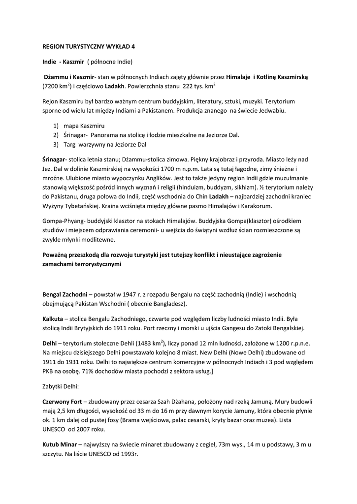 REGION TURYSTYCZNY WYKŁAD 4 Indie - Kaszmir ( północne Indie) Dżammu i Kaszmir- stan w północnych Indiach zajęty głównie przez Himalaje i Kotlinę Kaszmirską (7200 km2) i częściowo Ladakh. Powierzchnia stanu 222 tys. km2 Rejon Kaszmiru był bardzo ważnym centrum buddyjskim, literatury, sztuki, muzyki. Terytorium sporne od wielu lat między Indiami a Pakistanem. Produkcja znanego na świecie Jedwabiu. 1) mapa Kaszmiru 2) Śrinagar- Panorama na stolicę i łodzie mieszkalne na Jeziorze Dal. 3) Targ warzywny na Jeziorze Dal Śrinagar- stolica letnia stanu; Dżammu-stolica zimowa. Piękny krajobraz i przyroda. Miasto leży nad Jez. Dal w dolinie Kaszmirskiej na wysokości 1700 m n.p.m. Lata są tutaj łagodne, zimy śnieżne i mroźne. Ulubione miasto wypoczynku Anglików. Jest to także jedyny region Indii gdzie muzułmanie stanowią większość pośród innych wyznań i religii (hinduizm, buddyzm, sikhizm). ½ terytorium należy do Pakistanu, druga połowa do Indii, część wschodnia do Chin Ladakh – najbardziej zachodni kraniec Wyżyny Tybetańskiej. Kraina wciśnięta między główne pasmo Himalajów i Karakorum. Gompa-Phyang- buddyjski klasztor na stokach Himalajów. Buddyjska Gompa(klasztor) ośrodkiem studiów i miejscem odprawiania ceremonii- u wejścia do świątyni wzdłuż ścian rozmieszczone są zwykle młynki modlitewne. Poważną przeszkodą dla rozwoju turystyki jest tutejszy konflikt i nieustające zagrożenie zamachami terrorystycznymi Bengal Zachodni – powstał w 1947 r. z rozpadu Bengalu na część zachodnią (Indie) i wschodnią obejmującą Pakistan Wschodni ( obecnie Bangladesz). Kalkuta – stolica Bengalu Zachodniego, czwarte pod względem liczby ludności miasto Indii. Była stolicą Indii Brytyjskich do 1911 roku. Port rzeczny i morski u ujścia Gangesu do Zatoki Bengalskiej. Delhi – terytorium stołeczne Dehli (1483 km2), liczy ponad 12 mln ludności, założone w 1200 r.p.n.e. Na miejscu dzisiejszego Delhi powstawało kolejno 8 miast. New Delhi (Nowe Delhi) zbudowane od 1911 do 1931 roku. Delhi to największe centrum komercyjne w północnych Indiach i 3 pod względem PKB na osobę. 71% dochodów miasta pochodzi z sektora usług.] Zabytki Delhi: Czerwony Fort – zbudowany przez cesarza Szah Dżahana, położony nad rzeką Jamuną. Mury budowli mają 2,5 km długości, wysokość od 33 m do 16 m przy dawnym korycie Jamuny, która obecnie płynie ok. 1 km dalej od pustej fosy (Brama wejściowa, pałac cesarski, kryty bazar oraz muzea). Lista UNESCO od 2007 roku. Kutub Minar – najwyższy na świecie minaret zbudowany z cegieł, 73m wys., 14 m u podstawy, 3 m u szczytu. Na liście UNESCO od 1993r. Świątynie Delhi – 82% ludności stanowią Hindusi, kilkanaście procent muzułmanie, buddyści; Dżama Masdżid (Meczet Piątkowy) to największy meczet w Indiach zbudowany przez Szah Dżahana w 1654 roku. Może pomieścić 25 tys. wiernych. W 2005 roku zbudowano z czerwonego piaskowca i marmuru największą świątynię hinduistyczną. Bahaistyczna Świątynia Lotosu. Zbudowana w 1986 r. świątynia Lotosu ma kształt kwiatu składającego się z ponad 20 płatków lotosu (narodowy kwiat Indii). Od czasu wybudowania świątyni odwiedziło ja ponad 50 mln turystów. Wewnątrz świątyni brak jest wszelkich symboli religijnych, w związku z tym każdy, niezależnie od wyznania może się w niej pomodlić. Grobowiec Humayuna – od 1993 roku na liście UNESCO, z czerwonego piaskowca, największy przykład architektury mogolskiej w Delhi Jantar Mantar – obserwatorium astronomiczne wybudowane w 1724 roku, prowadzące obserwacje i pomiary nieboskłonu bez uzycia teleskopu, który w tym czsie był już znany w Europie Tadż Mahal – wzniesiony w Agrze w dawnej stolicy Indii (Agra była stolicą Indii do 1658 r. kiedy przeniesiono stolicę do Delhi) przez cesarza Szah Dżahana w hołdzie dla swojej małżonki, która zmarła przy porodzie 14 dziecka. Jest to mauzoleum miłości, arcydzieło sztuki architektonicznej budownictwa muzułmańskiego epoki Wielkich Mogołów. W środku znajduje się grobowiec, na zewnątrz stoją 4 minarety, odchylone od pionu, tak aby w przypadku trzęsienia ziemi nie uderzyć w mauzoleum. Przy budowie mauzoleum brało udział podobno 20 tys. ludzi. Legenda mówi, że Szah Dżahan rozkazał obciąć dłonie budowniczym mauzoleum aby nie stworzyli już nigdy podobnego dzieła. Prawda jest taka, że do dnia dzisiejszego w konserwacji budowli biorą udział potomkowie budowniczych. Mauzoleum wykonano z białego marmuru, dodatkowo dekorując kamieniami szlachetnymi, z których część została wywieziona przez Anglików. Bangalur –położony w płd. Indiach na Wyż. Dekan na wysokości 911 m n.p.m., nowoczesne miasto, rozwój przemysłu wysokiej techniki, nowoczesne ośrodki lecznicze, wypoczynkowe dla bogatszej ludności Indii Dardżyling- miasto i kurort w Dardżylińskich Himalajach, stanowiących brzeżną część Sikkimskich Himalajów, kulminujących pasmem Kanczendzongi (8580 m n.p.m.). Dardżylińskie Himalaje wznoszą się ostra krawędzią od 200 m do 1000-1800 m n.p.m.. Wyższe grzbiety sięgają 2500-3600 m n.p.m. Średnie temperatury lata sięgają na nizinie 280 C, a w Dardżylingu (2100 m n.p.m.) 16-170 C. Opad roczny waha się od 2000-3000 mm na Nizinie Bengalskiej do 4000-5000 m na krawędzi gór. Opady koncentrują się między majem a wrześniem w związku z napływającymi znad Zatoki Bengalskiej wilgotnymi masami powietrza (monsun letni). Dardżyling (miasto) leży na grzbiecie (2050-2150 m n.p.m.) z widokiem na cały Sikkim (maleńki obszarowo stan w Indiach na granicy Nepalem, Tybetem i Bhutanem) z Kanchendzongą (Kanchenjungą), która można oglądać w promieniach wschodzącego słońca wcześnie rano spod hotelu. Miasto było na początku XIX w. obozem wojskowym i punktem targowym, a po zbudowaniu drogi i kolejki wąskotorowej stało się centrum administracyjnym i ośrodkiem plantacji herbaty,