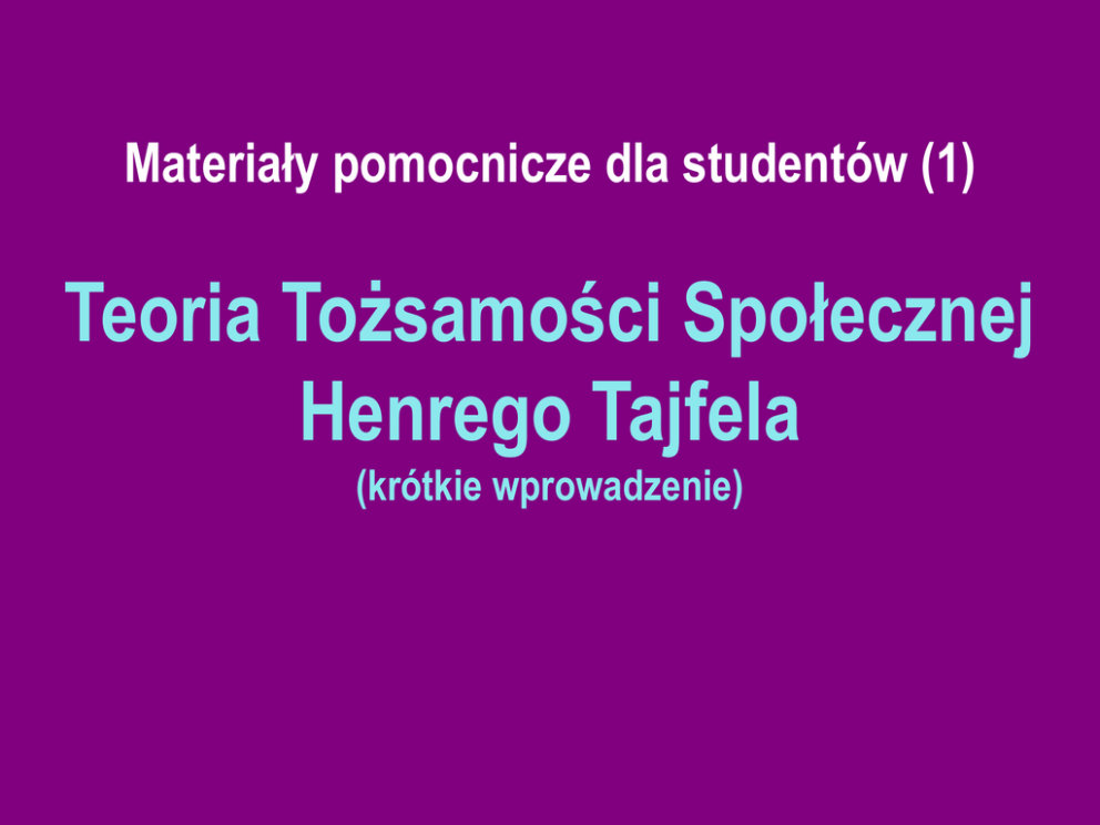 Materiały pomocnicze dla studentów (1) Teoria Tożsamości Społecznej Henrego Tajfela (krótkie wprowadzenie) Henri Tajfel (1922-1982) Psycholog, żydowskiego pochodzenia, urodzony w Polsce (Włocławek). Przed II wojną światową studiował chemię na paryskiej Sorbonie. Okres wojenny spędził w obozach jenieckich. W 1946 rozpoczął studia psychologiczne, początkowe we Francji, a od 1954 w Wielkiej Brytanii. Tutaj zaczął interesować się nową szkołą psychologii społecznej (tzw. „New Look”) badając proces błędów w percepcji. W 1967 został profesorem psychologii społecznej na Uniwersytecie w Bristolu, gdzie pracował do końca swojej naukowej kariery. Tam opracował swój schemat eksperymentalny znany jako minimal group experiments do badań nad uprzedzeniami międzygrupowymi i kategoryzacją społeczną. Wraz z Johnem Turnerem opracował teorię tożsamości społecznej - Social Identity Theory – SIT. Teoria tożsamości społecznej (1) • Tożsamość społeczna to: – nasze przekonania i uczucia wobec własnej grupy, – świadomość przynależności do różnych grup, czyli suma naszych społecznych identyfikacji. • Posiadamy: – tożsamość osobistą - JA – tożsamość społeczną - MY Teoria tożsamości społecznej (1) Dążymy do umacniania poczucia własnej wartości, a drogą do tego jest ugruntowanie pozytywnej tożsamości społecznej, czyli przekonania że MY (nasza grupa) jesteśmy lepsi od NICH (innych grup), np. Małysz wygrał, ale mówimy, że MY wygraliśmy; gdy drużyna siatkarska wygrała z drużyną rosyjską mówiliśmy: wygraliśmy z Rosją. Teoria tożsamości społecznej (2) • Tworzenie się uprzedzeń wobec obcych jest efektem naturalnego i wszechobecnego procesu kategoryzacji społecznej "ja - inni", "my - oni", "swoi - obcy". • Proste, jednowymiarowe i konkretne kategoryzacje są dostępne poznawczo już dla małych dzieci. Prawdopodobnie są to pierwotne procesy prowadzące do tworzenie się nieprzychylnychwrogich postaw wobec grup obcych. Teoria tożsamości społecznej (2) • Proces kategoryzacji nie wynika z konkretnych przesłanek i wiedzy o cudzej i własnej grupie. Małemu dziecku wystarczą narzucone "etykiety" lub pojedyncze, wyraziste kryteria – może je dalej powielać. • Kategoryzacja społeczna utrwala się, gdyż pełni dla jednostek i grup ważne funkcje poznawcze i motywacyjne. Związana jest z przynależnością do własnej grupy, z tożsamością i samooceną osoby. • Jeśli należymy do jakieś grupy czujemy się pewniejsi. Teoria tożsamości społecznej (3) na przykładzie DDA Teoria tożsamości społecznej sugeruje, że dziecko alkoholika funkcjonując na poziomie tożsamości społecznej percypuje siebie i innych w ramach społecznych kategorii - za wszelką cenę będzie dążyć do akcentowania podobieństw między członkami tej samej grupy i różnic między nimi a członkami innych grup. Członkowie grupy nie reagują na siebie i na innych jak na jednostki z indywidualną historią, ale jak na elementy wspólnej charakterystyki grupy. Teoria tożsamości społecznej (3) na przykładzie DDA Podobieństwo stylu życia, wzorów konsumpcyjnych i poglądów, które ma tendencję wzrostową, scala grupę i umiejscawia ją w kontrze do reszty społeczeństwa. Zrzeszona (formalnie lub nieformalnie) grupa DDA, czyni członków „wolnymi” (tu nikt ciebie nie naznaczy), dzięki czemu mogą się realizować przy pełnej akceptacji, wynikającej w dużym stopniu ze świadomości problemu. Jednocześnie jednak stają się od niej zależni i odcięci od reszty. Pojawia się alienacja.