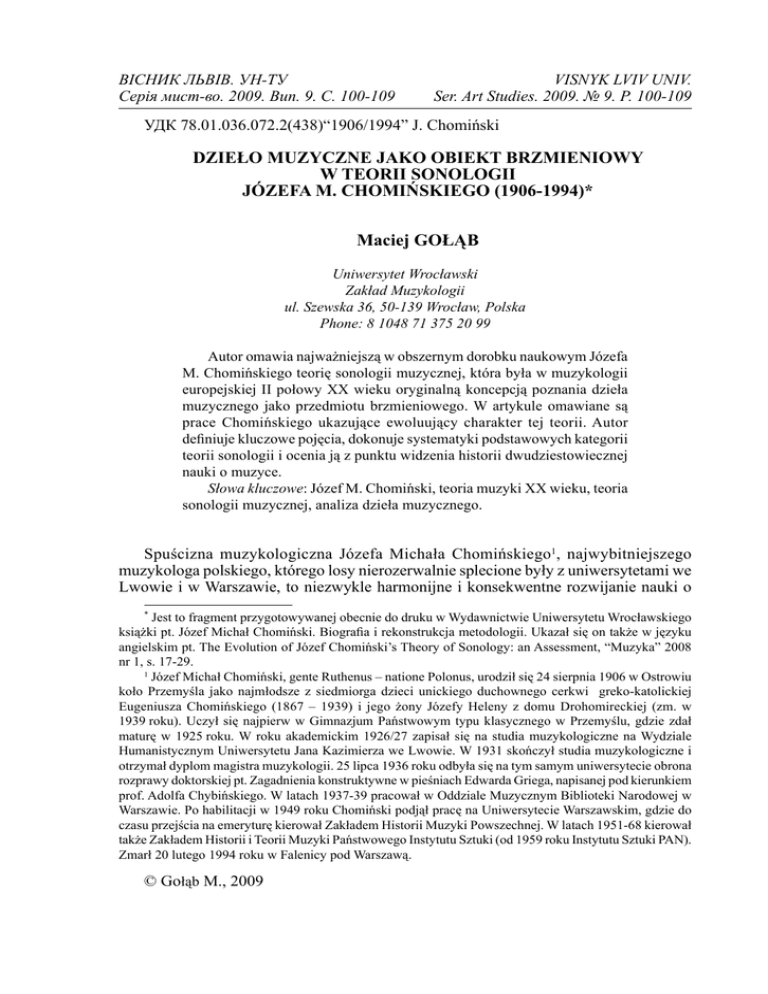 ВІСНИК ЛЬВІВ. УН-ТУ Серія мист-во. 2009. Вип. 9. С. 100-109 VISNYK LVIV UNIV. Ser. Art Studies. 2009. № 9. Р. 100-109 УДК 78.01.036.072.2(438)“1906/1994” J. Chomiński DZIEŁO MUZYCZNE JAKO OBIEKT BRZMIENIOWY W TEORII SONOLOGII JÓZEFA M. CHOMIŃSKIEGO (1906-1994)* Maciej GOŁĄB Uniwersytet Wrocławski Zakład Muzykologii ul. Szewska 36, 50-139 Wrocław, Polska Phone: 8 1048 71 375 20 99 Autor omawia najważniejszą w obszernym dorobku naukowym Józefa M. Chomińskiego teorię sonologii muzycznej, która była w muzykologii europejskiej II połowy XX wieku oryginalną koncepcją poznania dzieła muzycznego jako przedmiotu brzmieniowego. W artykule omawiane są prace Chomińskiego ukazujące ewoluujący charakter tej teorii. Autor definiuje kluczowe pojęcia, dokonuje systematyki podstawowych kategorii teorii sonologii i ocenia ją z punktu widzenia historii dwudziestowiecznej nauki o muzyce. Słowa kluczowe: Józef M. Chomiński, teoria muzyki XX wieku, teoria sonologii muzycznej, analiza dzieła muzycznego. Spuścizna muzykologiczna Józefa Michała Chomińskiego1, najwybitniejszego muzykologa polskiego, którego losy nierozerwalnie splecione były z uniwersytetami we Lwowie i w Warszawie, to niezwykle harmonijne i konsekwentne rozwijanie nauki o * Jest to fragment przygotowywanej obecnie do druku w Wydawnictwie Uniwersytetu Wrocławskiego książki pt. Józef Michał Chomiński. Biografia i rekonstrukcja metodologii. Ukazał się on także w języku angielskim pt. The Evolution of Józef Chomiński’s Theory of Sonology: an Assessment, “Muzyka” 2008 nr 1, s. 17-29. 1 Józef Michał Chomiński, gente Ruthenus – natione Polonus, urodził się 24 sierpnia 1906 w Ostrowiu koło Przemyśla jako najmłodsze z siedmiorga dzieci unickiego duchownego cerkwi greko-katolickiej Eugeniusza Chomińskiego (1867 – 1939) i jego żony Józefy Heleny z domu Drohomireckiej (zm. w 1939 roku). Uczył się najpierw w Gimnazjum Państwowym typu klasycznego w Przemyślu, gdzie zdał maturę w 1925 roku. W roku akademickim 1926/27 zapisał się na studia muzykologiczne na Wydziale Humanistycznym Uniwersytetu Jana Kazimierza we Lwowie. W 1931 skończył studia muzykologiczne i otrzymał dyplom magistra muzykologii. 25 lipca 1936 roku odbyła się na tym samym uniwersytecie obrona rozprawy doktorskiej pt. Zagadnienia konstruktywne w pieśniach Edwarda Griega, napisanej pod kierunkiem prof. Adolfa Chybińskiego. W latach 1937-39 pracował w Oddziale Muzycznym Biblioteki Narodowej w Warszawie. Po habilitacji w 1949 roku Chomiński podjął pracę na Uniwersytecie Warszawskim, gdzie do czasu przejścia na emeryturę kierował Zakładem Historii Muzyki Powszechnej. W latach 1951-68 kierował także Zakładem Historii i Teorii Muzyki Państwowego Instytutu Sztuki (od 1959 roku Instytutu Sztuki PAN). Zmarł 20 lutego 1994 roku w Falenicy pod Warszawą. © Gołąb M., 2009 Dzieło muzyczne jako obiekt brzmieniowy w teorii sonologii... 101 muzyce: najpierw, w latach młodości, w formie nowoczesnych, przejętych z muzykologii niemieckiej wzorów metodologicznych2, na których podstawie uczony ten przyswajał sobie metody nowoczesnej analizy dzieła muzycznego, później, w wieku dojrzałym, w postaci nowatorskich koncepcji poznania dzieła muzycznego, które silnie oddziałały na dyskursy o muzyce w tej przestrzeni kulturowej, z którą wiązał swoje losy jako uczony. W końcu, w wieku późnym, w latach siedemdziesiątych i osiemdziesiątych, dał nam sumę swoich doświadczeń muzykologicznych w formie wielkich podręczników akademickich, stanowiących dziś korpus prac podstawowych z zakresu tak historycznej (historia muzyki powszechnej3 i polskiej4), jak i systematycznej (formy muzyczne5) muzykologii. Historia dyscyplin naukowych, zwłaszcza w humanistyce, to nie tylko sprawa przedmiotowych zainteresowań ich reprezentantów, ale także splot wielu subtelnych uwarunkowań, umożliwiających tworzenie się szkół badawczych wokół postaci wielkich profesorów. Bez wątpienia taką postacią był w dziejach muzykologii polskiej Profesor Józef Chomiński; postacią “mistrza-nauczy¬ciela”, któremu powojenna muzykologia polska w znacznej części zawdzięcza swój dorobek, istotny dla badań muzycznych. Jeśli za granicami krajów Europy Środkowej i Wschodniej muzykologię rosyjską kojarzy się w powszechnym odbiorze z teorią intonacji Borysa Asafjewa, czeską – z muzyczno-semiotycznymi pracami Jaroslava Jiránka, a węgierską – z “muzycznoprzyrodniczymi” koncepcjami Ernö Lendvaia, to z pewnością dla zorientowanego w powojennych dokonaniach muzykologii polskiej najbardziej oryginalną teoretyczną koncepcją będzie – obok estetyki muzyki filmowej Zofii Lissy – teoria sonologii muzycznej. Teoria ta w latach 60-tych była samotnym doświadczeniem muzykologii europejskiej6. Jej znaczenie zdaje się wzrastać z biegiem czasu, podobnie jak w historii kultury przypadki radykalnie nowatorskich przedsięwzięć poznawczych czy artystycznych. Jeśli dziś sonologia jest nadal “flagową” teorią polskiej muzykologii, to stało się to także za sprawą znaczącej recepcji, jaka była jej udziałem, nie tylko w “szkole Chomińskiego”, ale także poza nią. Wszelako nie tylko znajomość tej teorii, ale wręcz świadomość jej istnienia nie była w latach 60-tych i 70-tych w muzykologii światowej powszechna. O ile prace zza “żelaznej kurtyny” wyżej wspomnianych muzykologów rosyjskich, czeskich czy węgierskich publikowane były w językach kongresowych i “eksportowane” na zachód Europy, o tyle sam autor koncepcji sonologicznej nie zabiegał o szersze upowszechnienie tej części własnego dorobku naukowego. Dopiero w 1977 roku ukazało się tłumaczenie jego teorii sonologii na język angielski, zresztą w niskonakładowym i pozbawionym 2 J. M. Chomiński, Preludia [Chopina], “Analizy i Objaśnienia Dzieł Wszystkich Fryderyka Ch