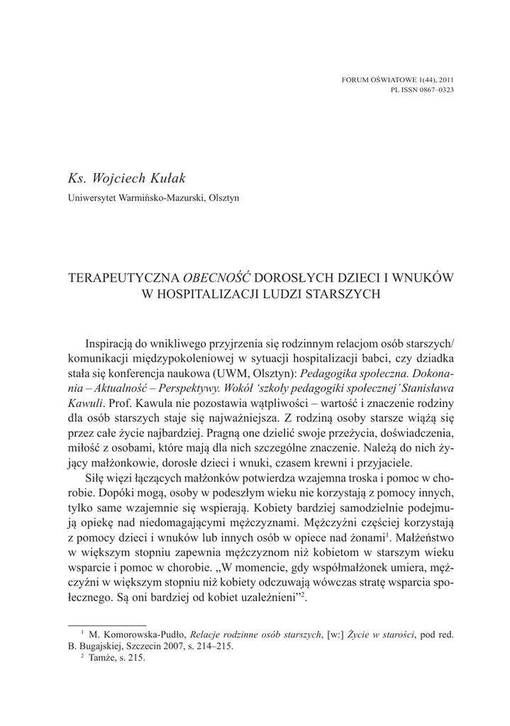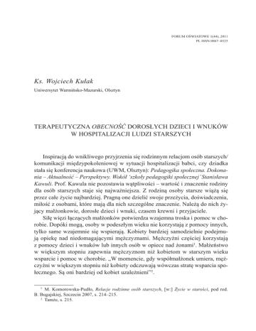 FORUM OŚWIATOWE 1(44), 2011 PL ISSN 0867–0323 Ks. Wojciech Kułak Uniwersytet Warmińsko-Mazurski, Olsztyn Terapeutyczna obecność dorosłych dzieci i wnuków w hospitalizacji ludzi starszych Inspiracją do wnikliwego przyjrzenia się rodzinnym relacjom osób starszych/ komunikacji międzypokoleniowej w sytuacji hospitalizacji babci, czy dziadka stała się konferencja naukowa (UWM, Olsztyn): Pedagogika społeczna. Dokonania – Aktualność – Perspektywy. Wokół ‘szkoły pedagogiki społecznej’ Stanisława Kawuli. Prof. Kawula nie pozostawia wątpliwości – wartość i znaczenie rodziny dla osób starszych staje się najważniejsza. Z rodziną osoby starsze wiążą się przez całe życie najbardziej. Pragną one dzielić swoje przeżycia, doświadczenia, miłość z osobami, które mają dla nich szczególne znaczenie. Należą do nich żyjący małżonkowie, dorosłe dzieci i wnuki, czasem krewni i przyjaciele. Siłę więzi łączących małżonków potwierdza wzajemna troska i pomoc w chorobie. Dopóki mogą, osoby w podeszłym wieku nie korzystają z pomocy innych, tylko same wzajemnie się wspierają. Kobiety bardziej samodzielnie podejmują opiekę nad niedomagającymi mężczyznami. Mężczyźni częściej korzystają z pomocy dzieci i wnuków lub innych osób w opiece nad żonami1. Małżeństwo w większym stopniu zapewnia mężczyznom niż kobietom w starszym wieku wsparcie i pomoc w chorobie. „W momencie, gdy współmałżonek umiera, mężczyźni w większym stopniu niż kobiety odczuwają wówczas stratę wsparcia społecznego. Są oni bardziej od kobiet uzależnieni”2. 1 M. Komorowska-Pudło, Relacje rodzinne osób starszych, [w:] Życie w starości, pod red. B. Bugajskiej, Szczecin 2007, s. 214–215. 2 Tamże, s. 215. 160 Ks. Wojciech Kułak Dla większości starszych ludzi bardzo ważne stają się wówczas więzi międzypokoleniowe/bliskie relacje z własnymi dziećmi i wnukami, na które składają się: – wsparcie, pomoc, opieka, – bliskość emocjonalna, przynależność, poczucie bezpieczeństwa, empatia, miłość3. Społeczne problemy związane z hospitalizacją coraz większej liczby osób w podeszłym wieku, niepokojące zmiany wzajemnych powinności poszczególnych pokoleń, załamanie więzi rodzinnych uwidaczniające się bardzo wyraźnie podczas ich pobytu w szpitalach i innych placówkach lecznictwa zamkniętego, doskonale wpisują się w obszar poszukiwań badawczych pedagogiki społecznej. Niezbędna staje się pogłębiona refleksja nad kondycją polskiej rodziny w kontekście zmian tradycyjnych wzorów rodzinnych i systemu wartości, które spowodowały, że podstawą więzi rodzinnych są najczęściej jedynie więzi emocjonalne, z pominięciem moralnych zobowiązań dzieci/wnuków wobec starzejących się, schorowanych rodziców/dziadków. To, co zdawało się być do tej pory w miarę trwałe, co dla wielu pozostawało stałym odniesieniem, co pozwalało na poczucie afiliacji i bezpieczeństwa młodym i starym, ulega dynamicznej przemianie. I to nie tylko chodzi o zmieniające się granice strukturalne rozmywające dotychczasowe fundamenty oparcia na drodze wzrostu i rozwoju jednostki. Niepokojącym jest, że w konsekwencji zamiast wzmocnienia przynależności do kogoś, do drugiego, do innych, do rodziny, następuje osłabienie wzajemnych więzi, a nawet prowadzi do całkowitego ich zerwania. Nawiązywane szybko i bez zobowiązań przelotne znajomości nie zastępują naturalnej bliskości kochających się osób w rodzinie. Cieszących się pełnią praw, ale i świadomych wzajemności obowiązków. Z wieloletniego doświadczenia (systematycznej jawnej obserwacji) w szpitalu zaobserwowałem, że tradycyjne wartości opiekuńcze przestały być punktem oparcia dla wielu spotykanych rodzin. Jak zauważył L. Kołakowski, nowe pokolenie skłania się ku obyczajowości, „w której nikt nie wierzy, nikomu o nic nie chodzi, byleby życie było zabawne...”4 Nie zdefiniowane do końca teoretycznie dominujące w praktyce idee witalności, skuteczności i konsumpcji ściśle związane z globalnym zachodnioatlantyckim rynkiem popytu/podaży pogłębiają rozdroża pedagogii rodzinnej. Wystarczy wsłuchać się w głosy ponowoczesnych mentorów życia społecznego biadolących na kryzysem finansowo-gospodarczym, czy 3 Słusznie zauważa Bee pisząc, że związki rodzinne są „niezbędnym składnikiem pomocy i opieki nad starszymi ludźmi, są równocześnie pełne fal i zawirowań, żądań i niesprawiedliwości oraz paradoksów, są również źródłem przyjemności” (H. Bee, Psychologia rozwoju człowieka, Poznań 2004, s. 590). 4 L. Kołakowski, Mini wykłady o maxi sprawach, Kraków 1997, s. 41. Terapeutyczna obecność dorosłych dzieci i wnuków w hospitalizacji... 161 nad groźbą totalnej zagłady, jak nie nuklearnej (zagrożenie ze strony tzw. „państw zbójeckich”), to ekologicznej (np. po ociepleniu klimatu), aby doznać zdumienia i zapytać, dlaczego nie sięga się do źródeł zagrożeń, do przyczyn braku wzajemnego zaufania, do kryzysu człowieczeństwa, zaburzonych międzyludzkich relacji, do regresu rodzinnej opieki, do ucieczki od solidarnego współprzeżywania jawiących się słabości/choroby, czy wreszcie rezygnowania z wysiłku asystencji przy śmierci i umieraniu osoby najbliższej5. To, czy dorosłe dzieci i wnuki podejmą dzisiaj wyzwanie terapeutycznej obecności/aktywnej rodzinnej opieki nad swymi starzejącymi się rodzicami i dziadkami przebywającymi w szpitalach, „czy (pozostaną w skórze) ubezwłasnowolnionych nieludzkich stworzeń”6, zależy zarówno od siły ich wzajemnych więzi uczuciowych, zdolności do empatii, a nade wszystko rozumienia odpowiedzialności i trudu osobowego/etosu życia rodzinnego. Stąd pedagogika społeczna uwalnia się od powierzchowności postmodernistycznego myślenia i ucieczki od głębszych wyzwań intelektualnych, odcinając się zarówno od skrajnego e
