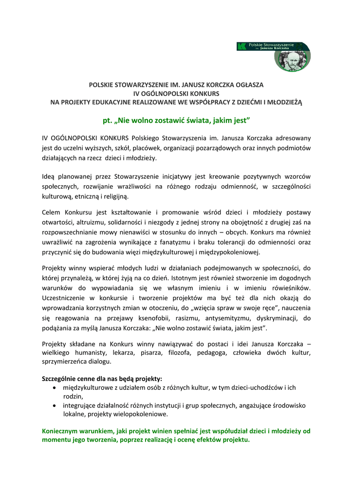 POLSKIE STOWARZYSZENIE IM. JANUSZ KORCZKA OGŁASZA IV OGÓLNOPOLSKI KONKURS NA PROJEKTY EDUKACYJNE REALIZOWANE WE WSPÓŁPRACY Z DZIEĆMI I MŁODZIEŻĄ pt. „Nie wolno zostawić świata, jakim jest” IV OGÓLNOPOLSKI KONKURS Polskiego Stowarzyszenia im. Janusza Korczaka adresowany jest do uczelni wyższych, szkół, placówek, organizacji pozarządowych oraz innych podmiotów działających na rzecz dzieci i młodzieży. Ideą planowanej przez Stowarzyszenie inicjatywy jest kreowanie pozytywnych wzorców społecznych, rozwijanie wrażliwości na różnego rodzaju odmienność, w szczególności kulturową, etniczną i religijną. Celem Konkursu jest kształtowanie i promowanie wśród dzieci i młodzieży postawy otwartości, altruizmu, solidarności i niezgody z jednej strony na obojętność z drugiej zaś na rozpowszechnianie mowy nienawiści w stosunku do innych – obcych. Konkurs ma również uwrażliwić na zagrożenia wynikające z fanatyzmu i braku tolerancji do odmienności oraz przyczynić się do budowania więzi międzykulturowej i międzypokoleniowej. Projekty winny wspierać młodych ludzi w działaniach podejmowanych w społeczności, do której przynależą, w której żyją na co dzień. Istotnym jest również stworzenie im dogodnych warunków do wypowiadania się we własnym imieniu i w imieniu rówieśników. Uczestniczenie w konkursie i tworzenie projektów ma być też dla nich okazją do wprowadzania korzystnych zmian w otoczeniu, do „wzięcia spraw w swoje ręce”, nauczenia się reagowania na przejawy ksenofobii, rasizmu, antysemityzmu, dyskryminacji, do podążania za myślą Janusza Korczaka: „Nie wolno zostawić świata, jakim jest”. Projekty składane na Konkurs winny nawiązywać do postaci i idei Janusza Korczaka – wielkiego humanisty, lekarza, pisarza, filozofa, pedagoga, człowieka dwóch kultur, sprzymierzeńca dialogu. Szczególnie cenne dla nas będą projekty: międzykulturowe z udziałem osób z różnych kultur, w tym dzieci-uchodźców i ich rodzin, integrujące działalność różnych instytucji i grup społecznych, angażujące środowisko lokalne, projekty wielopokoleniowe. Koniecznym warunkiem, jaki projekt winien spełniać jest współudział dzieci i młodzieży od momentu jego tworzenia, poprzez realizację i ocenę efektów projektu. Projekt powinien być zrealizowany w okresie: styczeń – sierpień 2017 roku. Podmiot zgłaszający swój udział w Konkursie może złożyć nie więcej niż dwa wnioski aplikacyjne. Nadesłane projekty będą oceniane przez specjalnie do tego celu powołane Jury. Organizatorzy przewidują również nadanie nagrody dla jednego z projektów wyłonionego drogą plebiscytu przeprowadzonego na stronie internetowej Polskiego Stowarzyszenia im. Janusza Korczaka. Do udziału w plebiscycie projekty zostaną wybrane przez Jury. Polskie Stowarzyszenie im. Janusza Korczaka przyzna nagrody dla laureatów konkursu w postaci dofinansowania do realizacji projektów do 5000 zł. Dotacja nie może przekroczyć 80% kosztów realizacji projektu, tzn. wnioskodawcy muszą zapewnić ze środków własnych (lub z innych źródeł) co najmniej 20% udziału. Wnioski aplikacyjne należy składać do 30 września 2016 roku (liczy się data stempla pocztowego) w 2 egzemplarzach: w formie papierowej na adres korespondencyjny Polskiego Stowarzyszenia im. Janusza Korczaka: ul. Białobrzeska 15/56, 02-370 Warszawa, z dopiskiem: Konkurs na projekty edukacyjne „Nie wolno zostawiać świata takim, jakim jest - 2016” oraz w drugim egzemplarzu w formie elektronicznej na adres e-mail: [email protected]. KONKURS PRZEBIEGA POD HONOROWYM PATRONATEM: Wniosek aplikacyjny Harmonogram Konkursu1 1 Pozostałe dokumenty takie jak: umowa podpisywana z laureatem i wzór sprawozdania, zostaną przekazane podmiotom, które otrzymają dotację.
