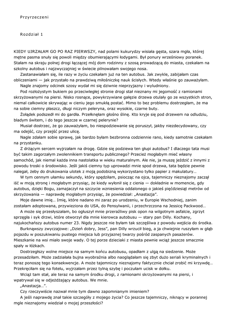 P rz y r z e c z e n i R oz d z i ał 1 KIEDY UJRZAŁAM GO PO RAZ PIERWSZY, nad polami kukurydzy wisiała gęsta, szara mgła, której mętne pasma snuły się powoli między obumierającymi łodygami. Był ponury wrześniowy poranek. Stałam na skraju polnej drogi łączącej mój dom rodzinny z szosą prowadzącą do miasta, czekałam na szkolny autobus i najzwyczajniej w świecie pilnowałam swojego nosa. Zastanawiałam się, ile razy w życiu czekałam już na ten autobus. Jak zwykle, zabijałam czas obliczeniami — jak przystało na prawdziwą miłośniczkę nauk ścisłych. Wtedy właśnie go zauważyłam. Nagle znajomy odcinek szosy wydał mi się dziwnie nieprzyjazny i wyludniony. Pod rozłożystym bukiem po przeciwległej stronie drogi stał nieznany mi jegomość z ramionami skrzyżowanymi na piersi. Nisko rosnące, powykrzywiane gałęzie drzewa otulały go ze wszystkich stron, niemal całkowicie skrywając w cieniu jego smukłą postać. Mimo to bez problemu dostrzegłam, że ma na sobie ciemny płaszcz, długi niczym peleryna, oraz wysokie, czarne buty. Żołądek podszedł mi do gardła. Przełknęłam głośno ślinę. Kto kryje się pod drzewem na odludziu, bladym świtem, i do tego jeszcze w czarnej pelerynie? Musiał dostrzec, że go zauważyłam, bo niespodziewanie się poruszył, jakby niezdecydowany, czy ma odejść, czy przejść przez ulicę. Nagle zdałam sobie sprawę, jak bardzo byłam bezbronna codziennie rano, kiedy samotnie czekałam na przystanku. Z drżącym sercem wyjrzałam na drogę. Gdzie się podziewa ten głupi autobus? I dlaczego tata musi być takim zagorzałym zwolennikiem transportu publicznego? Przecież mogłabym mieć własny samochód, jak niemal każda inna nastolatka w wieku maturalnym. Ale nie, ja muszę jeździć z innymi z powodu troski o środowisko. Jeśli jakiś ciemny typ uprowadzi mnie spod drzewa, tata będzie pewnie nalegał, żeby do drukowania ulotek z moją podobizną wykorzystano tylko papier z makulatury… W tym cennym ułamku sekundy, który spędziłam, psiocząc na ojca, tajemniczy nieznajomy zaczął iść w moją stronę i mogłabym przysiąc, że kiedy wyłonił się z cienia — dokładnie w momencie, gdy autobus, dzięki Bogu, zamajaczył na szczycie wzniesienia oddalonego o jakieś pięćdziesiąt metrów od skrzyżowania — naprawdę mogłabym przysiąc, że powiedział: „Anastazja”. Moje dawne imię… Imię, które nadano mi zaraz po urodzeniu, w Europie Wschodniej, zanim zostałam adoptowana, przywieziona do USA, do Pensylwanii, i przechrzczona na Jessicę Packwood… A może się przesłyszałam, bo ogłuszył mnie przeraźliwy pisk opon na wilgotnym asfalcie, zgrzyt sprzęgła i syk drzwi, które otworzył dla mnie kierowca autobusu — stary pan Dilly. Kochany, najukochańszy autobus numer 23. Nigdy jeszcze nie byłam tak szczęśliwa z powodu wejścia do środka. Burknąwszy zwyczajowe: „Dzień dobry, Jess”, pan Dilly wrzucił bieg, a ja chwiejnie ruszyłam w głąb pojazdu w poszukiwaniu pustego miejsca lub przyjaznej twarzy pośród zaspanych pasażerów. Mieszkanie na wsi miało swoje wady. O tej porze dzieciaki z miasta pewnie wciąż jeszcze smacznie spały w łóżkach. Dostrzegłszy wolne miejsce na samym końcu autobusu, opadłam z ulgą na siedzenie. Może przesadziłam. Może zadziałała bujna wyobraźnia albo naoglądałam się zbyt dużo seriali kryminalnych i teraz ponoszę tego konsekwencje. A może tajemniczy nieznajomy faktycznie chciał zrobić mi krzywdę… Przekręciłam się na fotelu, wyjrzałam przez tylną szybę i poczułam ucisk w dołku. Wciąż tam stał, ale teraz na samym środku drogi, z ramionami skrzyżowanymi na piersi, i wpatrywał się w odjeżdżający autobus. We mnie. „Anastazja…”. Czy rzeczywiście nazwał mnie tym dawno zapomnianym imieniem? A jeśli naprawdę znał takie szczegóły z mojego życia? Co jeszcze tajemniczy, niknący w porannej mgle nieznajomy wiedział o mojej przeszłości? A przede wszystkim, czego ode mnie chciał? (…) Rozdział 5 RODZICE NIE MIELI JEDNAK OKAZJI niczego mi wyjaśnić. Kiedy dotarłyśmy do domu, tata był jeszcze w połowie zajęć z jogi tantrycznej dla nadpobudliwych seksualnie, podstarzałych hippisów, które prowadził w studiu na tyłach domu, więc mama odesłała mnie do codziennych obowiązków. A potem Lucjusz przyszedł za wcześnie na kolację. Byłam właśnie w stajni i przewracałam słomę w boksach, gdy kątem oka dostrzegłam cień na otwartych drewnianych drzwiach. — Kto tam?! — zawołałam, wciąż jeszcze podenerwowana wydarzeniami dzisiejszego dnia. Kiedy nie doczekałam się odpowiedzi, ogarnęło mnie złe przeczucie, że to nasz dzisiejszy gość nawiedza mnie w stajni. „Przecież mama go zaprosiła” — upomniałam się w myślach, a wysoki Europejczyk z wymiany międzynarodowej istotnie przeszedł przez ujeżdżalnię. „On nie może być aż tak niebezpieczny” — przekonywałam samą siebie. Pomimo aprobaty mamy na wszelki wypadek postanowiłam nie wypuszczać z rąk wideł. — Co tu robisz? — zapytałam, kiedy się zbliżył. — Cóż za maniery — burknął Lucjusz z niezadowoleniem przemądrzałym tonem, wzbijając każdym długim krokiem niewielkie obłoczki kurzu. Zatrzymał się ledwie metr ode mnie i znów poraził mnie jego wysoki wzrost. — Damy nie krzyczą wniebogłosy w stajniach — ciągnął potępiający wywód. — No i cóż to za powitanie? Albo się przesłyszałam, albo prześladowca chciał uczyć mnie etykiety? — Zapytałam, co tu robisz. — Zacisnęłam mocniej dłoń na rękojeści wideł. — Przyszedłem, żeby się z tobą zapoznać, to oczywiste — odparł, taksując mnie wzrokiem. Właściwie krążył wokół mnie, przyglądając się uważnie mojemu ubraniu. Odwróciłam się, żeby mieć go na oku, i zobaczyłam, że marszczy nos. — Na pewno ty też nie możesz się doczekać, by mnie poznać — dodał. Niezupełnie… Nie miałam