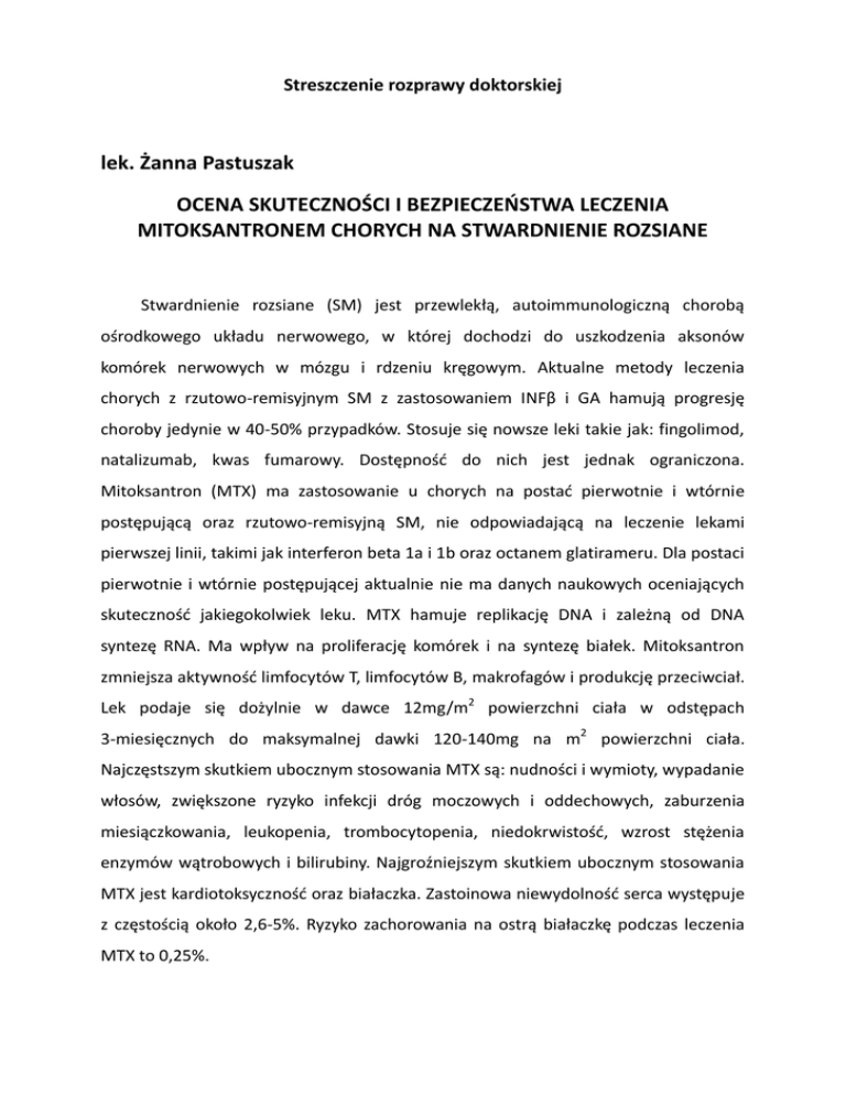 Streszczenie rozprawy doktorskiej lek. Żanna Pastuszak OCENA SKUTECZNOŚCI I BEZPIECZEŃSTWA LECZENIA MITOKSANTRONEM CHORYCH NA STWARDNIENIE ROZSIANE Stwardnienie rozsiane (SM) jest przewlekłą, autoimmunologiczną chorobą ośrodkowego układu nerwowego, w której dochodzi do uszkodzenia aksonów komórek nerwowych w mózgu i rdzeniu kręgowym. Aktualne metody leczenia chorych z rzutowo-remisyjnym SM z zastosowaniem INFβ i GA hamują progresję choroby jedynie w 40-50% przypadków. Stosuje się nowsze leki takie jak: fingolimod, natalizumab, kwas fumarowy. Dostępność do nich jest jednak ograniczona. Mitoksantron (MTX) ma zastosowanie u chorych na postać pierwotnie i wtórnie postępującą oraz rzutowo-remisyjną SM, nie odpowiadającą na leczenie lekami pierwszej linii, takimi jak interferon beta 1a i 1b oraz octanem glatirameru. Dla postaci pierwotnie i wtórnie postępującej aktualnie nie ma danych naukowych oceniających skuteczność jakiegokolwiek leku. MTX hamuje replikację DNA i zależną od DNA syntezę RNA. Ma wpływ na proliferację komórek i na syntezę białek. Mitoksantron zmniejsza aktywność limfocytów T, limfocytów B, makrofagów i produkcję przeciwciał. Lek podaje się dożylnie w dawce 12mg/m2 powierzchni ciała w odstępach 3-miesięcznych do maksymalnej dawki 120-140mg na m2 powierzchni ciała. Najczęstszym skutkiem ubocznym stosowania MTX są: nudności i wymioty, wypadanie włosów, zwiększone ryzyko infekcji dróg moczowych i oddechowych, zaburzenia miesiączkowania, leukopenia, trombocytopenia, niedokrwistość, wzrost stężenia enzymów wątrobowych i bilirubiny. Najgroźniejszym skutkiem ubocznym stosowania MTX jest kardiotoksyczność oraz białaczka. Zastoinowa niewydolność serca występuje z częstością około 2,6-5%. Ryzyko zachorowania na ostrą białaczkę podczas leczenia MTX to 0,25%. Celem głównym pracy jest ocena skuteczności i bezpieczeństwa leczenia mitoksantronem chorych z postacią rzutowo-remisyjną SM, u których leczenie INFβ i GA okazało się nieskuteczne (nie hamowało postępu choroby) oraz u chorych, u których stan neurologiczny pogorszył się w postaci pierwotnie i wtórnie postępującej. W badaniu wzięły udział 72 osoby chore na stwardnienie rozsiane w wieku od 25 do 63 lat leczone Mitoksantronem w Klinice Neurologicznej WIM w okresie od 2002 do 2014 roku. Wśród badanych było 72% kobiet oraz 28% mężczyzn. U wszystkich chorych SM zdiagnozowano na podstawie kryteriów Mc Donalda z 2001 roku. Grupę kontrolną stanowiło 60 osób z SM rozpoznanym na podstawie kryteriów Mc Donalda z 2001 roku w wieku od 19 do 65 lat nie leczonych immunomodulująco. Chorym podawano mitoksantron w powolnym (powyżej 1 h), dożylnym wlewie w dawce 12 mg na metr kwadratowy powierzchni ciała (do maksymalnej dawki 140mg/m2) co 3 miesiące. Przed każdym wlewem oceniano funkcjonowanie mięśnia sercowego w badaniu ECHO 2D i oceniano wartość frakcji wyrzutowej. Wykonywano morfologię celem oceny ilości czerwonych, białych krwinek oraz płytek przed każdym podaniem leku. Stan chorych oceniano w ogólnym badaniu przedmiotowym i podmiotowym oraz w badaniu neurologicznym. Progresję choroby oceniano przy użyciu poszerzonej skali oceny stanu niepełnosprawności (EDSS) oraz rocznego wskaźnika rzutowego (liczba rzutów w ciągu roku). W grupie 72 osób chorych na SM leczonych mitoksantronem skutki uboczne leczenia wystąpiły u 17 osób (24%). W przypadku 55 osób nie odnotowano pogorszenia samopoczucia po podaniu leku (76%). Najczęstszymi objawami były nudności (19,5%), ogólne osłabienie (17%), leukopenia (14,6%), ból głowy (12,2%), objawy dyzuryczne (9,7%), wypadanie włosów (7,3%), zawroty głowy (7,3%), ból brzucha (4,8%), półpasiec (4,8%), zaburzenia miesiączkowania (2,4%). Leukopenia była przyczyną przerwania leczenia u sześciu chorych. W przypadku 4 osób zaprzestano podawania leku z powodu przewlekającej się infekcji dróg moczowych. U jednej osoby przerwano leczenie z powodu nasilonych zmian skórnych o charakterze półpaśca. Cztery osoby zrezygnowały z leczenia, gdyż zakwalifikowały się do terapii innym lekiem (Natalizumabem lub Fingolimodem). U sześciu osób podawanie MTX przerwano z powodu progresji choroby. Jedna osoba nie wyraziła zgody na dalsze podawanie mitoksantronu z powodu nasilonych nudności, wymiotów. Nie odnotowano w badanej grupie żadnego przypadku zgonu w trakcie przyjmowania mitoksantronu. Nie wykazano także zależności pomiędzy rodzajem pierwszych objawów SM, postacią kliniczną i czasem trwania choroby a częstością występowania działań niepożądanych leczenia mitoksantronem. Badanie wykazało także, iż wystąpienie działań niepożądanych leczenia mitoksantronem nie zależało od łącznej dawki leku zastosowanej w terapii. Nie wykazano istotnego statystycznie obniżenia frakcji wyrzutowej lewej komory serca w czasie leczenia mitoksantronem. Nie odnotowano w badanej grupie żadnego przypadku ciężkiego uszkodzenia mięśnia sercowego, objawiającego się znacznym obniżeniem frakcji wyrzutowej lewej komory serca w badaniu ECHO 2D lub objawami niewydolności krążenia w badaniu przedmiotowym. Wyniki przeprowadzonych badań wykazały, że ryzyko uszkodzenia mięśnia sercowego w trakcie monoterapii mitoksantronem u chorych na SM, nie obciążonych kardiologicznie, z prawidłowym wynikiem wstępnego badania echokardiograficznego jest znikome. Należy więc rozważyć celowość wykonywania tego badania w trakcie leczenia mitoksantronem u chorych nieobciążonych kardiologicznie. Dalszych badań wymaga ocena długoterminowego wpływu mitoksantronu na mięsień sercowy. Analiza statystyczna wykazała, że leczenie mitoksantronem powodowało spadek średniej liczby białych krwinek w surowicy chorych na SM leczonych MTX w stosunku do wartości sprzed leczenia, aczkolwiek zależność ta nie była znamienna statystycznie. Nie wykazano zależności pomiędzy 