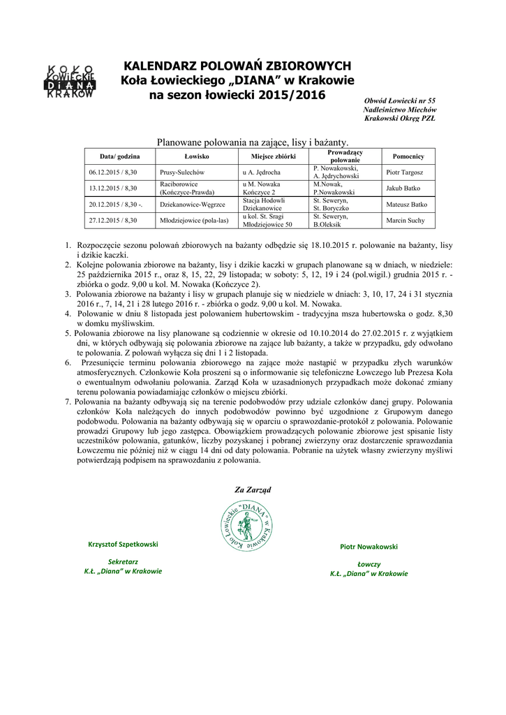 KALENDARZ POLOWAŃ ZBIOROWYCH Koła Łowieckiego „DIANA” w Krakowie na sezon łowiecki 2015/2016 Obwód Łowiecki nr 55 Nadleśnictwo Miechów Krakowski Okręg PZŁ Planowane polowania na zające, lisy i bażanty. Łowisko Data/ godzina Miejsce zbiórki 06.12.2015 / 8,30 Prusy-Sulechów u A. Jędrocha 13.12.2015 / 8,30 Raciborowice (Kończyce-Prawda) 20.12.2015 / 8,30 -. Dziekanowice-Węgrzce 27.12.2015 / 8,30 Młodziejowice (pola-las) u M. Nowaka Kończyce 2 Stacja Hodowli Dziekanowice u kol. St. Sragi Młodziejowice 50 Prowadzący polowanie P. Nowakowski, A. Jędrychowski M.Nowak, P.Nowakowski St. Seweryn, St. Boryczko St. Seweryn, B.Oleksik Pomocnicy Piotr Targosz Jakub Batko Mateusz Batko Marcin Suchy 1. Rozpoczęcie sezonu polowań zbiorowych na bażanty odbędzie się 18.10.2015 r. polowanie na bażanty, lisy i dzikie kaczki. 2. Kolejne polowania zbiorowe na bażanty, lisy i dzikie kaczki w grupach planowane są w dniach, w niedziele: 25 października 2015 r., oraz 8, 15, 22, 29 listopada; w soboty: 5, 12, 19 i 24 (pol.wigil.) grudnia 2015 r. zbiórka o godz. 9,00 u kol. M. Nowaka (Kończyce 2). 3. Polowania zbiorowe na bażanty i lisy w grupach planuje się w niedziele w dniach: 3, 10, 17, 24 i 31 stycznia 2016 r., 7, 14, 21 i 28 lutego 2016 r. - zbiórka o godz. 9,00 u kol. M. Nowaka. 4. Polowanie w dniu 8 listopada jest polowaniem hubertowskim - tradycyjna msza hubertowska o godz. 8,30 w domku myśliwskim. 5. Polowania zbiorowe na lisy planowane są codziennie w okresie od 10.10.2014 do 27.02.2015 r. z wyjątkiem dni, w których odbywają się polowania zbiorowe na zające lub bażanty, a także w przypadku, gdy odwołano te polowania. Z polowań wyłącza się dni 1 i 2 listopada. 6. Przesunięcie terminu polowania zbiorowego na zające może nastąpić w przypadku złych warunków atmosferycznych. Członkowie Koła proszeni są o informowanie się telefoniczne Łowczego lub Prezesa Koła o ewentualnym odwołaniu polowania. Zarząd Koła w uzasadnionych przypadkach może dokonać zmiany terenu polowania powiadamiając członków o miejscu zbiórki. 7. Polowania na bażanty odbywają się na terenie podobwodów przy udziale członków danej grupy. Polowania członków Koła należących do innych podobwodów powinno być uzgodnione z Grupowym danego podobwodu. Polowania na bażanty odbywają się w oparciu o sprawozdanie-protokół z polowania. Polowanie prowadzi Grupowy lub jego zastępca. Obowiązkiem prowadzących polowanie zbiorowe jest spisanie listy uczestników polowania, gatunków, liczby pozyskanej i pobranej zwierzyny oraz dostarczenie sprawozdania Łowczemu nie później niż w ciągu 14 dni od daty polowania. Pobranie na użytek własny zwierzyny myśliwi potwierdzają podpisem na sprawozdaniu z polowania. Za Zarząd Krzysztof Szpetkowski Piotr Nowakowski Sekretarz K.Ł. „Diana” w Krakowie Łowczy K.Ł. „Diana” w Krakowie