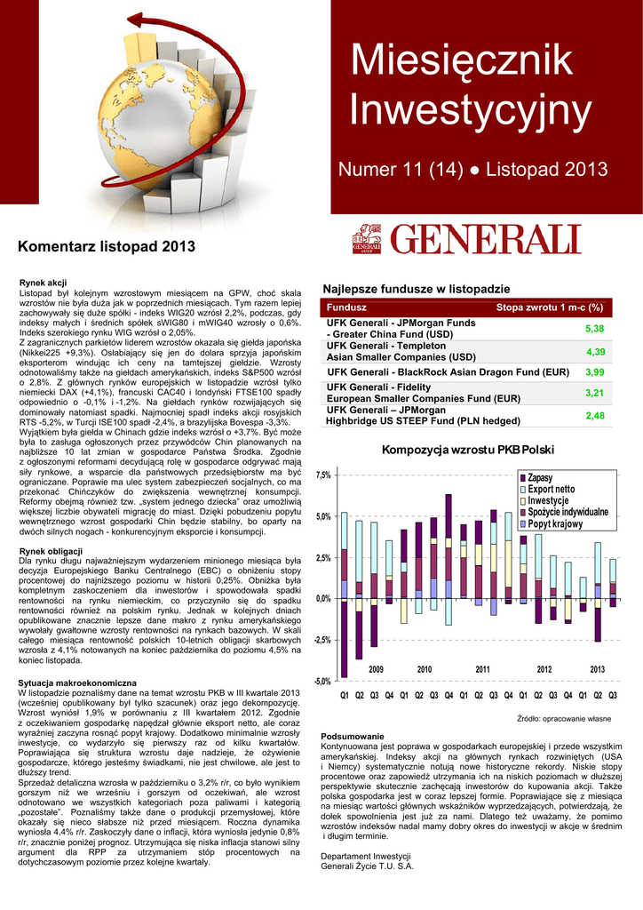 Miesięcznik Inwestycyjny Numer 11 (14) ● Listopad 2013 Komentarz listopad 2013 Rynek akcji Listopad był kolejnym wzrostowym miesiącem na GPW, choć skala wzrostów nie była duża jak w poprzednich miesiącach. Tym razem lepiej zachowywały się duże spółki - indeks WIG20 wzrósł 2,2%, podczas, gdy indeksy małych i średnich spółek sWIG80 i mWIG40 wzrosły o 0,6%. Indeks szerokiego rynku WIG wzrósł o 2,05%. Z zagranicznych parkietów liderem wzrostów okazała się giełda japońska (Nikkei225 +9,3%). Osłabiający się jen do dolara sprzyja japońskim eksporterom windując ich ceny na tamtejszej giełdzie. Wzrosty odnotowaliśmy także na giełdach amerykańskich, indeks S&P500 wzrósł o 2,8%. Z głównych rynków europejskich w listopadzie wzrósł tylko niemiecki DAX (+4,1%), francuski CAC40 i londyński FTSE100 spadły odpowiednio o -0,1% i -1,2%. Na giełdach rynków rozwijających się dominowały natomiast spadki. Najmocniej spadł indeks akcji rosyjskich RTS -5,2%, w Turcji ISE100 spadł -2,4%, a brazylijska Bovespa -3,3%. Wyjątkiem była giełda w Chinach gdzie indeks wzrósł o +3,7%. Być może była to zasługa ogłoszonych przez przywódców Chin planowanych na najbliższe 10 lat zmian w gospodarce Państwa Środka. Zgodnie z ogłoszonymi reformami decydującą rolę w gospodarce odgrywać mają siły rynkowe, a wsparcie dla państwowych przedsiębiorstw ma być ograniczane. Poprawie ma ulec system zabezpieczeń socjalnych, co ma przekonać Chińczyków do zwiększenia wewnętrznej konsumpcji. Reformy obejmą również tzw. „system jednego dziecka” oraz umożliwią większej liczbie obywateli migrację do miast. Dzięki pobudzeniu popytu wewnętrznego wzrost gospodarki Chin będzie stabilny, bo oparty na dwóch silnych nogach - konkurencyjnym eksporcie i konsumpcji. Rynek obligacji Dla rynku długu najważniejszym wydarzeniem minionego miesiąca była decyzja Europejskiego Banku Centralnego (EBC) o obniżeniu stopy procentowej do najniższego poziomu w historii 0,25%. Obniżka była kompletnym zaskoczeniem dla inwestorów i spowodowała spadki rentowności na rynku niemieckim, co przyczyniło się do spadku rentowności również na polskim rynku. Jednak w kolejnych dniach opublikowane znacznie lepsze dane makro z rynku amerykańskiego wywołały gwałtowne wzrosty rentowności na rynkach bazowych. W skali całego miesiąca rentowność polskich 10-letnich obligacji skarbowych wzrosła z 4,1% notowanych na koniec października do poziomu 4,5% na koniec listopada. Sytuacja makroekonomiczna W listopadzie poznaliśmy dane na temat wzrostu PKB w III kwartale 2013 (wcześniej opublikowany był tylko szacunek) oraz jego dekompozycję. Wzrost wyniósł 1,9% w porównaniu z III kwartałem 2012. Zgodnie z oczekiwaniem gospodarkę napędzał głównie eksport netto, ale coraz wyraźniej zaczyna rosnąć popyt krajowy. Dodatkowo minimalnie wzrosły inwestycje, co wydarzyło się pierwszy raz od kilku kwartałów. Poprawiająca się struktura wzrostu daje nadzieje, że ożywienie gospodarcze, którego jesteśmy świadkami, nie jest chwilowe, ale jest to dłuższy trend. Sprzedaż detaliczna wzrosła w październiku o 3,2% r/r, co było wynikiem gorszym niż we wrześniu i gorszym od oczekiwań, ale wzrost odnotowano we wszystkich kategoriach poza paliwami i kategorią „pozostałe”. Poznaliśmy także dane o produkcji przemysłowej, które okazały się nieco słabsze niż przed miesiącem. Roczna dynamika wyniosła 4,4% r/r. Zaskoczyły dane o inflacji, która wyniosła jedynie 0,8% r/r, znacznie poniżej prognoz. Utrzymująca się niska inflacja stanowi silny argument dla RPP za utrzymaniem stóp procentowych na dotychczasowym poziomie przez kolejne kwartały. Najlepsze fundusze w listopadzie Fundusz Stopa zwrotu 1 m-c (%) UFK Generali - JPMorgan Funds - Greater China Fund (USD) UFK Generali - Templeton Asian Smaller Companies (USD) 5,38 4,39 UFK Generali - BlackRock Asian Dragon Fund (EUR) UFK Generali - Fidelity European Smaller Companies Fund (EUR) UFK Generali – JPMorgan Highbridge US STEEP Fund (PLN hedged) 3,99 3,21 2,48 Kompozycja wzrostu PKB Polski 7,5% Zapasy Export netto Inwestycje Spożycie indywidualne Popyt krajowy 5,0% 2,5% 0,0% -2,5% 2009 2010 2011 2012 2013 -5,0% Q1 Q2 Q3 Q4 Q1 Q2 Q3 Q4 Q1 Q2 Q3 Q4 Q1 Q2 Q3 Q4 Q1 Q2 Q3 Źródło: opracowanie własne Podsumowanie Kontynuowana jest poprawa w gospodarkach europejskiej i przede wszystkim amerykańskiej. Indeksy akcji na głównych rynkach rozwiniętych (USA i Niemcy) systematycznie notują nowe historyczne rekordy. Niskie stopy procentowe oraz zapowiedź utrzymania ich na niskich poziomach w dłuższej perspektywie skutecznie zachęcają inwestorów do kupowania akcji. Także polska gospodarka jest w coraz lepszej formie. Poprawiające się z miesiąca na miesiąc wartości głównych wskaźników wyprzedzających, potwierdzają, że dołek spowolnienia jest już za nami. Dlatego też uważamy, że pomimo wzrostów indeksów nadal mamy dobry okres do inwestycji w akcje w średnim i długim terminie. Departament Inwestycji Generali Życie T.U. S.A. Najpopularniejsze UFK - wybór Klientów Generali w listopadzie 2013 (lista wyników ubezpieczeniowych funduszy kapitałowych dostępna jest na http://www.generali.pl/klienci-indywidualni/inw-i-ochrona/notowania) UFK Generali Akcyjne UFK Generali Mieszane UFK Generali Bezpieczne (% całości aktywów) (% całości aktywów) (% całości aktywów) 9,00% 9% 8% 8% 8% 7% 7% 7% 6% 6% 5% 5% 6% 5% 4,80%4,80%4,60% 3,50% 4% 3,60% 4% 3% 3% 2% 2% 1% 1% 0% 0% 7,20% 6,80% 5,20% 4,90% 4,40% 4% 2,20% 2,10% 2,10% 1,80% 3% 2% 1% 0% Legg Mason Akcji Generali Global Absolute Return Fund Legg Mason Pieniężny Generali Agresywny PLUS Noble Mieszany Arka BZ WBK Obligacji Skarbowych Noble Fund Akcji Małych i Średnich Spółek Portfel Polski Specjalistyczny Templeton Global Total Return Fund (USD) Noble Akcji Mieszany PLUS Generali Gwarantowany PLUS Portfel Polski Akcyjny Por