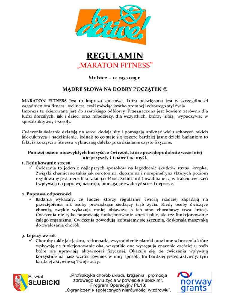 e REGULAMIN „MARATON FITNESS” Słubice – 12.09.2015 r. MĄDRE SŁOWA NA DOBRY POCZĄTEK MARATON FITNESS Jest to impreza sportowa, która poświęcona jest w szczególności zagadnieniom fitness i wellness, czyli mówiąc krótko promocji zdrowego styl życia. Impreza ta skierowana jest do szerokiego odbiorcy. Przeznaczona jest bowiem zarówno dla ludzi dorosłych, jak i dzieci oraz młodzieży, dla wszystkich, którzy lubią wypoczywać w sposób aktywny i wesoły. Ćwiczenia świetnie działają na serce, dodają siły i pomagają uniknąć wielu schorzeń takich jak cukrzyca i nadciśnienie. Jednak to co staje się jeszcze bardziej jasne dzięki badaniom to fakt, iż korzyści z fitnessu wykraczają daleko poza działanie czysto fizyczne. Poniżej osiem niezwykłych korzyści z ćwiczeń, które prawdopodobnie wcześniej nie przyszły Ci nawet na myśl. 1. Redukowanie stresu Ćwiczenia to jeden z najlepszych sposobów na łagodzenie skutków stresu, kropka. Związki chemiczne takie jak serotonina, dopamina i norepinefryna (których poziom regulowany jest przez leki takie jak Paxil, Zoloft, itd.) uwalniane są w trakcie ćwiczeń i wpływają na poprawę nastroju, pomagając zwalczyć stres i depresję. 2. Poprawa odporności Badania wykazały, że ludzie którzy regularnie ćwiczą rzadziej zapadają na przeziębienia niż osoby prowadzące siedzący tryb życia. Kiedy osoby ćwiczące chorują, zwykle wykazują mniej objawów, a ich stan chorobowy trwa krócej. Ćwiczenia nie tylko poprawiają funkcjonowanie serca i płuc, ale też funkcjonowanie całego organizmu. Ćwiczenia powodują, że stajemy się szczupłą, doskonałą maszynką do zwalczania chorób. 3. Lepszy wzrok Choroby takie jak jaskra, retinopatia, zwyrodnienie plamki oraz inne schorzenia które wpływają na funkcjonowanie oka, wszystkie one występują znacznie częściej u osób które nie uprawiają aktywności fizycznej. Okazuje się, że ćwiczenia wpływają korzystnie na nasz wzrok również w inny sposób. Im bardziej jesteś aktywny, tym bardziej aktywne są Twoje oczy. „Profilaktyka chorób układu krążenia i promocja zdrowego stylu życia w powiecie słubickim”, Program Operacyjny PL13: „Ograniczenie społecznych nierówności w zdrowiu”. 4. Usprawniony proces uczenia się Ćwiczenia powodują, że nasze ciało zaczyna uwalniać czynnik wzrostu który nie tylko pomaga budować mięśnie, ale także wspomaga neurony w mózgu w tworzeniu połączeń niezbędnych w procesie uczenia się. Im bardziej skomplikowane jest dane ćwiczenie (na przykład taniec w porównaniu do biegania), tym bardziej jest ono korzystne dla naszego uczenia się. 5. Poprawa oceny własnej wartości Ćwiczenia poprawiają wizerunek całego ciała w sposób który nie ma nic wspólnego z utratą wagi, rzeźbą mięśni czy sylwetką. Osoby które regularnie trenują po prostu czują się lepiej w swojej skórze. 6. Lepszy stan zębów Ćwiczenia pomagają spalić nadmierną ilość węglowodanów, łagodzą stany zapalne i wspomagają krążenie. Wszystkie te czynniki przyczyniają się do polepszenia stanu zębów. 7. Lepsze przyjaźnie Osoby które umieszczają swój trening na wysokiej pozycji na swojej liście rzeczy do zrobienia to zwykle z większym prawdopodobieństwem osoby na których przyjaciele i rodzina może polegać w potrzebie. Nie jest jasne dlaczego tak się dzieje, ale badania sugerują że lepszy nastrój i energia zyskana dzięki ćwiczeniom ułatwia ludziom oferowanie pomocy i okazywanie życzliwości w kontaktach z przyjaciółmi. 8. Zapobieganie chorobie Alzheimera Ośrodek Badań nad Chorobą Alzheimera twierdzi, że ćwiczenia stanowią jeden z najlepszym mechanizmów obronnych przeciw demencji. Aktywność fizyczna chroni hipokamp – część mózgu odpowiedzialną za tworzenie wspomnień i nawigację przestrzenną. Niezliczone korzyści z fitnessu Korzyści z fitnessu są niezliczone dla tych, którzy się w nie angażują. Możesz poprawić swój nastrój, stan zdrowia, wytrzymałość oraz życie towarzyskie, a to wszystko tylko dzięki trenowaniu przez 30 minut parę razy w tygodniu. Mała inwestycja w ćwiczenia zwraca się wielokrotnie przez długi czas, zatem nie czekaj i już dziś zacznij się ruszać. MY PROPONUJEMY TO WSZYSTKO W JEDNEJ PIGUŁCE UWAGA…… STARTUJEMY!!!! REGULAMIN (ten właściwy ) „Profilaktyka chorób układu krążenia i promocja zdrowego stylu życia w powiecie słubickim”, Program Operacyjny PL13: „Ograniczenie społecznych nierówności w zdrowiu”. 1. GŁÓWNE CELE: aktywizacja środowiska sportowego powiatu słubickiego; popularyzacja różnych form zajęć Fitness wśród dzieci i młodzieży szkolnej, studentów „CP” i „Viadrina”, dorosłych mieszkańców powiatu słubickiego, partnerskiego Frankfurtu/O; upowszechnianie zajęć fitness jako formy aktywności ruchowej; upowszechnianie kultury fizycznej jako promocji zdrowego stylu życia; promocja SOSiR i Powiatu Słubickiego; 2. MIEJSCE I TERMIN: Słubice, ul. Sportowa 1, 69 – 100 Słubice; Maraton odbędzie się na boisku głównym Stadionu SOSiR 12 września 2015 roku (sobota) 3. ORGANIZATORZY I WSPÓŁORGANIZATORZY ZAWODÓW: Honorowy patronat Starosta Słubicki; Burmistrz Słubic, Organizator: Słubicki Ośrodek Sportu i Rekreacji w Słubicach. www: sosirslubice.pl Współorganizator : organizacje pozarządowe Powiatu Słubickiego; jednostki sportowe z terenu Powiatu Słubickiego; 4. PROGRAM MARATONU: 8.30- 10.00 10.15 10:30- 11:40 11:45- 12:20 ` 12:25- 13:25 13:30- 14:25 14.30- 15.25 15.30- 16.00 ok. 16.15 Rejestracja uczestników(czek) uroczyste otwarcie Maratonu MOVE YOUR BODY- Instruktorki z klubu fitness "Body&Soul": Izabela Smolska, Anna Karpińska- Rapcewicz i Magdalena Góra - Rozgrzewka + Zajęcia fitness na bazie prostej choreografii oraz ćwiczeń wzmacniających i rzeźbiących sylwetkę. Trening spalający tkankę tłuszczową, pozwalający uzyskać jędrne i zgrabne ciało. 