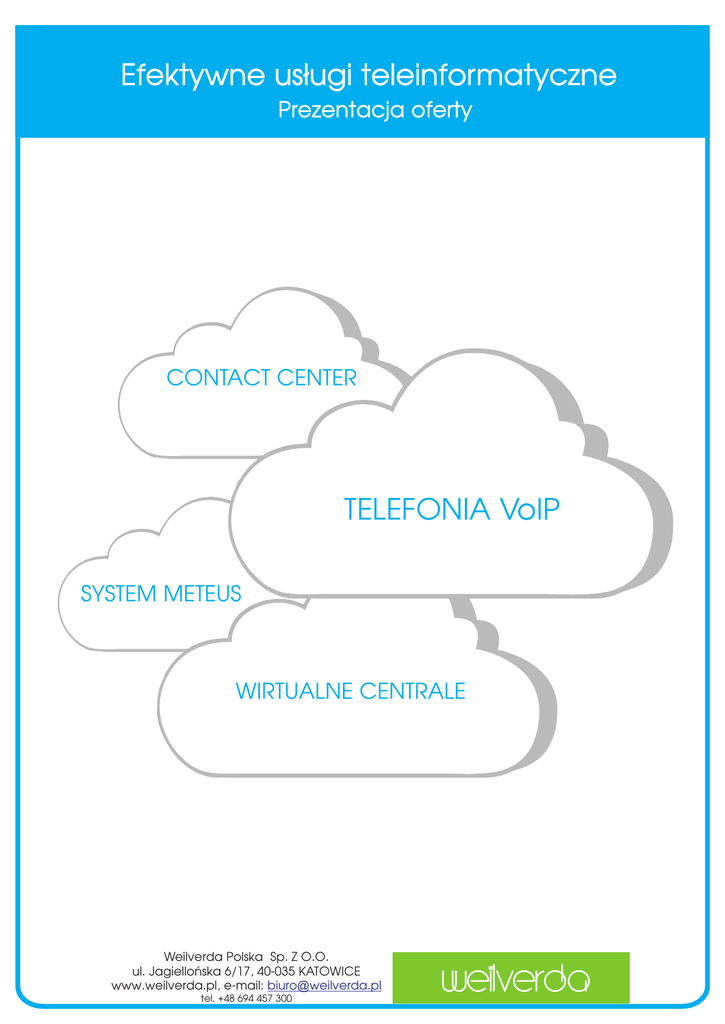 Efektywne us³ugi teleinformatyczne Prezentacja oferty CONTACT CENTER TELEFONIA VoIP SYSTEM METEUS WIRTUALNE CENTRALE Weilverda Polska Sp. Z O.O. ul. Jagielloñska 6/17, 40-035 KATOWICE www.weilverda.pl, e-mail: [email protected] tel. +48 694 457 300 O Nas O Weilverda Weilverda Polska Sp. Z O.O. jest m³od¹, dynamicznie rozwijaj¹c¹ siê firm¹, której dzia³alnoœæ operacyjna, polega na wykorzystaniu nowoczeœniejszych technologii z zakresu zarz¹dzania produktem / us³ug¹, które pochodz¹ zarówno od sprawdzonych partnerów technologicznych jak i dzia³u IT spó³ki, ze szczególnym uwzglêdnieniem dzia³alnoœci w zakresie: - audytu, projektowania, wdro¿enia oraz obs³ugi nowoczesnych systemów telekomunikacyjnych, opartych na transmisji danych w technologiach: œwiat³owodowych (FTTx) oraz mobilnych (LTE); - audytu, optymalizacji, wdro¿enia oraz obs³ugi nowoczesnych systemów telekomunikacyjnych, oraz informatycznych z zakresu zarz¹dzania i marketingu produktem lub us³ug¹; - audytu, projektowania oraz wdro¿enia inteligentnego systemu pomiaru energii „Meteus” dedykowanego dla sektora B2B Weilverda Polska Sp. Z O.O. jako autoryzowany reseller firmy Exatel S.A. bazuje na najlepszych praktykach i standardach dostêpnych na rynku oraz gronie specjalistów z zakresu telekomunikacji, informatyki, sprzeda¿y oraz marketingu, k³adzie szczególny nacisk na fakt, aby proponowane rozwi¹zania by³y efektywne kosztowo dla partnerów biznesowych oraz dostarcza³y jak najwiêcej wartoœci u¿ytkownikowi koñcowemu. Jak dzia³amy? Dziêki wykwalifikowanemu zespo³owi ekspertów z zakresu us³ug teleinformatycznych oraz wsparciu specjalistów z firmy Exatel, Weilverda Polska zapewnia Klientom pe³ne wsparcie merytoryczne i techniczne na ka¿dym etapie wspó³pracy. Rozpoczêcie wspó³pracy Audyt i rozpoznanie potrzeb klienta Opracowanie projektu systemu Etap uzgodnieñ z Klientem Wdro¿enie systemu Obs³uga posprzeda¿owa Zadowolenie Klienta Zapraszamy do wspó³pracy Nasze rozwi¹zania Telefonia VoIP O telefonii VoIP Telefonia VoIP to us³uga po³¹czeñ telefonicznych, która sukcesywnie zastêpuje telefoniê tradycyjn¹ realizowan¹ wy³¹cznie poprzez dedykowane ³¹cze telefoniczne operatora. W dobie komputerów oraz internetu, telefonia oparta na VoIP jest ³atwo dostêpnym i znacznie bardziej elastycznym rozwi¹zaniem dla firmy. Telefonia VoIP to równie¿ mo¿liwoœæ zaprojektowania w³asnego systemu telekomunikacyjnego poprzez wybór us³ug, które usprawni¹ komunikacje z klientami oraz wewn¹trz firmy. Rozwi¹zania dla firm oparte na technologii VoIP idealnie wpasowuj¹ siê w œrodowisko wszystkich rodzajów przedsiêbiorstw z uwagi na niskie koszty implementacji oraz niemal natychmiastow¹ mo¿liwoœæ uruchomienia systemu do dzia³ania. Funkcje telefonii VoIP - Wirtualna centrala pozwalaj¹ca na zarz¹dzanie systemem telekomunikacyjnym w firmie - Systemy contact center pozwalaj¹ce na profesjonaln¹ obs³ugê klienta - Wirtualny fax: fax2mail/mail2fax - Integracja telefonii VoIP z telefoni¹ GSM - Wielokrotne po³¹czenia przez jeden numer telefonu - HD Voice - System IVR - Mo¿liwoœæ konfiguracji numerów - Przekierowania po³¹czeñ - Raportowanie online - Mo¿liwoœæ itegracji telefonii VoIP z systemami CRM, ERP - Us³uga call pickup - Us³uga hunt group - Us³ugi telekonferencji - Wiele innych Korzyœci z wdro¿enia telefonii VoIP - Ni¿sze koszty po³¹czeñ, redukcja kosztów na po³¹czeniach miêdzynarodowych, miêdzystrefowych oraz komórkowych - Darmowe po³¹czenie wewn¹trz sieci VoIP danego operatora - Bezp³atne po³¹czenia, pomiêdzy oddzia³ami firmy, - Rozmowy w jakoœci HD - Wysoka mobilnoœæ rozwi¹zania tj. stacjonarny numer telefoniczny z dowolnej strefy numeracyjnej jest u¿ywany niezale¿nie od geograficznego miejsca pod³¹czenia siê do sieci: a)dla u³atwienia kontaktu z klientami z innych miast mo¿na u¿ywaæ wielu numerów z ró¿nych stref numeracyjnych b)podró¿uj¹c po œwiecie, mo¿na nawi¹zywaæ i odbieraæ rozmowy na swoim numerze stacjonarnym - Bie¿¹ca kontrola nad rachunkami - Nie trzeba zmieniaæ systemu telefonicznego - Mo¿liwoœæ zakupu lub dzier¿awy urz¹dzeñ Partner technologiczny: Nasze rozwi¹zania Wirtualna centrala O wirtualnej centrali Wirtualna centrala telefoniczna to nowoczesny system obs³ugi biura w oparciu o model „w chmurze", którego g³ówn¹ zalet¹ jest mo¿liwoœæ przemiany tradycyjnego numeru stacjonarnego w nowoczesne i proste w obs³udze rozwi¹zanie, usprawniaj¹ce komunikacjê zarówno z Klientami, jak i pomiêdzy pracownikami. Jednym z g³ównych korzyœci tego rozwi¹zania jest jego niska (wzglêdem tradycyjnej centrali) cena, wysoka funkcjonalnoœæ, niezawodnoœæ oraz bezpieczeñstwo. Funkcje wirtualnej centrali - Obs³uga ruchu telefonicznego - przekierowania po³¹czeñ do dowolnej lokalizacji, transfery po³¹czeñ do innego u¿ytkownika b¹dŸ poza wirtualn¹ centralê telefoniczn¹, przejmowanie po³¹czenia dzwoni¹cego na telefon, przy którym nikogo nie ma (call pickup), funkcja „nie przeszkadzaæ”, wysy³ka i odbiór faksów drog¹ elektroniczn¹, darmowe po³¹czenia wewn¹trz organizacji i w sieci operatora - Konfiguracja numerów - ustawienia skróconych numerów wewnêtrznych, tworzenie regu³ blokowania numerów, ustawianie numeru dla po³¹czeñ wychodz¹cych, zastrze¿enie prezentacji numeru dla po³¹czeñ wychodz¹cych, integracja z istniej¹cymi numerami telefonicznymi - System IVR - ³atwy w konfiguracji, wielopoziomowy i pe³ni definiowalny przez u¿ytkownika system z mo¿liwoœciami: wyboru œcie¿ki przejœcia przez osobê dzwoni¹c¹, autoryzacji, przekierowania przy przepe³nieniu oraz w zale¿noœci od daty i godziny (np. dni œwi¹teczne), odtwarzania zapowiedzi, definiowania operacji w przypadku b³êdnego wyboru opcji przez rozmówcê, ustawienia poczty g³osowej, ustawienia muzyki odtwarzanej w trakcie oczekiwania na po³¹czenie - Funkcja fax2mail 