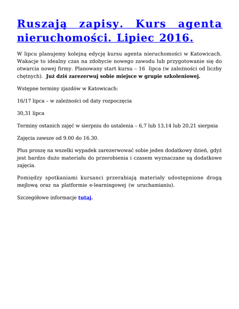 Ruszają zapisy. Kurs agenta nieruchomości. Lipiec 2016. W lipcu planujemy kolejną edycję kursu agenta nieruchomości w Katowicach. Wakacje to idealny czas na zdobycie nowego zawodu lub przygotowanie się do otwarcia nowej firmy. Planowany start kursu – 16 lipca (w zależności od liczby chętnych). Już dziś zarezerwuj sobie miejsce w grupie szkoleniowej. Wstępne terminy zjazdów w Katowicach: 16/17 lipca – w zależności od daty rozpoczęcia 30,31 lipca Terminy ostanich zajęć w sierpniu do ustalenia – 6,7 lub 13,14 lub 20,21 sierpnia Zajęcia zawsze od 9.00 do 16.30. Plus proszę na wszelki wypadek zarezerwować sobie jeden dodatkowy dzień, gdyż jest bardzo dużo materiału do przerobienia i czasem wyznaczane są dodatkowe zajęcia. Pomiędzy spotkaniami kursanci przerabiają materiały udostępnione drogą mejlową oraz na platformie e-learningowej (w uruchamianiu). Szczegółowe informacje tutaj.
