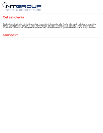 Cel szkolenia Zdobycie umiejętności niezbędnych do wykorzystanie internetu jako źródła informacji i wiedzy, w pracy i w domu. Udostępnianie danych w sieci. Korzystanie z aplikacji do korzystania z poczty e-mail, przesyłanie i odbieranie załączników, zarządzanie informacjami. Możliwości wykorzystania MS Outlook w pracy firmowej. Konspekt Program szkolenia: 1. Przeglądarka MS Internet Explorer a. Wstęp do IE i. Uruchamianie programu. ii. Elementy okna przeglądarki. iii. Paski narzędzi. iv. Wyświetlanie i chowanie pasków narzędzi. v. Pasek stanu. b. Wybieranie strony początkowej. c. Surfowanie po WWW. i. Czym są strony WWW? ii. Struktura WWW. iii. Skok pod wskazany adres. iv. Korzystanie z hiperłączy. v. Wyświetlanie ostatnio odwiedzonych stron. vi. Przechodzenie do strony głównej. vii. Ponowne ładowanie i odświeżanie strony Przerywanie ładowania strony. viii. Przeglądnie stron w trybie offline. ix. Tymczasowe pliki internetowe. x. Ramki. d. Poruszenie się po zasobach serwerów FTP. e. Operacje i. Kopiowanie plików. ii. Zapisywanie i drukowanie. iii. Zapisywanie stron WWW. iv. Zapisywanie obrazów. v. Kopiowanie i wklejanie. f. Najpopularniejsze serwisy wyszukiwawcze. g. Lista ulubionych stron. 2. MS Outlook a. Zarządzanie plikami i folderami za pomocą Outlooka. b. Podstawowe informacje na temat kontaktów. i. Zarządzanie kontaktami. Poczta, załączniki i faksy. c. Podstawy poczty e–mail. i. Sortowanie poczty. ii. Kalendarz, Zadania, Dziennik i Notatki. iii. Podstawowe właściwości Kalendarza. iv. Zarządzanie zadaniami. v. Folder Notatki. vi. Odnajdywanie kontaktów, wiadomości i innych elementów Outlooka. d. Drukowanie i dostosowanie opcji drukowania. e. Integracja z innymi aplikacjami pakietu OFFICE. f. Outlook, Internet i sieć. g. Praca w grupach. h. Zarządzanie danymi i ich ochrona. Dodatkowe informacje W cenę szkolenia wliczony jest: Certyfikat ukończenia szkolenia NT Group Sp. z o.o. Materiały szkoleniowe, notatnik, długopis Kontakt z trenerem po szkoleniu Kawa, herbata, słodki poczęstunek Obiad Firma posiada wpis w Urzędzie Miasta Łodzi jako placówka kształcenia ustawicznego. NT Group Systemy Informatyczne Sp. z o.o. Krajowy Rejestr Sądowy Konto Bankowe 90-418 Łódź, Al. T. Kościuszki 39 III piętro KRS 0000214993 Kredyt Bank S.A. tel.: +42 6553377 Sąd Rejonowy dla Łodzi-Śródmieścia Rozliczenie Krajowe: tel. / fax. +42 6301563 w Łodzi, XX Wydział KRS 71 1500 1246 1215 4005 5991 0000 e-mail: [email protected] www.ntgroup.pl Rozliczenie Zagraniczne: Regon: 470557218 PL 71 1500 1246 1215 4005 5991 0000 NIP: 7251888624 KRDBPLPW