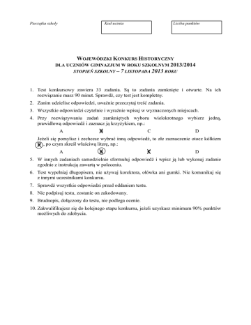 Pieczątka szkoły Liczba punktów Kod ucznia WOJEWÓDZKI KONKURS HISTORYCZNY DLA UCZNIÓW GIMNAZJUM W ROKU SZKOLNYM 2013/2014 STOPIEŃ SZKOLNY – 7 LISTOPADA 2013 ROKU 1. Test konkursowy zawiera 33 zadania. Są to zadania zamknięte i otwarte. Na ich rozwiązanie masz 90 minut. Sprawdź, czy test jest kompletny. 2. Zanim udzielisz odpowiedzi, uważnie przeczytaj treść zadania. 3. Wszystkie odpowiedzi czytelnie i wyraźnie wpisuj w wyznaczonych miejscach. 4. Przy rozwiązywaniu zadań zamkniętych wyboru wielokrotnego wybierz jedną, prawidłową odpowiedź i zaznacz ją krzyżykiem, np.: A XB C D Jeżeli się pomylisz i zechcesz wybrać inną odpowiedź, to złe zaznaczenie otocz kółkiem XB , po czym skreśl właściwą literę, np.: A XB XC D 5. W innych zadaniach samodzielnie sformułuj odpowiedź i wpisz ją lub wykonaj zadanie zgodnie z instrukcją zawartą w poleceniu. 6. Test wypełniaj długopisem, nie używaj korektora, ołówka ani gumki. Nie komunikuj się z innymi uczestnikami konkursu. 7. Sprawdź wszystkie odpowiedzi przed oddaniem testu. 8. Nie podpisuj testu, zostanie on zakodowany. 9. Brudnopis, dołączony do testu, nie podlega ocenie. 10. Zakwalifikujesz się do kolejnego etapu konkursu, jeżeli uzyskasz minimum 90% punktów możliwych do zdobycia. WOJEWÓDZKIE KONKURSY PRZEDMIOTOWE 2013/2014 – GIMNAZJUM STOPIEŃ SZKOLNY Zadanie 1. (0-3 p.) Na podstawie analizy zamieszczonego schematu świątyni egipskiej i własnej wiedzy odpowiedz na pytania. A. Do którego z miejsc oznaczonych na ilustracji mieli dostęp wszyscy? ……………………………………………………………………………………………… B. Gdzie w świątyni przechowywany był posąg bóstwa? ……………………………………………………………………………………………… C. Do którego miejsca w świątyni miał dostęp tylko najwyższy kapłan? ………………………………………………………………………………………………. Zadanie 2. (0-1 p.) W wykropkowane miejsca wstaw cyfrę 1 obok nazwy miejsca bitwy, która została stoczona najwcześniej, a cyfrę 2 obok nazwy miejsca bitwy stoczonej najpóźniej. A. bitwa pod Issos ………... B. bitwa pod Maratonem ………... C. bitwa pod Salaminą ………... D. bitwa pod Kannami ………... Zadanie 3. (0-1 p.) Wybierz bogów, którzy byli związani z imprezami podanymi w tabeli. Wpisz odpowiednią literę w wolną kratkę. A. Apollo B. Dionizos C. Zeus Igrzyska sportowe na stadionie (olimpijskie). Wystawianie sztuk teatralnych w teatrze. 2 z 11 D. Hades WOJEWÓDZKIE KONKURSY PRZEDMIOTOWE 2013/2014 – GIMNAZJUM STOPIEŃ SZKOLNY Po przeczytaniu tekstu źródłowego wykonaj zadania 4 i 5. O tym, który oddaje się pod władzę innego. Dostojnemu panu (temu a temu) ja zaś (ten a ten). Ponieważ wszystkim jest doskonale znane, że nie posiadam niczego, co pozwoliłoby mi wyżywić się i odziać, dlatego też zwróciłem się do waszej łaskawości i postanowiłem, że powinienem się oddać i powierzyć waszej opiece. Dokonałem też tego, a mianowicie na następujących warunkach: winniście mnie wspierać i wspomagać tak wyżywieniem, jak i odzieżą, abym mógł stosownie do tego służyć wam i być pożytecznym; a dopóki będę żył, winienem wam służbę i posłuszeństwo na prawach wolnego człowieka i nie jestem w mocy za żywota mego uwolnić się spod waszej władzy i opieki, lecz aż do śmierci winienem pozostawać pod waszą władzą i ochroną. Stąd ułożono się, że gdyby jeden z nas naruszył tę umowę (taką a taką) sumę solidów zapłaci drugiej stronie, sama zaś umowa niechaj pozostaje trwale w mocy. W związku z tym powinni sporządzić między sobą dwa jednobrzmiące dokumenty; tak też i uczynili. Źródło: Wiek V–XV w źródłach, oprac. M. Sobańska-Bondaruk, S.B. Lenard, Warszawa 1997 Zadanie 4. (0-1 p.) Cytowany dokument dotyczy umowy zawieranej z tytułu A. lokacji wsi na prawie niemieckim. B. unormowania poddaństwa chłopów. C. ustanowienia zależności lennej. D. uregulowania przywilejów szlacheckich. Zadanie 5. (0-1 p.) Powyższy dokument wiązał strony umową, która miała obowiązywać A. B. C. D. przez 20 lat. dożywotnio. do chwili wypowiedzenia jej przez jedną ze stron. tymczasowo. Zadanie 6. (0-1 p.) Którzy z wymienionych władców Polski byli koronowani? Wpisz do poniższej ramki litery, którymi oznaczono królów. A. B. C. D. E. Bolesław Krzywousty F. Mieszko I G. Bolesław Śmiały H. Władysław Łokietek Mieszko II Kazimierz Odnowiciel Bolesław Chrobry Władysław Herman 3 z 11 WOJEWÓDZKIE KONKURSY PRZEDMIOTOWE 2013/2014 – GIMNAZJUM STOPIEŃ SZKOLNY Zadanie 7. (0-1 p.) Uzupełnij tablicę genealogiczną Piastów, wpisując odpowiednie imiona książąt polskich. Kazimierz Odnowiciel Władysław Herman 1. Bolesław Krzywousty 2. Zadanie 8. (0-1 p.) Który pokój zawarli Polacy z Krzyżakami w XIV wieku? A. B. C. D. Melneński. Kaliski. Toruński. Krakowski. Zadanie 9. (0-1 p.) W 1411 r. Polska i Litwa zawarły pokój z Krzyżakami, na mocy którego Polska odzyskała A. B. C. D. ziemię chełmińską i Kujawy, a Litwa odzyskała Żmudź. Kujawy, a Litwa odzyskała Żmudź. ziemię dobrzyńską, a Litwa odzyskała Żmudź. Kujawy, ziemię dobrzyńską i ziemię chełmińską, a Litwa odzyskała Żmudź. Zadanie 10. (0-2 p.) Uzupełnij tabelę, podając, za czasów których polskich władców tworzyli Anonim zwany Gallem i Jan Długosz. Kronikarz Władca Polski Anonim zwany Gallem Jan Długosz 4 z 11 WOJEWÓDZKIE KONKURSY PRZEDMIOTOWE 2013/2014 – GIMNAZJUM STOPIEŃ SZKOLNY Zadanie 11. (0-1 p.) W którym szeregu okresy w dziejach kultury są zapisane w kolejności chronologicznej? A. B. C. D. Gotyk, renesans, romanizm, barok, oświecenie. Romanizm, gotyk, renesans, barok, oświecenie. Romanizm, gotyk, barok, renesans, oświecenie. Romanizm, barok, gotyk, renesans, oświecenie. Zadanie 12. (0-2 p.) Przyporz
