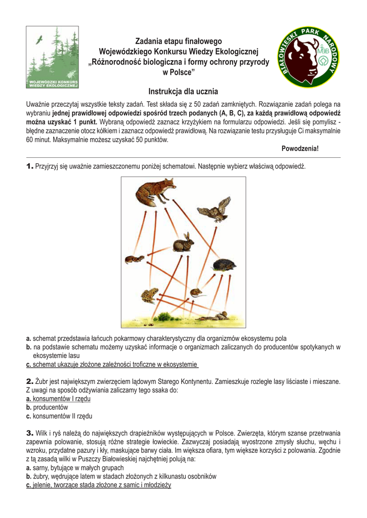Zadania etapu finałowego Wojewódzkiego Konkursu Wiedzy Ekologicznej „Różnorodność biologiczna i formy ochrony przyrody w Polsce” Instrukcja dla ucznia Uważnie przeczytaj wszystkie teksty zadań. Test składa się z 50 zadań zamkniętych. Rozwiązanie zadań polega na wybraniu jednej prawidłowej odpowiedzi spośród trzech podanych (A, B, C), za każdą prawidłową odpowiedź można uzyskać 1 punkt. Wybraną odpowiedź zaznacz krzyżykiem na formularzu odpowiedzi. Jeśli się pomylisz błędne zaznaczenie otocz kółkiem i zaznacz odpowiedź prawidłową. Na rozwiązanie testu przysługuje Ci maksymalnie 60 minut. Maksymalnie możesz uzyskać 50 punktów. Powodzenia! 1. Przyjrzyj się uważnie zamieszczonemu poniżej schematowi. Następnie wybierz właściwą odpowiedź. a. schemat przedstawia łańcuch pokarmowy charakterystyczny dla organizmów ekosystemu pola b. na podstawie schematu możemy uzyskać informacje o organizmach zaliczanych do producentów spotykanych w ekosystemie lasu c. schemat ukazuje złożone zależności troficzne w ekosystemie 2. Żubr jest największym zwierzęciem lądowym Starego Kontynentu. Zamieszkuje rozległe lasy liściaste i mieszane. Z uwagi na sposób odżywiania zaliczamy tego ssaka do: a. konsumentów I rzędu b. producentów c. konsumentów II rzędu 3. Wilk i ryś należą do największych drapieżników występujących w Polsce. Zwierzęta, którym szanse przetrwania zapewnia polowanie, stosują różne strategie łowieckie. Zazwyczaj posiadają wyostrzone zmysły słuchu, węchu i wzroku, przydatne pazury i kły, maskujące barwy ciała. Im większa ofiara, tym większe korzyści z polowania. Zgodnie z tą zasadą wilki w Puszczy Białowieskiej najchętniej polują na: a. sarny, bytujące w małych grupach b. żubry, wędrujące latem w stadach złożonych z kilkunastu osobników c. jelenie, tworzące stada złożone z samic i młodzieży 4. Do cech ekosystemu nie należy: a. sukcesja b. przepływ energii c. struktura wiekowa 5. Zagęszczenie to cecha charakteryzująca: a. biom b. gatunek c. populację 6. Wskaż odpowiedź zawierającą prawidłowe dokończenie zdania. Ekosystem jest bardziej trwały i istnieje większa szansa na utrzymanie w nim równowagi, gdy: a. charakteryzuje się on większym udziałem organizmów należących do producentów b. charakteryzuje się on obecnością znacznej ilości gatunków pionierskich c. charakteryzuje się on dużą różnorodnością biologiczną 7. Rzęsorek rzeczek jest jednym z nielicznych ssaków jadowitych. Jego jad produkowany jest w: a. żołądku b. zębach jadowych c. śliniankach 8. Traszka zwyczajna należy do organizmów: a. planktonowych b. nektonowych c. bentosowych 9. Na obszarach bagiennych chętnie występuje: a. wydmuchrzyca piaskowa b. arnika górska c. knieć błotna 10. Zbiorowiskiem leśnym porastającym bezodpływowe zagłębienia terenu, w którym przez większą część roku występuje woda stagnująca jest: a. łęg b. grąd c. ols 11. Jakie cechy wspólne występują u rozwielitki i homara? Zaznacz właściwą odpowiedź. a. bytują w tych samych środowiskach b. wspólną cechą jest poruszanie się za pomocą odnóży skocznych c. wspólną cechą jest przynależność do tej samej grupy systematycznej 12. Do nieodnawialnych zasobów przyrody należą: a. gaz ziemny, woda, rośliny b. węgiel brunatny, zwierzęta, powietrze c. ropa naftowa, piaskowce, granity 13. Które z wymienionych poniżej gatunków zwierząt wyginęły wskutek nieprzemyślanych działań człowieka? Wskaż właściwą odpowiedź. a. dront dodo, moa, bizon b. tur, tarpan, bizon c. gołąb wędrowny, kwagga, alka olbrzymia 14. Ten park narodowy powstał w 1872 roku w Stanach Zjednoczonych Ameryki Północnej. Celem jego utworzenia była ochrona części Gór Skalistych. Park słynie między innymi ze wspaniałych gejzerów – gorących źródeł, wyrzucających ogromne słupy pary i wody. Powyższy opis dotyczy: a. Parku Narodowego Yellowstone b. Parku Narodowego Lake Clark c. Parku Narodowego Doliny Śmierci 15. Wskaż poprawne dokończenie zdania. Pomnikiem przyrody jest: a. rezerwat chroniący skały o szczególnych walorach przyrodniczych b. obszar chroniony z uwagi na walory przyrodnicze i kulturowe c. szczególnie cenne i stare pojedyncze drzewo objęte ochroną 16. Jakie parki narodowe są rezerwatami biosfery? Wskaż właściwą odpowiedź. a. Białowieski, Tatrzański b. Karkonoski, Ujście Warty c. Bieszczadzki, Gorczański 17. Korytarz ekologiczny to: a. wyodrębniony pas przestrzeni, łączący podobne środowiska lub obszary o zbliżonej charakterystyce b. obszar umożliwiający migrację roślin, zwierząt i grzybów c. obie odpowiedzi są prawidłowe 18. Przeczytaj uważnie zamieszczone poniżej hasłowe informacje. – długotrwałe wykorzystanie odnawialnych zasobów przyrody – utrzymywanie stabilności procesów ekologicznych i ekosystemów – ochrona przyrody – ochrona różnorodności biologicznej – zachowanie i polepszanie stanu zdrowia ludzi – edukacja ekologiczna społeczeństwa – polepszanie dobrobytu ludzi Są one przykładowymi założeniami: a. zrównoważonego rozwoju b. proekologicznego stylu życia c. polityki państwa, gwarantującej ochronę gatunkową 19. Puszcza Białowieska jest jednym z najstarszych obiektów przyrodniczych chronionych w Polsce, bo już od: a. 100 lat b. 250 lat c. 600 lat 20. Najcenniejszy fragment Puszczy Białowieskiej to Obręb Ochronny Orłówka Białowieskiego Parku Narodowego. To obszar o powierzchni około 47 km², a naturalnymi granicami tego wyjątkowego terenu od strony zachodniej i północnej są rzeki: a. Leśna, Narew b. Narewka, Hwoźna c. Orłówka, Łutownia 21. Przez środek tego zbiornika wodnego przebiega linia kolejowa, którą transportowane są niebezpieczne substancje. Jest to zbiornik: a. Łoknica b. Bachmaty c. Siemianówka 22. Przez Białowieski Park Narodowy przepływa rzeka, która w całym swoim b