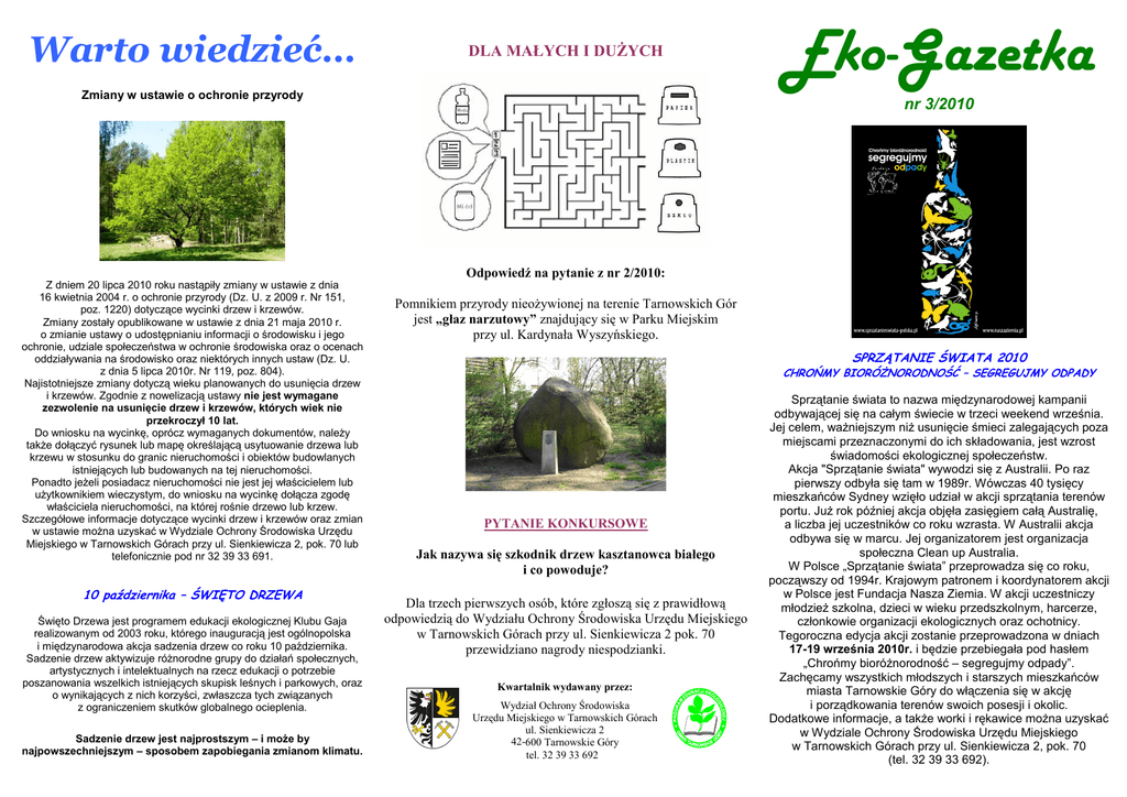 Warto wiedzieć… DLA MAŁYCH I DUśYCH Zmiany w ustawie o ochronie przyrody Eko-Gazetka nr 3/2010 Odpowiedź na pytanie z nr 2/2010: Z dniem 20 lipca 2010 roku nastąpiły zmiany w ustawie z dnia 16 kwietnia 2004 r. o ochronie przyrody (Dz. U. z 2009 r. Nr 151, poz. 1220) dotyczące wycinki drzew i krzewów. Zmiany zostały opublikowane w ustawie z dnia 21 maja 2010 r. o zmianie ustawy o udostępnianiu informacji o środowisku i jego ochronie, udziale społeczeństwa w ochronie środowiska oraz o ocenach oddziaływania na środowisko oraz niektórych innych ustaw (Dz. U. z dnia 5 lipca 2010r. Nr 119, poz. 804). Najistotniejsze zmiany dotyczą wieku planowanych do usunięcia drzew i krzewów. Zgodnie z nowelizacją ustawy nie jest wymagane zezwolenie na usunięcie drzew i krzewów, których wiek nie przekroczył 10 lat. Do wniosku na wycinkę, oprócz wymaganych dokumentów, naleŜy takŜe dołączyć rysunek lub mapę określającą usytuowanie drzewa lub krzewu w stosunku do granic nieruchomości i obiektów budowlanych istniejących lub budowanych na tej nieruchomości. Ponadto jeŜeli posiadacz nieruchomości nie jest jej właścicielem lub uŜytkownikiem wieczystym, do wniosku na wycinkę dołącza zgodę właściciela nieruchomości, na której rośnie drzewo lub krzew. Szczegółowe informacje dotyczące wycinki drzew i krzewów oraz zmian w ustawie moŜna uzyskać w Wydziale Ochrony Środowiska Urzędu Miejskiego w Tarnowskich Górach przy ul. Sienkiewicza 2, pok. 70 lub telefonicznie pod nr 32 39 33 691. 10 października – ŚWIĘTO DRZEWA Święto Drzewa jest programem edukacji ekologicznej Klubu Gaja realizowanym od 2003 roku, którego inauguracją jest ogólnopolska i międzynarodowa akcja sadzenia drzew co roku 10 października. Sadzenie drzew aktywizuje róŜnorodne grupy do działań społecznych, artystycznych i intelektualnych na rzecz edukacji o potrzebie poszanowania wszelkich istniejących skupisk leśnych i parkowych, oraz o wynikających z nich korzyści, zwłaszcza tych związanych z ograniczeniem skutków globalnego ocieplenia. Sadzenie drzew jest najprostszym – i moŜe by najpowszechniejszym – sposobem zapobiegania zmianom klimatu. Pomnikiem przyrody nieoŜywionej na terenie Tarnowskich Gór jest „głaz narzutowy” znajdujący się w Parku Miejskim przy ul. Kardynała Wyszyńskiego. SPRZĄTANIE ŚWIATA 2010 CHROŃMY BIORÓśNORODNOŚĆ – SEGREGUJMY ODPADY PYTANIE KONKURSOWE Jak nazywa się szkodnik drzew kasztanowca białego i co powoduje? Dla trzech pierwszych osób, które zgłoszą się z prawidłową odpowiedzią do Wydziału Ochrony Środowiska Urzędu Miejskiego w Tarnowskich Górach przy ul. Sienkiewicza 2 pok. 70 przewidziano nagrody niespodzianki. Kwartalnik wydawany przez: Wydział Ochrony Środowiska Urzędu Miejskiego w Tarnowskich Górach ul. Sienkiewicza 2 42-600 Tarnowskie Góry tel. 32 39 33 692 Sprzątanie świata to nazwa międzynarodowej kampanii odbywającej się na całym świecie w trzeci weekend września. Jej celem, waŜniejszym niŜ usunięcie śmieci zalegających poza miejscami przeznaczonymi do ich składowania, jest wzrost świadomości ekologicznej społeczeństw. Akcja "Sprzątanie świata" wywodzi się z Australii. Po raz pierwszy odbyła się tam w 1989r. Wówczas 40 tysięcy mieszkańców Sydney wzięło udział w akcji sprzątania terenów portu. JuŜ rok później akcja objęła zasięgiem całą Australię, a liczba jej uczestników co roku wzrasta. W Australii akcja odbywa się w marcu. Jej organizatorem jest organizacja społeczna Clean up Australia. W Polsce „Sprzątanie świata” przeprowadza się co roku, począwszy od 1994r. Krajowym patronem i koordynatorem akcji w Polsce jest Fundacja Nasza Ziemia. W akcji uczestniczy młodzieŜ szkolna, dzieci w wieku przedszkolnym, harcerze, członkowie organizacji ekologicznych oraz ochotnicy. Tegoroczna edycja akcji zostanie przeprowadzona w dniach 17-19 września 2010r. i będzie przebiegała pod hasłem „Chrońmy bioróŜnorodność – segregujmy odpady”. Zachęcamy wszystkich młodszych i starszych mieszkańców miasta Tarnowskie Góry do włączenia się w akcję i porządkowania terenów swoich posesji i okolic. Dodatkowe informacje, a takŜe worki i rękawice moŜna uzyskać w Wydziale Ochrony Środowiska Urzędu Miejskiego w Tarnowskich Górach przy ul. Sienkiewicza 2, pok. 70 (tel. 32 39 33 692). IV edycja konkursu pn.: „Chronimy kasztanowce – walczymy ze szrotówkiem” Wzorem lat ubiegłych Organizatorami konkursu są Wydział Ochrony Środowiska Urzędu Miejskiego w Tarnowskich Górach oraz Zarząd Oddziału Powiatowego Ligi Ochrony Przyrody w Tarnowskich Górach. Tegoroczna edycja jest realizowana w ramach kampanii ekologicznej pn.: „Chronimy tarnogórskie kasztanowce”, wpisanej do Rocznego Programu Edukacji Ekologicznej Gminy Tarnowskie Góry na 2010 rok. Kampania ma na celu eliminowanie szkodnika kasztanowców za pomocą tylko naturalnych metod. Dotychczas, w ramach kampanii, zakupiono zimowy pokarm dla ptaków tzw. „ptasie pyzy”, który został przekazany do tarnogórskich placówek oświatowych, celem zawieszenia na drzewach w ogrodach szkół i przedszkoli. SłuŜył on m.in. dokarmianiu populacji sikorek, które latem Ŝywią się szrotówkiem, przyczyniając się tym samym do ograniczania jego liczby. W Parku Miejskim oraz w Parku w Reptach na 180 drzewach kasztanowców rozwieszono pułapki kominowe z dyspenserami feromonowymi do wyłapywania larw szrotówka. Jesienią spod tych drzew przeprowadzone zostanie wygrabianie opadłych liści. Cyklicznie na stronie internetowej miasta umieszczane są artykuły dot. ochrony drzew kasztanowców w naszym mieście oraz prowadzonych na nich prac. Obecnie w opracowaniu jest ulotka oraz prezentacja nt. ochrony kasztanowców. Po serii wykonanych działań nadeszła pora na kolejną edycję konkursu na wygrabianie liści spod drzew kasztanowców, która została zgłoszona do ogólnopolskiej akcji