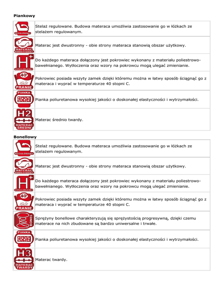 Piankowy Stelaż regulowane. Budowa materaca umożliwia zastosowanie go w łóżkach ze stelażem regulowanym. Materac jest dwustronny - obie strony materaca stanowią obszar użytkowy. Do każdego materaca dołączony jest pokrowiec wykonany z materiału poliestrowobawełnianego. Wytłoczenia oraz wzory na pokrowcu mogą ulegać zmienianie. Pokrowiec posiada wszyty zamek dzięki któremu można w łatwy sposób ściągnąć go z materaca i wyprać w temperaturze 40 stopni C. Pianka poliuretanowa wysokiej jakości o doskonałej elastyczności i wytrzymałości. Materac średnio twardy. Bonellowy Stelaż regulowane. Budowa materaca umożliwia zastosowanie go w łóżkach ze stelażem regulowanym. Materac jest dwustronny - obie strony materaca stanowią obszar użytkowy. Do każdego materaca dołączony jest pokrowiec wykonany z materiału poliestrowobawełnianego. Wytłoczenia oraz wzory na pokrowcu mogą ulegać zmienianie. Pokrowiec posiada wszyty zamek dzięki któremu można w łatwy sposób ściągnąć go z materaca i wyprać w temperaturze 40 stopni C. Sprężyny bonellowe charakteryzują się sprężystością progresywną, dzięki czemu materace na nich zbudowane są bardzo uniwersalne i trwałe. Pianka poliuretanowa wysokiej jakości o doskonałej elastyczności i wytrzymałości. Materac twardy. Kieszeniowy Stelaż regulowane. Budowa materaca umożliwia zastosowanie go w łóżkach ze stelażem regulowanym. Materac jest dwustronny - obie strony materaca stanowią obszar użytkowy. Do każdego materaca dołączony jest pokrowiec wykonany z materiału poliestrowobawełnianego. Wytłoczenia oraz wzory na pokrowcu mogą ulegać zmienianie. Pokrowiec posiada wszyty zamek dzięki któremu można w łatwy sposób ściągnąć go z materaca i wyprać w temperaturze 40 stopni C. Pianka poliuretanowa wysokiej jakości o doskonałej elastyczności i wytrzymałości. Materac twardy. Piankowo-kokosowy Stelaż regulowane. Budowa materaca umożliwia zastosowanie go w łóżkach ze stelażem regulowanym. Materac jest dwustronny - obie strony materaca stanowią obszar użytkowy. Do każdego materaca dołączony jest pokrowiec wykonany z materiału poliestrowobawełnianego. Wytłoczenia oraz wzory na pokrowcu mogą ulegać zmienianie. Pokrowiec posiada wszyty zamek dzięki któremu można w łatwy sposób ściągnąć go z materaca i wyprać w temperaturze 40 stopni C. Wkład kokosowy usztywnia materac, zapewnia prawidłową cyrkulację powietrza, posiada właściwości antyalergiczne i antygrzybiczne. Pianka poliuretanowa wysokiej jakości o doskonałej elastyczności i wytrzymałości. Dwie sfery twardości - materac średnio twardy. Dwie sfery twardości - materac twardy. Z warstwą lateksową Stelaż regulowane. Budowa materaca umożliwia zastosowanie go w łóżkach ze stelażem regulowanym. Materac jest dwustronny - obie strony materaca stanowią obszar użytkowy. Do każdego materaca dołączony jest pokrowiec wykonany z materiału poliestrowobawełnianego. Wytłoczenia oraz wzory na pokrowcu mogą ulegać zmienianie. Pokrowiec posiada wszyty zamek dzięki któremu można w łatwy sposób ściągnąć go z materaca i wyprać w temperaturze 40 stopni C. Pianka poliuretanowa wysokiej jakości o doskonałej elastyczności i wytrzymałości. Warstwa lateksu znacznie zwiększa elastyczność oraz wytrzymałość materaca, dopasowuje się do kształtu ciała poprawiając komfort snu. Materac średnio twardy. Lateksowy Materac jest dwustronny - obie strony materaca stanowią obszar użytkowy. Do każdego materaca dołączony jest pokrowiec wykonany z materiału poliestrowobawełnianego. Wytłoczenia oraz wzory na pokrowcu mogą ulegać zmienianie. Pokrowiec posiada wszyty zamek dzięki któremu można w łatwy sposób ściągnąć go z materaca i wyprać w temperaturze 40 stopni C. Stelaż regulowane. Budowa materaca umożliwia zastosowanie go w łóżkach ze stelażem regulowanym. Pianka poliuretanowa wysokiej jakości o doskonałej elastyczności i wytrzymałości. Sprężyna kieszeniowa jest zdecydowanie cichsza od sprężyny klastycznej, eliminuje efekt uginania strefowego oraz lepiej dopasowuje się do kształtu ciała. Warstwa lateksu znacznie zwiększa elastyczność oraz wytrzymałość materaca, dopasowuje się do kształtu ciała poprawiając komfort snu. Materac twardy. Termoelastyczny Pianka wysokoelastyczna z zewnętrznymi warstwami pianki Visco oraz nowej generacji lateksu z żelem silikonowym. Strona jesienno-zimowa z pianki visco, która absorbuje i utrzymuje długo ciepło wewnątrz materaca. Strona wiosenno-letnia z innowacyjnego lateksu Ocean Blue zawierającego żel silikonowy - ciepło otoczenia nie wnika głęboko w struktury pianki i jest szybciej oddawane - dzięki temu materac ma przyjemną dla ciała temperaturę, a jego powierzchnia jest idealnie sucha dzięki szybkiej absorpcji wilgoci. Materac jest oferowany w pokrowcu na bazie naturalnej wiskozy Tencel, która łączy zalety bawełny i tradycyjnej wiskozy. Tencel ma znakomite właściwości oddychające. Jego wkłona pochłaniają wilgoć oraz utrzymują stałą temperaturę, dzięki czemu nadaje się na każdą porę roku, a dodatkowo jest bardzo wytrzymały. Materac średnio-twardy polecany dla użytkowników o wadze do 100kg. Materac można użytkować na stelażach elastycznych i regulowanych. Materac dwustronny i 3-warstwowy.