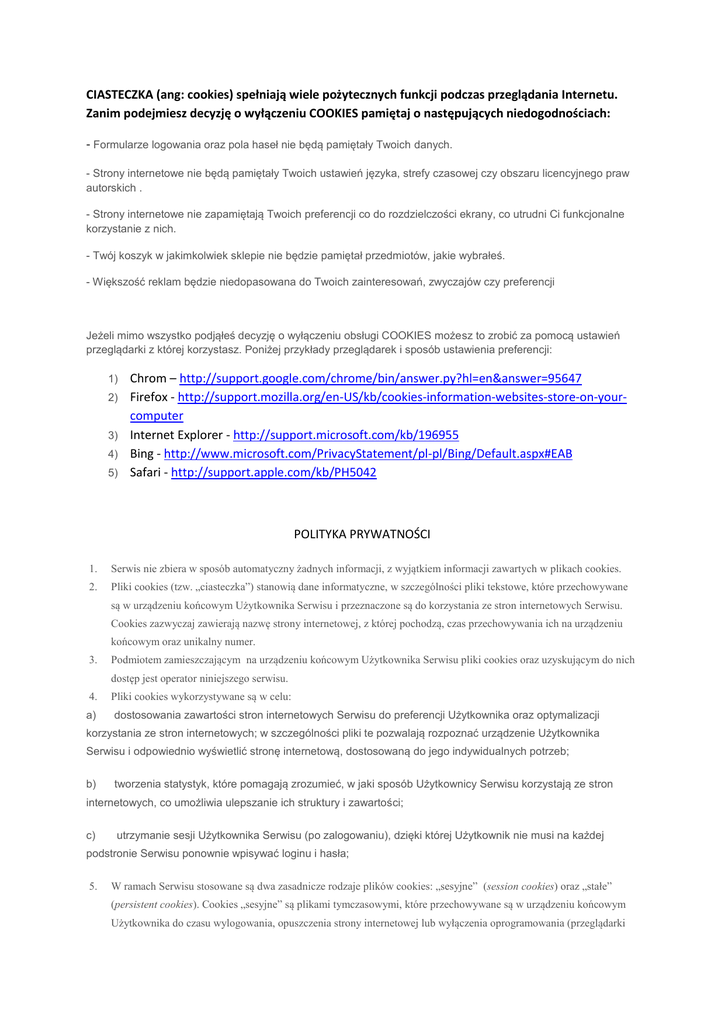 CIASTECZKA (ang: cookies) spełniają wiele pożytecznych funkcji podczas przeglądania Internetu. Zanim podejmiesz decyzję o wyłączeniu COOKIES pamiętaj o następujących niedogodnościach: - Formularze logowania oraz pola haseł nie będą pamiętały Twoich danych. - Strony internetowe nie będą pamiętały Twoich ustawień języka, strefy czasowej czy obszaru licencyjnego praw autorskich . - Strony internetowe nie zapamiętają Twoich preferencji co do rozdzielczości ekrany, co utrudni Ci funkcjonalne korzystanie z nich. - Twój koszyk w jakimkolwiek sklepie nie będzie pamiętał przedmiotów, jakie wybrałeś. - Większość reklam będzie niedopasowana do Twoich zainteresowań, zwyczajów czy preferencji Jeżeli mimo wszystko podjąłeś decyzję o wyłączeniu obsługi COOKIES możesz to zrobić za pomocą ustawień przeglądarki z której korzystasz. Poniżej przykłady przeglądarek i sposób ustawienia preferencji: 1) 2) 3) 4) 5) Chrom – http://support.google.com/chrome/bin/answer.py?hl=en&answer=95647 Firefox - http://support.mozilla.org/en-US/kb/cookies-information-websites-store-on-yourcomputer Internet Explorer - http://support.microsoft.com/kb/196955 Bing - http://www.microsoft.com/PrivacyStatement/pl-pl/Bing/Default.aspx#EAB Safari - http://support.apple.com/kb/PH5042 POLITYKA PRYWATNOŚCI 1. Serwis nie zbiera w sposób automatyczny żadnych informacji, z wyjątkiem informacji zawartych w plikach cookies. 2. Pliki cookies (tzw. „ciasteczka”) stanowią dane informatyczne, w szczególności pliki tekstowe, które przechowywane są w urządzeniu końcowym Użytkownika Serwisu i przeznaczone są do korzystania ze stron internetowych Serwisu. Cookies zazwyczaj zawierają nazwę strony internetowej, z której pochodzą, czas przechowywania ich na urządzeniu końcowym oraz unikalny numer. 3. Podmiotem zamieszczającym na urządzeniu końcowym Użytkownika Serwisu pliki cookies oraz uzyskującym do nich dostęp jest operator niniejszego serwisu. 4. Pliki cookies wykorzystywane są w celu: a) dostosowania zawartości stron internetowych Serwisu do preferencji Użytkownika oraz optymalizacji korzystania ze stron internetowych; w szczególności pliki te pozwalają rozpoznać urządzenie Użytkownika Serwisu i odpowiednio wyświetlić stronę internetową, dostosowaną do jego indywidualnych potrzeb; b) tworzenia statystyk, które pomagają zrozumieć, w jaki sposób Użytkownicy Serwisu korzystają ze stron internetowych, co umożliwia ulepszanie ich struktury i zawartości; c) utrzymanie sesji Użytkownika Serwisu (po zalogowaniu), dzięki której Użytkownik nie musi na każdej podstronie Serwisu ponownie wpisywać loginu i hasła; 5. W ramach Serwisu stosowane są dwa zasadnicze rodzaje plików cookies: „sesyjne” (session cookies) oraz „stałe” (persistent cookies). Cookies „sesyjne” są plikami tymczasowymi, które przechowywane są w urządzeniu końcowym Użytkownika do czasu wylogowania, opuszczenia strony internetowej lub wyłączenia oprogramowania (przeglądarki internetowej). „Stałe” pliki cookies przechowywane są w urządzeniu końcowym Użytkownika przez czas określony w parametrach plików cookies lub do czasu ich usunięcia przez Użytkownika. 6. a) W ramach Serwisu stosowane są następujące rodzaje plików cookies: „niezbędne” pliki cookies, umożliwiające korzystanie z usług dostępnych w ramach Serwisu, np. uwierzytelniające pliki cookies wykorzystywane do usług wymagających uwierzytelniania w ramach Serwisu; b) pliki cookies służące do zapewnienia bezpieczeństwa, np. wykorzystywane do wykrywania nadużyć w zakresie uwierzytelniania w ramach Serwisu; c) „wydajnościowe” pliki cookies, umożliwiające zbieranie informacji o sposobie korzystania ze stron internetowych Serwisu; d) „funkcjonalne” pliki cookies, umożliwiające „zapamiętanie” wybranych przez Użytkownika ustawień i personalizację interfejsu Użytkownika, np. w zakresie wybranego języka lub regionu, z którego pochodzi Użytkownik, rozmiaru czcionki, wyglądu strony internetowej itp.; e) „reklamowe” pliki cookies, umożliwiające dostarczanie Użytkownikom treści reklamowych bardziej dostosowanych do ich zainteresowań. 7. W wielu przypadkach oprogramowanie służące do przeglądania stron internetowych (przeglądarka internetowa) domyślnie dopuszcza przechowywanie plików cookies w urządzeniu końcowym Użytkownika. Użytkownicy Serwisu mogą dokonać w każdym czasie zmiany ustawień dotyczących plików cookies. Ustawienia te mogą zostać zmienione w szczególności w taki sposób, aby blokować automatyczną obsługę plików cookies w ustawieniach przeglądarki internetowej bądź informować o ich każdorazowym zamieszczeniu w urządzeniu Użytkownika Serwisu. Szczegółowe informacje o możliwości i sposobach obsługi plików cookies dostępne są w ustawieniach oprogramowania (przeglądarki internetowej). 8. Operator Serwisu informuje, że ograniczenia stosowania plików cookies mogą wpłynąć na niektóre funkcjonalności dostępne na stronach internetowych Serwisu. 9. Pliki cookies zamieszczane w urządzeniu końcowym Użytkownika Serwisu i wykorzystywane mogą być również przez współpracujących z operatorem Serwisu reklamodawców oraz partnerów. Czym są cookies (ciasteczka)? To niewielkie pliki tekstowe, nazywane ciasteczkami (z ang. cookie – ciastko), wysyłane przez serwis internetowy, który odwiedzamy i zapisywane na urządzeniu końcowym (komputerze, laptopie, smartfonie), z którego korzystamy podczas przeglądania stron internetowych. W plikach „cookies”, składających się z szeregu liter i cyfr, znajdują się różne informacje niezbędne do prawidłowego funkcjonowania serwisów internetowych, np. tych wymagających autoryzacji – m.in. podczas logowania do konta pocztowego czy sklepu internetowego. Wszystkie działające w internecie serwisy – wyszukiwarki, strony informacyjne, newsowe,