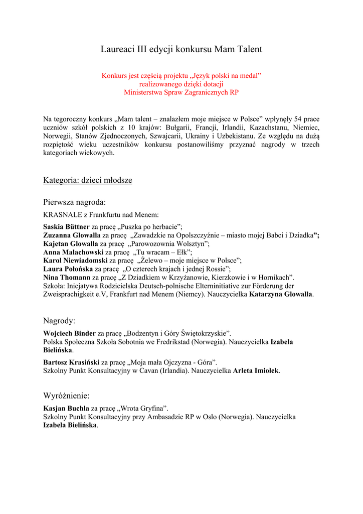 Laureaci III edycji konkursu Mam Talent Konkurs jest częścią projektu „Język polski na medal” realizowanego dzięki dotacji Ministerstwa Spraw Zagranicznych RP Na tegoroczny konkurs „Mam talent – znalazłem moje miejsce w Polsce” wpłynęły 54 prace uczniów szkół polskich z 10 krajów: Bułgarii, Francji, Irlandii, Kazachstanu, Niemiec, Norwegii, Stanów Zjednoczonych, Szwajcarii, Ukrainy i Uzbekistanu. Ze względu na dużą rozpiętość wieku uczestników konkursu postanowiliśmy przyznać nagrody w trzech kategoriach wiekowych. Kategoria: dzieci młodsze Pierwsza nagroda: KRASNALE z Frankfurtu nad Menem: Saskia Büttner za pracę „Puszka po herbacie”; Zuzanna Glowalla za pracę „Zawadzkie na Opolszczyźnie – miasto mojej Babci i Dziadka”; Kajetan Glowalla za pracę „Parowozownia Wolsztyn”; Anna Malachowski za pracę „Tu wracam – Ełk”; Karol Niewiadomski za pracę „Żelewo – moje miejsce w Polsce”; Laura Połońska za pracę „O czterech krajach i jednej Rossie”; Nina Thomann za pracę „Z Dziadkiem w Krzyżanowie, Kierzkowie i w Hornikach”. Szkoła: Inicjatywa Rodzicielska Deutsch-polnische Elterninitiative zur Förderung der Zweisprachigkeit e.V, Frankfurt nad Menem (Niemcy). Nauczycielka Katarzyna Glowalla. Nagrody: Wojciech Binder za pracę „Bodzentyn i Góry Świętokrzyskie”. Polska Społeczna Szkoła Sobotnia we Fredrikstad (Norwegia). Nauczycielka Izabela Bielińska. Bartosz Krasiński za pracę „Moja mała Ojczyzna - Góra”. Szkolny Punkt Konsultacyjny w Cavan (Irlandia). Nauczycielka Arleta Imiołek. Wyróżnienie: Kasjan Buchla za pracę „Wrota Gryfina”. Szkolny Punkt Konsultacyjny przy Ambasadzie RP w Oslo (Norwegia). Nauczycielka Izabela Bielińska. Docenienie za najładniejszą foto-prezentację: Antoni Szpak i Jan Szpak za pracę „Nasze miejsce w Polsce”. Polska Społeczna Szkoła Sobotnia we Fredrikstad (Norwegia). Nauczycielka Izabela Bielińska. Specjalne wyróżnienia za zapał do nauki języka polskiego dla: , Zuzanny Kozaczuk, Mai Mazurkiewicz Adama Mazurkiewicza, Jamala Titilayo z Polskiej Sobotniej Szkoły im. Kazimierza Pułaskiego w Atlancie (USA). Nauczyciele: Ewa Dorhmi, Dorota Miazek, Ania Sroka. i Wojciecha Topczewskiego z Polskiej Szkoły im. Mikołaja Kopernika w Mahwah, New Jersey (USA). Nauczycielka Danuta Świątek. Kategoria: dzieci starsze Pierwsza nagroda: Marcin Kroczak za pracę „Roztocze - Zwierzyniec - Wywłoczka”. Szkolny Punkt Konsultacyjny im. Wacława Micuty przy Stałym Przedstawicielstwie Rzeczypospolitej Polskiej przy Biurze NZ w Genewie (Szwajcaria). Nauczycielka Marta Urbaniec. Druga nagroda (ex aequo): Ida Mueller za pracę „Odkrywam moje polskie korzenie”. Szkolny Punkt Konsultacyjny przy Konsulacie RP w Kolonii z siedzibą Remseck (Niemcy). Nauczycielka Edyta Mitka-Matejko. Agata Krumova za pracę „Czerwony But” Szkolny Punkt Konsultacyjny przy Ambasadzie RP w Sofii z siedzibą w Warnie (Bułgaria). Nauczycielka Milka Wrangowa. Trzecia nagroda (ex aequo): Paulina Jezior za pracę „Firlej”. Szkolny Punkt Konsultacyjny im. A. Mickiewicza w Paryżu (Francja). Nauczycielka Agnieszka Sygowska-Kalmus. Aleksandra Materna za pracę ”Moje miasto Krosno”. Section Polonaise Collège Les Hauts Grillets w Saint Germain en Laye (Francja). Nauczycielka Agnieszka Sygowska-Kalmus. Wyróżnienia: Daria Dąbrowska za pracę „W czasie wakacji w Polsce odkryłam Kraków”. Szkoła przy Domu Polskim w Czkałowie (Kazachstan). Nauczyciel Krystian Furmanowicz. Maksymilian Kalinka za pracę „Ryglice”. Section Polonaise Collège Les Hauts Grillets w Saint Germain en Laye (Francja). Nauczycielka Agnieszka Sygowska-Kalmus. Kategoria: młodzież Nagroda pierwsza (ex aequo): Żanna Moskalczuk za pracę „Wrocław”. Szkoła Języka Polskiego przy Polskim Towarzystwie Kulturalno-Oświatowym w Tarnopolu (Ukraina). Nauczyciel Dariusz Markiewicz. Agatha Rozwadowska za pracę „Skąd pochodzę”. Szkolny Punkt Konsultacyjny im. A. Mickiewicza w Paryżu (Francja). Nauczycielka Agnieszka Sygowska-Kalmus. Nagroda druga: Anna Camkaya za pracę „Parczew - moja mała Ojczyzna”. Elisabethenschule, Frankfurt nad Menem (Niemcy). Nauczycielka Marta Tadrowski Wyróżnienia: Paulina Kalusa za pracę „ Polskie korzenie - Wrocław ”. Elisabethenschule, Frankfurt nad Menem (Niemcy). Nauczycielka Marta Tadrowski. Artur Kochan za pracę „Rogi - miejsce warte odwiedzenia”. Section Polonaise Collège Les Hauts Grillets w Saint Germain en Laye (Francja). Nauczycielka Agnieszka Sygowska-Kalmus. Diana Kuts za pracę „Łazienki Królewskie w Warszawie”. Polska Klasa w Taszkencie (Uzbekistan). Nauczyciel Daniel Zatorski. Karina Mazur za pracę „Opole, miasto bez granic”. Elisabethenschule, Frankfurt nad Menem (Niemcy). Nauczycielka Marta Tadrowski. Konrad Szewczyk za pracę „Warszawa nieznana” Elisabethenschule, Frankfurt nad Menem (Niemcy). Nauczycielka Marta Tadrowski. Anna Trang Zaborowska za pracę „Szczecin-Hanoi ”. Elisabethenschule, Frankfurt nad Menem (Niemcy). Nauczycielka Marta Tadrowski. Chcielibyśmy szczególnie podziękować: Pani Katarzynie Glowalli z Deutsch-polnische Elterninitiative zur Förderung der Zweisprachigkeit e.V we Frankfurcie nad Menem (Niemcy); Pani Agnieszce Sygowskiej-Kalmus, która uczy historii w Szkolnym Punkcie Konsultacyjnym im. A. Mickiewicza w Paryżu i w Section Polonaise Collège Les Hauts Grillets w Saint Germain en Laye (Francja) i Pani Marcie Tadrowski z Elisabethenschule we Frankfurcie nad Menem za wielki zaangażowanie w realizację konkursu. Laureaci konkursu otrzymają pocztą dyplomy i nagrody w postaci książek i wydawnictw multimedialnych. Najlepsze prezentacje zostaną opublikowane na płycie DVD zawierającej materiały III edycji konkursu „Mam Talent – znalazłem moje miejsce w Polsce”.