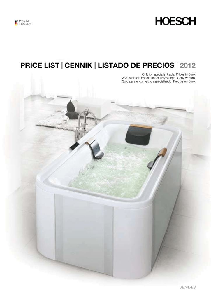 MADE IN GERMANY PRICE LIST | CENNIK | LISTADO DE PRECIOS | 2012 Only for specialist trade. Prices in Euro. Wyłącznie dla handlu specjalistycznego. Ceny w Euro. Sólo para el comercio especializado. Precios en Euro. GB/PL/ES | CONTENTS | SPIS TREŚCI | INDICE Models from A to Z | Modele od A-Z | Modelos de la A a la Z . . . . . . . . . . . . . . . . . . . . . . . . . . . . . . . . . . . . . . . . . . . . FORM AND DIMENSIONS | Kształt i wymiar | Forma y tamaño . . . . . . . . . . . . . . . . . . . . . . . . . . . . . . . . . . . . . . . . . . Bathtubs | Wanny kąpielowe | Bañeras . . . . . . . . . . . . . . . . . . . . . . . . . . . . . . . . . . . . . . . . . . . . . . . . . . . . . . . . . . . . . . . . . Whirlpools | Baseny z hydromasażem | Mini-Piscinas. . . . . . . . . . . . . . . . . . . . . . . . . . . . . . . . . . . . . . . . . . . . . . . . . . . . . . . Steam Cabins | Kabiny parowe | Baños De Vapor . . . . . . . . . . . . . . . . . . . . . . . . . . . . . . . . . . . . . . . . . . . . . . . . . . . . . . . . . Shower Partitions | Kabiny prysznicowe | Mamparas De Ducha. . . . . . . . . . . . . . . . . . . . . . . . . . . . . . . . . . . . . . . . . . . . . . . Shower trays | Brodziki | Platos De Ducha . . . . . . . . . . . . . . . . . . . . . . . . . . . . . . . . . . . . . . . . . . . . . . . . . . . . . . . . . . . . . . . 4-5 6-13 6 9 10 11 12 Legend | Legenda | Leyenda . . . . . . . . . . . . . . . . . . . . . . . . . . . . . . . . . . . . . . . . . . . . . . . . . . . . . . . . . . . . . . . . . . . . . . . 14 Versions | Warianty | Variantes . . . . . . . . . . . . . . . . . . . . . . . . . . . . . . . . . . . . . . . . . . . . . . . . . . . . . . . . . . . . . . . . . . . . . 14 Pricing groups | Grupy cenowe | Grupos de precios . . . . . . . . . . . . . . . . . . . . . . . . . . . . . . . . . . . . . . . . . . . . . . . . . . . 15 Materials | Nasze materiały | Nuestros materiales . . . . . . . . . . . . . . . . . . . . . . . . . . . . . . . . . . . . . . . . . . . . . . . . . . . . . 15 Colour overview | Przegląd kolorów | Vista general de colores. . . . . . . . . . . . . . . . . . . . . . . . . . . . . . . . . . . . . . . . . . . 16 Order references | Wskazówki dot. zamówień | Indicaciones para el pedido . . . . . . . . . . . . . . . . . . . . . . . . . . . . . . . 17-19 Bathtubs/Whirltubs | Wanny kąpielowe/ Wanny kąpielowe z hydromasażem | Bañeras/Bañeras de hidromasaje Water Lounge . . . . . . . . . . . . . . . . . . . . . . . . . . . . . . . . . . . . . . . . . . . . . . . . . . . . . . . . . . . . . . . . . . . . . . . . . . . . . . . . . . . . Ergo+ . . . . . . . . . . . . . . . . . . . . . . . . . . . . . . . . . . . . . . . . . . . . . . . . . . . . . . . . . . . . . . . . . . . . . . . . . . . . . . . . . . . . . . . . . . . Freestanding bathtubs | Wanny wolnostojące | Bañeras exentas . . . . . . . . . . . . . . . . . . . . . . . . . . . . . . . . . . . . . . . . . . . . . . Oval bathtubs | Wanny owalne | Bañeras ovaladas . . . . . . . . . . . . . . . . . . . . . . . . . . . . . . . . . . . . . . . . . . . . . . . . . . . . . . . . Circular bathtubs | Wanny okrągłe | Bañeras redondas . . . . . . . . . . . . . . . . . . . . . . . . . . . . . . . . . . . . . . . . . . . . . . . . . . . . . Semicircular bathtubs | Wanny półokrągłe/przyścienne | Bañeras semirredondos/Adosados a pared . . . . . . . . . . . . . . . . . . Rectangular bathtubs | Wanny prostokątne | Bañeras rectangulares . . . . . . . . . . . . . . . . . . . . . . . . . . . . . . . . . . . . . . . . . . . Trapezoidal bathtubs | Wanny trapezowe | Bañeras trapezoidales . . . . . . . . . . . . . . . . . . . . . . . . . . . . . . . . . . . . . . . . . . . . . Corner bathtubs | Wanny narożne | Bañeras de esquina . . . . . . . . . . . . . . . . . . . . . . . . . . . . . . . . . . . . . . . . . . . . . . . . . . . . Hexagonal/Octogonal bathtubs | Wanny 6-cio/8-miokątne | Bañeras hexagonales/octágonales . . . . . . . . . . . . . . . . . . . . . Special accessories for bathtubs | Akcesoria do wanien | Accesorios para bañeras . . . . . . . . . . . . . . . . . . . . . . . . . . . . . . . 21-120 21 25 31 41 55 59 63 89 95 107 117 Whirl systems | Systemy hydromasażu | Sistemas de hidromasaje . . . . . . . . . . . . . . . . . . . . . . . . . . . . . . . . . . . . . . . Deluxe . . . . . . . . . . . . . . . . . . . . . . . . . . . . . . . . . . . . . . . . . . . . . . . . . . . . . . . . . . . . . . . . . . . . . . . . . . . . . . . . . . . . . . . . . . Reviva II . . . . . . . . . . . . . . . . . . . . . . . . . . . . . . . . . . . . . . . . . . . . . . . . . . . . . . . . . . . . . . . . . . . . . . . . . . . . . . . . . . . . . . . . . Laola II . . . . . . . . . . . . . . . . . . . . . . . . . . . . . . . . . . . . . . . . . . . . . . . . . . . . . . . . . . . . . . . . . . . . . . . . . . . . . . . . . . . . . . . . . . Customer preferences | Życzenia klientów | Deseos especiales del cliente . . . . . . . . . . . . . . . . . . . . . . . . . . . . . . . . . . . . . . . 121-132 124 128 130 132 Whirlpools | Baseny z hydromasażem | Mini-piscinas . . . . . . . . . . . . . . . . . . . . . . . . . . . . . . . . . . . . . . . . . . . . . . . . . . 133-140 Steam cabins | Kabiny parowe | Baños de vapor . . . . . . . . . . . . . . . . . . . . . . . . . . . . . . . . . . . . . . . . . . . . . . . . . . . . . . 141-153 Shower partitions | Kabiny prysznicowe | Mamparas de ducha . . . . . . . . . . . . . . . . . . . . . . . . . . . . . . . . . . . . . . . . . . 155-164 Shower trays | Brodziki | Platos de ducha cuadrados . . . . . . . . . . . . . . . . . . . . . . . . . . . . . . . . . . . . . . . . . . . . . . . . . . Square shower trays | Brodziki kwadratowe | Platos de ducha cuadrados . . . . . . . . . . . . . . . . . . . . . . . . . . . . . . . . . . . . . . . Rectangular shower trays | Brodziki prostokątne | Platos de ducha rectángulos . . . . . . . . . . . . . . . . . . . . . . . . .