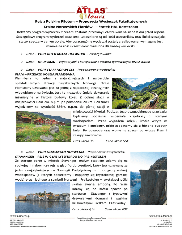 Rejs z Polskim Pilotem – Propozycja Wycieczek Fakultatywnych Kraina Norweskich Fiordów – Statek HAL Rotterdam Dokładny program wycieczek z cenami zostanie przesłany uczestnikom na siedem dni przed rejsem. Szczegółowy program wycieczek oraz cena uzależnione są od ilości uczestników oraz ilości czasu jaką statek spędza w danym porcie. Aby poszczególne wycieczki zostały zrealizowane, wymagana jest minimalna ilość uczestników określona dla każdej wycieczki. 1. Dzień - PORT ROTTERDAM HOLANDIA – Zaokrętowanie 2. Dzień - NA MORZU – Wypoczynek i korzystanie z atrakcji oferowanych przez statek 3. Dzień - PORT FLAM NORWEGIA – Proponowana wycieczka: FLAM – PRZEJAZD KOLEJĄ FLAMSBANĄ Flamsbana to jedna z najważniejszych i najbardziej spektakularnych atrakcji turystycznych Norwegii. Trasa Flamsbany uznawana jest za jedną z najbardziej atrakcyjnych widowiskowo na świecie. Jest to niezwykle śmiałe dokonanie inżynieryjne w historii budowy kolei. Z dolnej stacji w miejscowości Flam 2m. n.p.m. po pokonaniu 20 km. i 20 tuneli wyjedziemy na wysokość 866m. n.p.m. do górnej stacji w miejscowości Myrdal. Podczas tego dwugodzinnego przejazdu będziemy podziwiać wspaniałe krajobrazy z licznymi wodospadami. Przed wyjazdem kolejki, krótka wizyta w muzeum Flamsbany, gdzie zapoznamy się z historią budowy kolei. Po powrocie czas wolny na spacer po wiosce Flam i zakupy suwenirów. Czas około 3h Cena około 55€ 4. Dzień - PORT STAVANGER NORWEGIA – Proponowana wycieczka: STAVANGER – REJS W GŁĄB LYSEFIORDU DO PREIKESTOLEN Ze starego portu w mieście Stavanger, małym statkiem udamy się na spokojny i malowniczy rejs w głąb fiordu Lysefjord, który jest uznawany za jeden z najpiękniejszych w Norwegii. Podpłyniemy m. in. do groty skalnej, wodospadów (z których nabierzemy i napijemy się krystalicznej górskiej wody) oraz jednego z symboli Norwegii Preikestolen – wystającej półki skalnej zwanej amboną. Po rejsie udamy się na krótki spacer po starówce Stavanger z typowymi drewnianymi domami i wąskimi brukowanymi uliczkami. Czas wolny. Czas około 4,5h Cena około 60€ 5. Dzień - PORT KRISTIANSAND NORWEGIA – Proponowana wycieczka: KRISTIANSAND SPACER PO CENTRUM MIASTA Kristiansand to piąte pod względem wielkości miasto Norwegii i nieoficjalna stolica jej południowego wybrzeża. W 1639 roku, król Danii i Norwegii Chrystian IV, zapragnął założyć miasto i nazwać je swoim imieniem. Miejsce wybrano niezwykle rozważnie. Kristiansand stanęło w strategicznym punkcie, z którego można było kontrolować dostęp do Morza Północnego i Bałtyckiego. W trakcie spaceru z lokalnym polskim przewodnikiem zobaczymy m. in. nabrzeże portowe z twierdzą obronną. Przejdziemy przez starówkę z malowniczymi, kolorowymi domami. Odwiedzimy neogotycką katedrę oraz główny plac i deptak miasta. Czas wolny. Czas około 2h Cena około 10€ 6. Dzień - PORT OSLO NORWEGIA – Proponowana wycieczka: OSLO – ZWIEDZANIE MIASTA ORAZ SKOCZNIA HOLMENKOLLEN Zwiedzania stolicy Norwegii (z lokalnym polskojęzycznym przewodnikiem) rozpoczniemy od przejazdu do słynnej skoczni narciarskiej Holmenkollen. Następnie, po krótkim postoju na punkcie widokowym z panoramą miasta zobaczymy jedną z najczęściej odwiedzanych atrakcji Norwegii – Park Gustawa Vigelanda. Po powrocie do centrum zobaczymy m. in. ratusz miejski, gdzie co roku wręczana jest Pokojowa Nagroda Nobla, zamek królewski, parlament, nowoczesny budynek opery oraz stare miasto. Po zwiedzaniu będzie czas wolny na zakupy typowych norweskich pamiątek. Czas około 5h Cena około 50€ 7. Dzień - NA MORZU – Wypoczynek i korzystanie z atrakcji oferowanych przez statek 8. Dzień - ROTTERDAM HOLANDIA Proponowana wycieczka: AMSTERDAM - ZWIEDZANIE STOLICY HOLANDII ORAZ REJS ŁODZIĄ PO KANAŁACH Po spotkaniu w porcie w Rotterdamie z lokalnym polskojęzycznym przewodnikiem, przejedziemy do Amsterdamu, stolicy Holandii. Podczas zwiedzania miasta w pierwszej część naszej wycieczki odbędziemy panoramiczny przejazd autokarem przez najciekawsze dzielnice m.in. Dam Square, Centraal Station oraz XVII wieczne centrum. W drugiej części wycieczki pospacerujemy przez dzielnicę chińską oraz przez tzw. Red Light District (Dzielnicę Czerwonych Latarni), zobaczymy także okolice Waterlooplein - cześć dawnej dzielnicy żydowskiej. W programie także czas wolny w okolicach targu kwiatowego Singel oraz relaksujący, godzinny rejs przeszkloną łodzią po najpiękniejszych kanałach Amsterdamu. Przejazd na lotnisko i wylot do kraju. Czas około 6h Cena około 60€ *Opublikowane w materiałach informacje nie stanowią oferty handlowej w rozumieniu Kodeksu Cywilnego ** Propozycje wycieczek fakultatywnych są realizowane przez lokalne podmioty