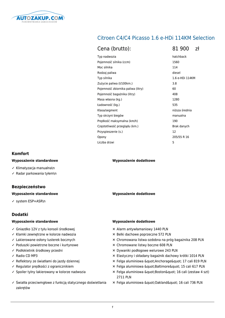Citroen C4/C4 Picasso 1.6 e-HDi 114KM Selection Cena (brutto): 81 900 Typ nadwozia hatchback Pojemność silnika (ccm) 1560 Moc silnika 114 Rodzaj paliwa diesel Typ silnika 1.6 e-HDi 114KM Zużycie paliwa (l/100km.) 3.8 Pojemność zbiornika paliwa (litry) 60 Pojemność bagażnika (litry) 408 Masa własna (kg.) 1280 Ładowność (kg.) 535 Klasa/segment niższa średnia Typ skrzyni biegów manualna Prędkość maksymalna (km/h) 190 Częstotliwość przeglądu (km.) Brak danych Przyspieszenie (s.) 12 Opony 205/55 R 16 Liczba drzwi 5 zł Komfort Wyposażenie standardowe Wyposażenie dodatkowe ✓ Klimatyzacja manualna\n ✓ Radar parkowania tyłem\n Bezpieczeństwo Wyposażenie standardowe Wyposażenie dodatkowe ✓ system ESP+ASR\n Dodatki Wyposażenie standardowe Wyposażenie dodatkowe ✓ Gniazdko 12V z tyłu konsoli środkowej ✕ Alarm antywłamaniowy 1440 PLN ✓ Klamki zewnętrzne w kolorze nadwozia ✕ Belki dachowe poprzeczne 572 PLN ✓ Lakierowane osłony lusterek bocznych ✕ Chromowana listwa ozdobna na próg bagażnika 208 PLN ✓ Poduszki powietrzne boczne i kurtynowe ✕ Chromowane listwy boczne 608 PLN ✓ Podłokietnik środkowy przedni ✕ Dywaniki podłogowe welurowe 243 PLN ✓ Radio CD MP3 ✕ Elastyczny i składany bagażnik dachowy krótki 1014 PLN ✓ Reflektory ze światłami do jazdy dziennej ✕ Felga aluminiowa "Anchorage" 17 cali 819 PLN ✓ Regulator prędkości z ogranicznikiem ✕ Felga aluminiowa "Baltimore" 15 cali 617 PLN ✓ Spoiler tylny lakierowany w kolorze nadwozia ✕ Felga aluminiowa "Boston" 16 cali (zestaw 4 szt) ✓ Światła przeciwmgłowe z funkcją statycznego doświetlania ✕ Felga aluminiowa "Oakland" 16 cali 736 PLN 2711 PLN zakrętów 1 ✓ Szyby tylne sterowane elektrycznie z blokadą ✕ Hak holowniczy typu '' łabędzia antyprzytrzaskową szyja'' 950 PLN ✓ zamek centralny sterowany pilotem ✕ Kufrowy bagażnik dachowy krótki 1292 PLN ✓ Zestaw wskaźników z wyświetlaczem cyfrowym ✕ Lakier metalizowany 1950 PLN ✕ Moduł Wi-Fi 2059 PLN ✕ Nakładki progowe o wyglądzie grafitu z logo "C4" 185 PLN ✕ Tapicerka materiałowa Hermitage jasna 0 PLN ✕ Wykładzina z przegródkami do bagażnika 613 PLN Doprecyzowanie oferty Kontakt: Nazwa użytkownika: admin Nazwa firmy: qqq Adres: qqq 12, 41-706 qqq1, NIP: 954 REGON: 1 Telefon: 123, 1 Fax: 1 Email: 1 www: 2