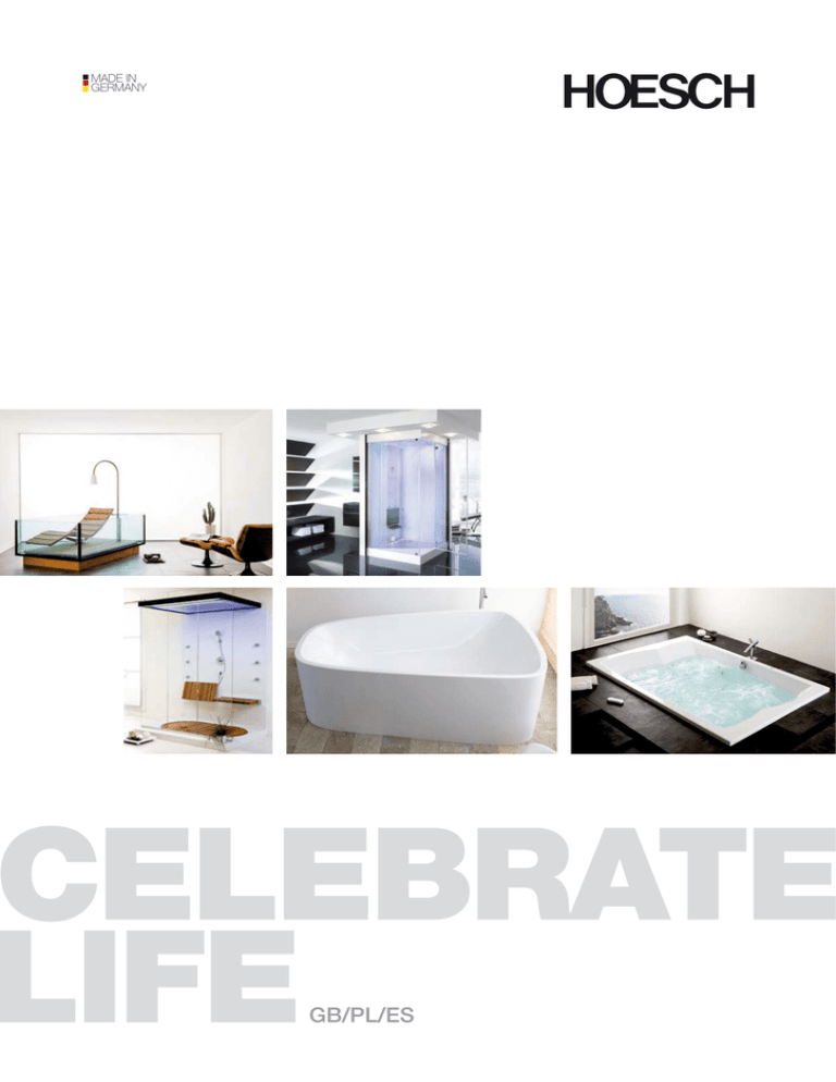 MADE IN GERMANY '"0,%3 WELCOME TO THE BEAUTIFUL WORLD OF SENSES. WITAMY W PIĘKNYM ŚWIECIE ZMYSŁÓW! BIENVENIDOS AL MARAVILLOSO MUNDO DE LOS SENTIDOS. 3 Company O firmie La empresa Philosophy Nasza filozofia La filosofía 10 Design Design El diseño 12 CELEBRATE STYLE 4 8 14 – 93 Freestanding bathtubs Wanny wolnostjące Bañeras exentas 16 Oval and circular bathtubs Wanny owalne i okrągłe Bañeras ovaladas y redondas 42 Semi-circular/wall bathtubs Wanny półokrągłe i przyścienne Bañeras semicirculares/adosadas 52 Corner bathtubs Wanny narożne Bañeras de rincón 56 Rectangular bathtubs Wanny prostokątne Bañeras rectangulares 66 Hexagonal bathtubs Wanny sześciokątne Bañeras hexagonales 82 Shower trays Brodziki Platos de ducha 86 CELEBRATE EMOTION Showering and steaming Prysznic i Kąpiel parowa Duchas y vapor 94 – 105 96 TECHNICAL DETAILS 138 – 177 DANE TECHNICZNE CELEBRATE WELLNESS 106 – 137 DESCRIPCIONES TÉCNICAS Whirl baths Wanny z hydromasażem Bañeras de hidromasaje 108 Quality Jakość Calidad 138 Innovative whirl technology Innowacyjna technika hydromasażu Técnica innovadora de hidromasaje 110 Care Pielęgnacja Cuidado 140 Whirl systems Deluxe Systemy hydromasażu Deluxe Sistemas idromassaggio Deluxe 112 Special accessories Wyposażenie dodatkowe Accesorios especiales 142 Extras vor Deluxe whirl systems Dodatki do systemów hydromasażu Deluxe Accesorios para los sistemas Deluxe 114 Colours Kolory Colores 144 Whirl programmes Deluxe Programy hydromasażu Deluxe Programmi idromassaggio Deluxe 116 Bath tubs index Indeksy wanien i form Indice de formas de las bañeras 145 Whirl systems Reviva Systemy hydromasażu Reviva Sistemas idromassaggio Reviva 118 Whirl systems overview Przegląd systemów hydromasażu Cuadro general de los sistemas de hidromasaje 146 Whirl systems Laola Systemy hydromasażu Laola Sistemas idromassaggio Laola 122 Whirl system tub overview Przegląd wanien z hydromasażem Baños de vapor Vista general 152 Ergopools Ergopoole Ergopools 124 HOESCH worldwide HOESCH na świecie HOESCH en todo el mundo) 154 Compact model whirlpools Minibaseny z hydromasażem w wersji kompaktowe Mini-piscinas en versión compacta 134 Technical Index Załącznik techniczny Anexo técnico 157 Whirlpools Minibaseny z hydromasażem w wersji modułowej Mini-piscinas 136 5 MODELS FROM A – Z MODELE A – Z MODELOS DE A – Z Alabama Page Strona Strona Página Página 137 Ontario 122 42 /54 /56 Oriental 81 70 /112 Orlando 51 Ciela 102 Putman 16 /18 Colorado 136 Santee Aviva ® Avventura 68 Dreamscape 38 /40 Scelta Foster 26 /66 SensaMare 32 /93 /98 60 Giorno Happy D. Largo 44 /46 /63 /78 /79 /82 SenseEase 96 52 /62 SingleBath Duo 28 48 /76 /108 /123 SingleBath Uno 30 Lima 91 Maxi 34 /58 /80 /84 Starck 1 20 /22 47 Starck 2 24 Starck 90 36 /64 Squadra 65 130 /132 Thasos II 86 /88 Medici Michigan Midi Missouri Nova 128 Modula® 74 Montana 137 Nevada 6 Page 134 SingleBath Waikiki Winnipeg ® Zero 92 /100 50 126 72 7 8 [ GB ] More than 250 years of tradition are the strong roots that anchor us. They are what the enduring values embodied by our bathroom culture are based on: HOESCH has created its quality image with aesthetics, innovation and functionality. We are committed to this claim, and will remain so in the future. [ PL ] Ponad 250 lat tradycji to nasze mocne korzenie. Właśnie na nich opierają się nasze ponadczasowe wartości, charakterystyczne dla naszej kultury kąpieli: estetyka, innowacyjność i funkcjonalność to elementy, dzięki którym firma HOESCH stworzyła swój wizerunek oparty na dobrej jakości. To wymóg będący dla nas zobowiązaniem. Także w przyszłości. [ ES ] Más de 250 años de tradición componen las robustas raíces que nos sustentan. Sobre ellas se basan los intemporales valores que impregnan nuestra cultura del baño: de estética, funcionalidad e innovación se ha valido HOESCH para erigir su imagen de calidad. Para nosotros, esta reivindicación supone un compromiso, también en el futuro. 9 10 [ GB ] Water is life, the origin of all being: it shows us, with crystal clarity, how important naturalness is for our wellbeing. Enjoy the whole fascination of water – revitalising, regenerating, cleansing, relaxing. Multiple awardwinning HOESCH design refines the bathing experience. [ PL ] Woda to życie. Początek wszelkiego bytu: W swojej przejrzystości ukazuje nam jak ważna dla naszego dobrego samopoczucia jest naturalność. Delektuj się fascynującą wodą, która ożywia, regeneruje, oczyszcza, odpręża. Wielokrotnie nagrodzone wzornictwo HOESCH nadaje łazienkom szlachetny wygląd. [ ES ] El agua es la vida, el origen de toda existencia. Con total claridad, nos muestra cuán importante es lo natural para nuestro bienestar. Ríndase ante la poderosa fascinación del agua, vivificándose, regenerándose, purificándose, relajándose. El diseño de HOESCH, reiteradamente premiado, convierte el cuarto de baño en una excitante experiencia. 11 12 MADE IN GERMANY [ GB ] Design is perfected form and function. Design is a life philosophy for the discerning. Design adds aesthetic individuality to the living space of the bathroom. Internationally renowned designers design creative bathroom innovations for HOESCH – perfect in form and technology, and many of them award-winners. [ PL ] Design to forma i funkcja doprowadzone do perfekcji. Design to filozofia życia dla wymagających. Design nadaje pomieszczeniu mieszkalnemu, jakim jest łazienka, estetyczną indywidualność. Designerzy o międzynarodowej renomie projektują dla firmy HOESCH innowacyjne łazienki– perfekcyjne w swojej formie i technologii, które uzyskały liczne nagrody. [ ES ] El diseño es el perfeccionamiento de forma y función. El diseño es una filosofía de vida para personas exigentes. El diseño confiere individualidad estética a la estancia destinada al baño. Diseñadores de prestigio internacional conciben creativas innovaciones para los baños de HOE