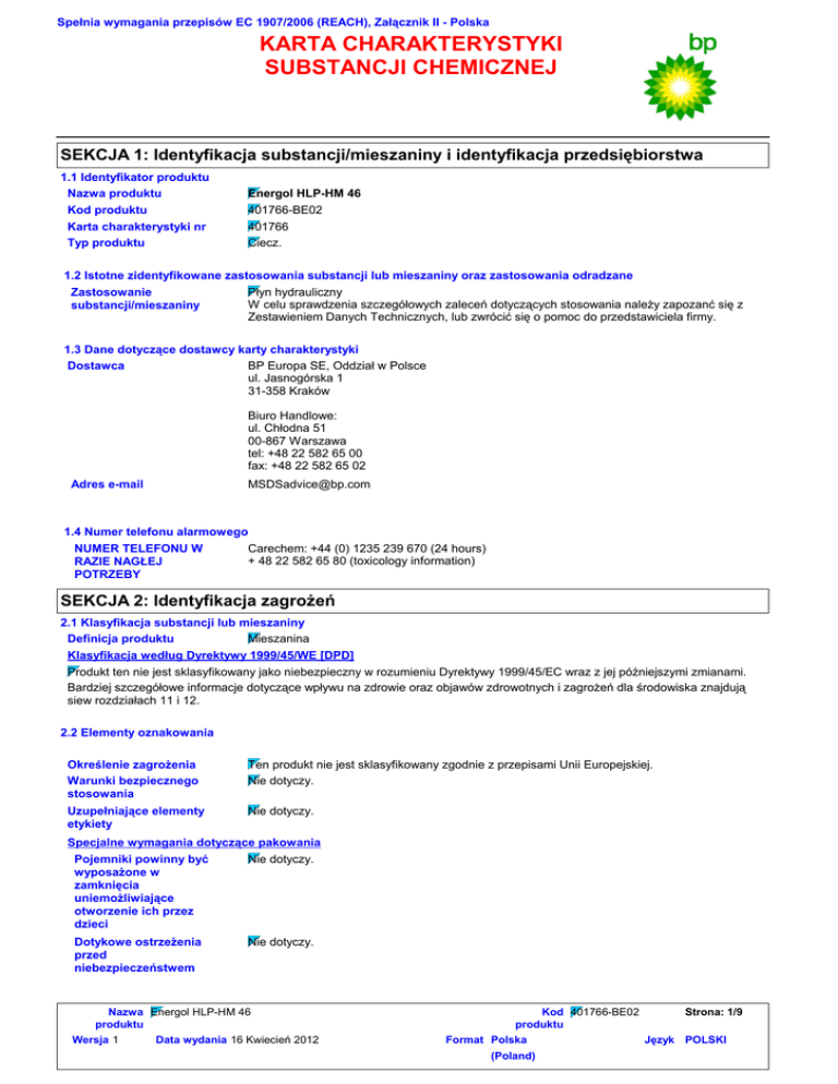 Spełnia wymagania przepisów EC 1907/2006 (REACH), Załącznik II - Polska KARTA CHARAKTERYSTYKI SUBSTANCJI CHEMICZNEJ SEKCJA 1: Identyfikacja substancji/mieszaniny i identyfikacja przedsiębiorstwa 1.1 Identyfikator produktu Nazwa produktu Kod produktu Karta charakterystyki nr Typ produktu Energol HLP-HM 46 401766-BE02 401766 Ciecz. 1.2 Istotne zidentyfikowane zastosowania substancji lub mieszaniny oraz zastosowania odradzane Zastosowanie Płyn hydrauliczny W celu sprawdzenia szczegółowych zaleceń dotyczących stosowania należy zapozanć się z substancji/mieszaniny Zestawieniem Danych Technicznych, lub zwrócić się o pomoc do przedstawiciela firmy. 1.3 Dane dotyczące dostawcy karty charakterystyki Dostawca BP Europa SE, Oddział w Polsce ul. Jasnogórska 1 31-358 Kraków Biuro Handlowe: ul. Chłodna 51 00-867 Warszawa tel: +48 22 582 65 00 fax: +48 22 582 65 02 Adres e-mail [email protected] 1.4 Numer telefonu alarmowego NUMER TELEFONU W Carechem: +44 (0) 1235 239 670 (24 hours) + 48 22 582 65 80 (toxicology information) RAZIE NAGŁEJ POTRZEBY SEKCJA 2: Identyfikacja zagrożeń 2.1 Klasyfikacja substancji lub mieszaniny Definicja produktu Mieszanina Klasyfikacja według Dyrektywy 1999/45/WE [DPD] Produkt ten nie jest sklasyfikowany jako niebezpieczny w rozumieniu Dyrektywy 1999/45/EC wraz z jej późniejszymi zmianami. Bardziej szczegółowe informacje dotyczące wpływu na zdrowie oraz objawów zdrowotnych i zagrożeń dla środowiska znajdują siew rozdziałach 11 i 12. 2.2 Elementy oznakowania Określenie zagrożenia Warunki bezpiecznego stosowania Ten produkt nie jest sklasyfikowany zgodnie z przepisami Unii Europejskiej. Nie dotyczy. Uzupełniające elementy etykiety Nie dotyczy. Specjalne wymagania dotyczące pakowania Pojemniki powinny być Nie dotyczy. wyposażone w zamknięcia uniemożliwiające otworzenie ich przez dzieci Dotykowe ostrzeżenia przed niebezpieczeństwem Nie dotyczy. Nazwa Energol HLP-HM 46 produktu Wersja 1 Data wydania 16 Kwiecień 2012 Kod 401766-BE02 produktu Format Polska (Poland) Strona: 1/9 Język POLSKI Spełnia wymagania przepisów EC 1907/2006 (REACH), Załącznik II - Polska SEKCJA 2: Identyfikacja zagrożeń 2.3 Inne zagrożenia Inne zagrożenia nie odzwierciedlone w klasyfikacji Działa odtłuszczająco na skórę. Uwaga: wysokie ciśnienie. Injekcja podskórna, spowodowana kontaktem z produktem pod wysokim ciśnieniem, wymaga natychmiastowej pomocy medycznej. Patrz "Informacje dla lekarza" w punkcie Środki pierwszej pomocy, rozdział 4 niniejszej Karty Bezpieczeństwa Produktu. SEKCJA 3: Skład/informacja o składnikach Substancja/Preparat Mieszanina Wysoko rafinowany olej bazowy (IP 346, ekstrakt DMSO poniżej 3%) cechy produktu. Prawnie zastrzeżony dodatkowy składnik wpływający na Klasyfikacja Nazwa produktu/składnika 2,6-di-t-butylofenol Identyfikatory WE: 204-884-0 CAS: 128-39-2 % <0.25 67/548/EWG Xi; R38 N; R50/53 Rozporządzenie (WE) Nr 1272/2008 [CLP] Typ Skin Irrit. 2, H315 Aquatic Acute 1, H400 Aquatic Chronic 1, H410 [1] Patrz Sekcja 16 - pełny tekst zadeklarowanych wyżej Fraz-R. Typ [1] Substancja sklasyfikowana jako szkodliwa dla zdrowia lub środowiska [2] Substancja, dla której wyznaczono dopuszczalne stężenie w środowisku pracy [3] Substancja spełnia kryteria dla jej zaklasyfikowania jako PBT zgodnie z Rozporządzeniem (WE) Nr 1907/2006, Aneks XIII [4] Substancja spełnia kryteria dla jej zaklasyfikowania jako vPvB zgodnie z Rozporządzeniem (WE) Nr 1907/2006, Aneks XIII Najwyższe dopuszczalne stężenia, jeśli są dostępne, wymienione są wymienione w części 8. SEKCJA 4: Środki pierwszej pomocy 4.1 Opis środków pierwszej pomocy Kontakt z okiem W przypadku kontaktu, niezwłocznie przemywać oczy dużą ilością wody, przez co najmniej 15 minut. Powieki powinny być przytrzymane z daleka od gałek ocznych w celu zapewnienia dokładnego przemycia. Usunąć szkła kontaktowe jeżeli są. Zasięgnąć porady medycznej. Kontakt ze skórą Skórę należy myć dokładnie wodą z mydłem lub stosować sprawdzony środek do mycia skóry. Zdjąć skażoną odzież i buty. Uprać odzież przed ponownym użyciem. Wyczyścić dokładnie buty przed ponownym założeniem. W przypadku nasilenia podrażnenia, należy skorzystać z pomocy lekarskiej. Wdychanie Spożycie Ochrona osób udzielających pierwszej pomocy Jeżeli wdychano substancję, wyjść na świeże powietrze. Jeśli pojawią się objawy, należy skorzystać z pomocy lekarskiej. Nie wywoływać wymiotów, jeśli nie jest to zalecane przez personel medyczny. Jeśli pojawią się objawy, zasięgnąć porady lekarskiej. Nie należy podejmować żadnych działań, które stwarzałyby ryzyko dla kogokolwiek chyba, że jest się odpowiednio przeszkolonym. 4.2 Najważniejsze ostre i opóźnione objawy oraz skutki narażenia Bardziej szczegółowe informacje dotyczące wpływu na stan zdrowia oraz ewentualnych objawów można znaleźć w rozdziale 11. 4.3 Wskazania dotyczące wszelkiej natychmiastowej pomocy lekarskiej i szczególnego postępowania z poszkodowanym Informacje dla lekarza Leczenie powinno być objawowe i ukierunkowane na usuwanie wszelkich skutków. Uwaga: do zastosowań wysoko-ciśnieniowych Wstrzyknięcie pod skórę na skutek zetknięcia z produktem będącym pod wysokim ciśnieniem jest poważnym zagrożeniem dla stanu zdrowia. Obrażenia mogą wydawać się początkowo niegroźne, jednak w ciągu kilku godzin tkanki puchną, zmieniają kolor i stają się bardzo bolesne z rozległą martwicą podskórną. Należy niezwłocznie przeprowadzić rozpoznanie chirurgiczne. W celu minimalizacji utraty tkanki oraz ograniczenia trwałych uszkodzeń konieczne jest dokładne oczyszczenie rany oraz przyległych tkanek. Należy mieć na uwadze, że wysokie ciśnienie może wtłoczyć produkt na znaczne głębokości poprzez kolejne warstwy tkanek. Nazwa Energol HLP-HM 46 produktu Wersja 1 Data wydania 16 Kwiecień 2012 Kod 401766-BE02 produktu Format Polsk