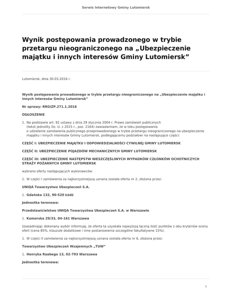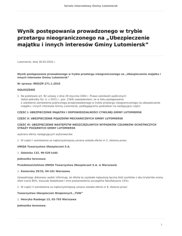 Serwis Internetowy Gminy Lutomiersk Wynik postępowania prowadzonego w trybie przetargu nieograniczonego na „Ubezpieczenie majątku i innych interesów Gminy Lutomiersk” Lutomiersk, dnia 30.03.2016 r. Wynik postępowania prowadzonego w trybie przetargu nieograniczonego na „Ubezpieczenie majątku i innych interesów Gminy Lutomiersk” Nr sprawy: RRGiZP.271.1.2016 OGŁOSZENIE 1. Na podstawie art. 92 ustawy z dnia 29 stycznia 2004 r. Prawo zamówień publicznych (tekst jednolity Dz. U. z 2015 r., poz. 2164) zawiadamiam, że w toku postępowania o udzielenie zamówienia publicznego przeprowadzonego w trybie przetargu nieograniczonego na ubezpieczenie majątku i innych interesów Gminy Lutomiersk, podlegającemu podziałowi na następujące części: CZĘŚĆ I: UBEZPIECZENIE MAJĄTKU I ODPOWIEDZIALNOŚCI CYWILNEJ GMINY LUTOMIERSK CZĘŚĆ II: UBEZPIECZENIE POJAZDÓW MECHANICZNYCH GMINY LUTOMIERSK CZĘŚĆ III: UBEZPIECZENIE NASTĘPSTW NIESZCZĘŚLIWYCH WYPADKÓW CZŁONKÓW OCHOTNICZYCH STRAŻY POŻARNYCH GMINY LUTOMIERSK wybrano oferty następujących wykonawców: 1. W części I zamówienia za najkorzystniejszą uznana została oferta nr 2, złożona przez: UNIQA Towarzystwo Ubezpieczeń S.A. 1. Gdańska 132, 90-520 Łódź Jednostka terenowa: Przedstawicielstwo UNIQA Towarzystwa Ubezpieczeń S.A. w Warszawie 1. Komorska 29/33, 04-161 Warszawa Uzasadniając dokonany wybór informuję, że oferta ta uzyskała najwyższą łączną ilość punktów z obu kryteriów oceny ofert (cena 85%, klauzule dodatkowe i inne postanowienia szczególne fakultatywne 15%). 1. W części II zamówienia za najkorzystniejszą uznana została oferta nr 6, złożona przez: Towarzystwo Ubezpieczeń Wzajemnych „TUW” 1. Henryka Raabego 13, 02-793 Warszawa Jednostka terenowa: 1 Serwis Internetowy Gminy Lutomiersk Biuro Regionalne w Łodzi Oddział w Kutnie 1. Zduńska nr 9, 99-300 Kutno Uzasadniając dokonany wybór informuję, że oferta ta uzyskała najwyższą łączną ilość punktów z obu kryteriów oceny ofert (cena 90%, klauzule dodatkowe i inne postanowienia szczególne fakultatywne 10%). 1. W części III zamówienia za najkorzystniejszą uznana została oferta nr 2, złożona przez: UNIQA Towarzystwo Ubezpieczeń S.A. 1. Gdańska 132, 90-520 Łódź Jednostka terenowa: Przedstawicielstwo UNIQA Towarzystwa Ubezpieczeń S.A. w Warszawie 1. Komorska 29/33, 04-161 Warszawa Uzasadniając dokonany wybór informuję, że oferta ta uzyskała najwyższą łączną ilość punktów z obu kryteriów oceny ofert (cena 90%, klauzule dodatkowe i inne postanowienia szczególne fakultatywne 10%). 1. Zgodnie z art. 91 ust. 1 ustawy z dnia 29 stycznia 2004 r. Prawo zamówień publicznych (tekst jednolity Dz. U. z 2015 r., poz. 2164) zamawiający wybiera ofertę najkorzystniejszą na podstawie kryteriów oceny ofert, określonych w specyfikacji istotnych warunków zamówienia. Kryterium wyboru ofert dla I części zamówienia była cena – waga 85% oraz klauzule dodatkowe i inne postanowienia szczególne fakultatywne – waga 15%. Kryterium wyboru ofert dla II części zamówienia była cena – waga 90% oraz klauzule dodatkowe i inne postanowienia szczególne fakultatywne – waga 10%. Kryterium wyboru ofert dla III części zamówienia była cena – waga 90% oraz klauzule dodatkowe i inne postanowienia szczególne fakultatywne – waga 10%. III. W terminie zgodnym ze specyfikacją istotnych warunków zamówienia złożone zostały następujące oferty, które otrzymały łączną ilość punktów, zgodnie z poniższym: Część I zamówienia Numer oferty Firma Wykonawcy Liczba punktów za cenę Liczba punktów za warunki fakultatywne Łączna liczba punktów 1 Towarzystwo Ubezpieczeń INTER Polska S.A. Al. Jerozolimskie 172, 02-486 Warszawa Jednostka terenowa: Oddział w Poznaniu ul. Strzelecka 49, 61-846 Poznań 57,62 6,45 64,07 2 UNIQA Towarzystwo Ubezpieczeń S.A. ul. Gdańska 132, 90-520 Łódź Jednostka terenowa: Przedstawicielstwo w Warszawie ul. Komorska 29/33, 04-161 Warszawa 85,00 5,70 90,70 2 Serwis Internetowy Gminy Lutomiersk 3 Towarzystwo Ubezpieczeń i Reasekuracji Warta S.A. ul. Chmielna 85/87, 00-805 Warszawa Jednostka terenowa: Centrum Obsługi Klientów Korporacyjnych w Łodzi ul. Piotrkowska 234/236, 90-360 Łódź 59,49 7,95 67,44 4 InterRisk Towarzystwo Ubezpieczeń S.A. VIG ul. Noakowskiego 22, 00-668 Warszawa Jednostka terenowa: Oddział w Łodzi ul. Łąkowa 29, 90-554 Łódź 63,46 7,65 71,11 6 Towarzystwo Ubezpieczeń Wzajemnych „TUW” ul. Henryka Raabego 13, 02-793 Warszawa Jednostka terenowa: Biuro Regionalne w Łodzi Oddział w Kutnie, ul. Zduńska 9, 99-300 Kutno 70,96 4,80 75,76 Część II zamówienia Numer oferty Firma Wykonawcy Liczba punktów za cenę Liczba punktów za warunki fakultatywne Łączna liczba punktów 2 UNIQA Towarzystwo Ubezpieczeń S.A. ul. Gdańska 132, 90-520 Łódź Jednostka terenowa: Przedstawicielstwo w Warszawie ul. Komorska 29/33, 04-161 Warszawa 75,57 1,50 77,07 3 Towarzystwo Ubezpieczeń i Reasekuracji Warta S.A. ul. Chmielna 85/87, 00-805 Warszawa Jednostka terenowa: Centrum Obsługi Klientów Korporacyjnych w Łodzi ul. Piotrkowska 234/236, 90-360 Łódź 68,26 1,50 69,76 5 Compensa Towarzystwo Ubezpieczeń S.A. VIG Al. Jerozolimskie 162, 02-342 Warszawa Jednostka terenowa: Oddział I w Łodzi Al. Marszałka E. Śmigłego-Rydza 20, 93-281 Łódź 68,44 6,00 74,44 90,00 4,00 94,00 6 Towarzystwo Ubezpieczeń Wzajemnych „TUW” ul. Henryka Raabego 13, 02-793 Warszawa Jednostka terenowa: Biuro Regionalne w Łodzi Oddział w Kutnie, ul. Zduńska 9, 99-300 Kutno Część III zamówienia Numer oferty Firma Wykonawcy Liczba punktów za cenę Liczba punktów za warunki fakultatywne Łączna liczba punktów 2 UNIQA Towarzystwo Ubezpieczeń S.A. ul. Gdańska 132, 90-520 Łódź Jednostka terenowa: Przedstawicielstwo w Warszawie ul. Komorska 29/33, 04-161 Warszawa 90,00 0,00 90,00 3 Serwis Internetowy Gminy Lutomiersk 3 1. 2. 3. 4. Towarzystwo Ubezpiecz