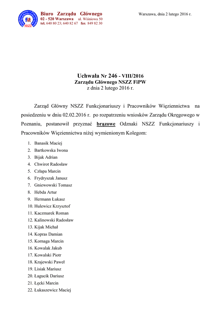 Uchwała Nr 246 - VIII/2016 - NSZZ Funkcjonariuszy i Pracowników