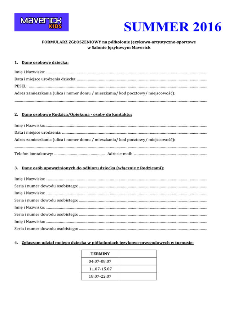 SUMMER 2016 FORMULARZ ZGŁOSZENIOWY na półkolonie językowo-artystyczno-sportowe w Salonie Językowym Maverick 1. Dane osobowe dziecka: Imię i Nazwisko:................................................................................................................................................................................. Data i miejsce urodzenia dziecka: .............................................................................................................................................. PESEL: ................................................................................................................................................................................................... Adres zamieszkania (ulica i numer domu / mieszkania/ kod pocztowy/ miejscowość): ................................................................................................................................................................................................................... 2. Dane osobowe Rodzica/Opiekuna - osoby do kontaktu: Imię i Nazwisko:................................................................................................................................................................................. Data i miejsce urodzenia: ............................................................................................................................................................... Adres zamieszkania (ulica i numer domu / mieszkania/ kod pocztowy/ miejscowość): ................................................................................................................................................................................................................... Telefon kontaktowy: ……………………………………….. Adres e-mail: ................................................................................ 3. Dane osób upoważnionych do odbioru dziecka (włącznie z Rodzicami): Imię i Nazwisko: ................................................................................................................................................................................ Seria i numer dowodu osobistego: ............................................................................................................................................ Imię i Nazwisko: ................................................................................................................................................................................ Seria i numer dowodu osobistego: ............................................................................................................................................ Imię i Nazwisko: ................................................................................................................................................................................ Seria i numer dowodu osobistego: ............................................................................................................................................ Imię i Nazwisko: ................................................................................................................................................................................ Seria i numer dowodu osobistego: ............................................................................................................................................ 4. Zgłaszam udział mojego dziecka w półkoloniach językowo-przygodowych w turnusie: TERMINY 04.07-08.07 11.07-15.07 18.07-22.07 ………………….……………………….(proszę wpisać: Akceptuję / Nie akceptuję) regulamin półkolonii językowoartystyczno-sportowych dostępny na stronie internetowej: www.salonangielskiego.pl UWAGA! W razie braku akceptacji regulaminu dziecko nie zostanie przyjęte przez organizatora na półkolonie. ……………………………………. (proszę wpisać: Wyrażam zgodę / Nie wyrażam zgody) na przetwarzanie danych osobowych, zawartych w niniejszym formularzu dla potrzeb rekrutacji i organizacji półkolonii przez Salon Angielskiego Maverick, zgodnie z Ustawą z dnia 29 sierpnia 1977 r. o ochronie danych osobowych (Dz. U. z 2002 r., Nr 101, poz. 926 z późn. zm.). UWAGA! Brak zgody oznacza, że organizator nie będzie mógł wpisać dziecka na listę uczestników. ……………………………………. (proszę wpisać: Wyrażam zgodę / Nie wyrażam zgody) na nieodpłatne zamieszczenie wizerunku mojego dziecka w galerii w formie zdjęć na stronie internetowej www.salonangielskiego.pl. ……………………………………. (proszę wpisać: Wyrażam zgodę / Nie wyrażam zgody)na nieodpłatne zamieszczenie wizerunku mojego dziecka w fotorelacjach z półkolonii na profilu funpage Salonu Angielskiego Maverick na Facebook’u. Data .................................. Podpis .................................. 1. Wypełniony i podpisany formularz zgłoszenia prosimy dostarczyć mailem na adres: [email protected]. Oryginały formularza oraz karty kwalifikacyjnej uczestnika wypoczynku prosimy dostarczyć najpóźniej 14 dni przed rozpoczęciem turnusu pod adres Salon Angielskiego Maverick, ul. Łowicka 44, 81-504 Gdynia. 2. Przesłanie podpisanego Formularza Zgłoszeniowego oraz dokonanie wpłaty w wysokości 100 zł (wpisowe) na konto organizatora jest podstawą do umieszczenia zgłoszonych osób na liście uczestników. Kolejność wpływających na konto Salonu Angielskiego Maverick wpłat będzie decydowała o kolejności zgłoszenia dziecka na liście uczestników. 3. Zakwalifikowanie dziecka na półkolonie nastąpi po dostarczeniu karty kwalifikacyjnej uczestnika oraz dokonaniu całkowitej wpłaty na konto Salonu Angielskiego Maverick nr: 38 1090 1102 0000 0001 1937 7513, tytułem: imię, nazwisko DZIECKA i wybrany turnus. 4. Zastrzegamy sobie możliwość odwołania półkolonii w przypadku niewystarczającej liczby uczestników.