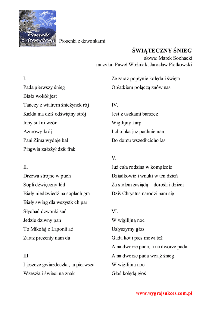 Piosenki z dzwonkami ŚWIĄTECZNY ŚNIEG słowa: Marek Sochacki muzyka: Paweł Woźniak, Jarosław Piątkowski I. Że zaraz popłynie kolęda i święta Pada pierwszy śnieg Opłatkiem połączą znów nas Biało wokół jest Tańczy z wiatrem śnieżynek rój IV. Każda ma dziś odświętny strój Jest z uszkami barszcz Inny sukni wzór Wigilijny karp Ażurowy krój I choinka już pachnie nam Pani Zima wydaje bal Do domu wszedł cicho las Pingwin założył dziś frak V. II. Już cała rodzina w komplecie Drzewa strojne w puch Dziadkowie i wnuki w ten dzień Sopli dźwięczny lód Za stołem zasiądą – dorośli i dzieci Biały niedźwiedź na soplach gra Dziś Chrystus narodzi nam się Biały swing dla wszystkich par Słychać dzwonki sań VI. Jedzie dziwny pan W wigilijną noc To Mikołaj z Laponii aż Usłyszymy głos Zaraz prezenty nam da Gada kot i pies mówi też A na dworze pada, a na dworze pada III. A na dworze pada wciąż śnieg I jeszcze gwiazdeczka, ta pierwsza W wigilijną noc Wzeszła i świeci na znak Głoś kolędą głoś www.wygrajsukces.com.pl Że ktoś mały narodził się A na dworze pada, a na dworze pada A na dworze pada wciąż śnieg www.wygrajsukces.com.pl
