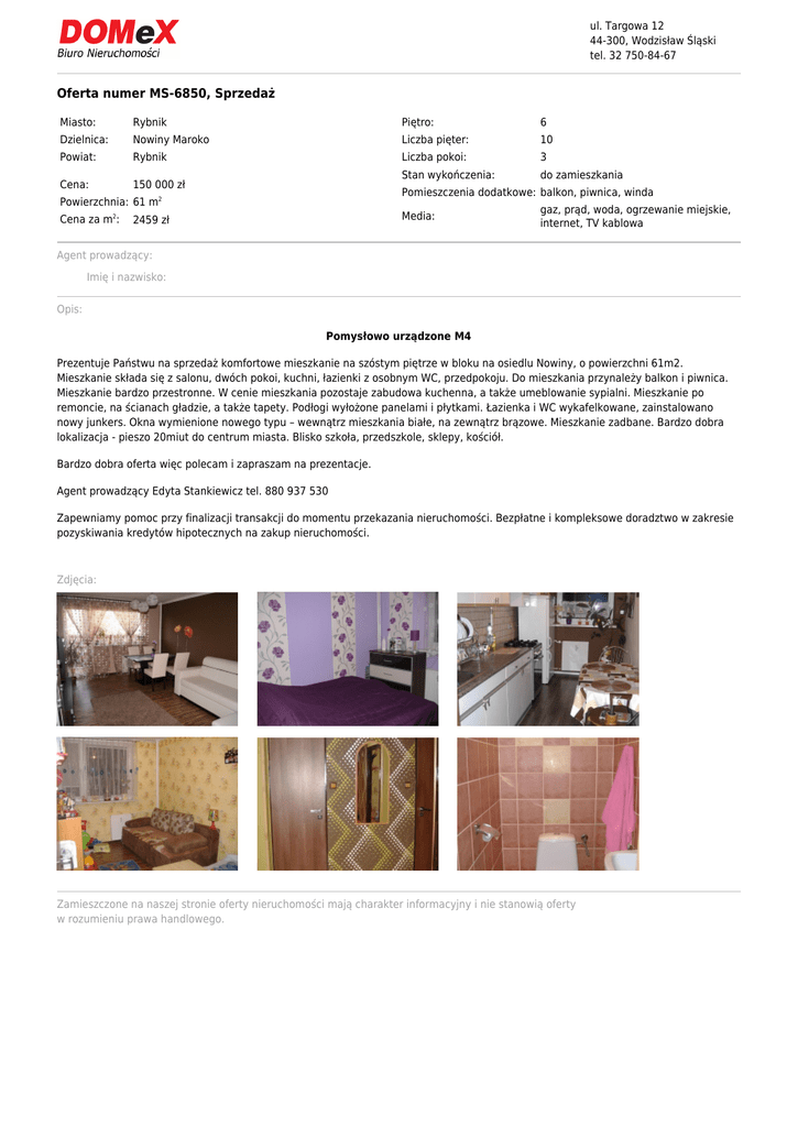 ul. Targowa 12 44-300, Wodzisław Śląski tel. 32 750-84-67 Oferta numer MS-6850, Sprzedaż Miasto: Rybnik Piętro: 6 Dzielnica: Nowiny Maroko Liczba pięter: 10 Powiat: Rybnik Liczba pokoi: 3 Stan wykończenia: do zamieszkania Cena: 150 000 zł Pomieszczenia dodatkowe: balkon, piwnica, winda Powierzchnia: 61 m2 Cena za m2: Media: 2459 zł gaz, prąd, woda, ogrzewanie miejskie, internet, TV kablowa Agent prowadzący: Imię i nazwisko: Opis: Pomysłowo urządzone M4 Prezentuje Państwu na sprzedaż komfortowe mieszkanie na szóstym piętrze w bloku na osiedlu Nowiny, o powierzchni 61m2. Mieszkanie składa się z salonu, dwóch pokoi, kuchni, łazienki z osobnym WC, przedpokoju. Do mieszkania przynależy balkon i piwnica. Mieszkanie bardzo przestronne. W cenie mieszkania pozostaje zabudowa kuchenna, a także umeblowanie sypialni. Mieszkanie po remoncie, na ścianach gładzie, a także tapety. Podłogi wyłożone panelami i płytkami. Łazienka i WC wykafelkowane, zainstalowano nowy junkers. Okna wymienione nowego typu – wewnątrz mieszkania białe, na zewnątrz brązowe. Mieszkanie zadbane. Bardzo dobra lokalizacja - pieszo 20miut do centrum miasta. Blisko szkoła, przedszkole, sklepy, kościół. Bardzo dobra oferta więc polecam i zapraszam na prezentacje. Agent prowadzący Edyta Stankiewicz tel. 880 937 530 Zapewniamy pomoc przy finalizacji transakcji do momentu przekazania nieruchomości. Bezpłatne i kompleksowe doradztwo w zakresie pozyskiwania kredytów hipotecznych na zakup nieruchomości. Zdjęcia: Zamieszczone na naszej stronie oferty nieruchomości mają charakter informacyjny i nie stanowią oferty w rozumieniu prawa handlowego.