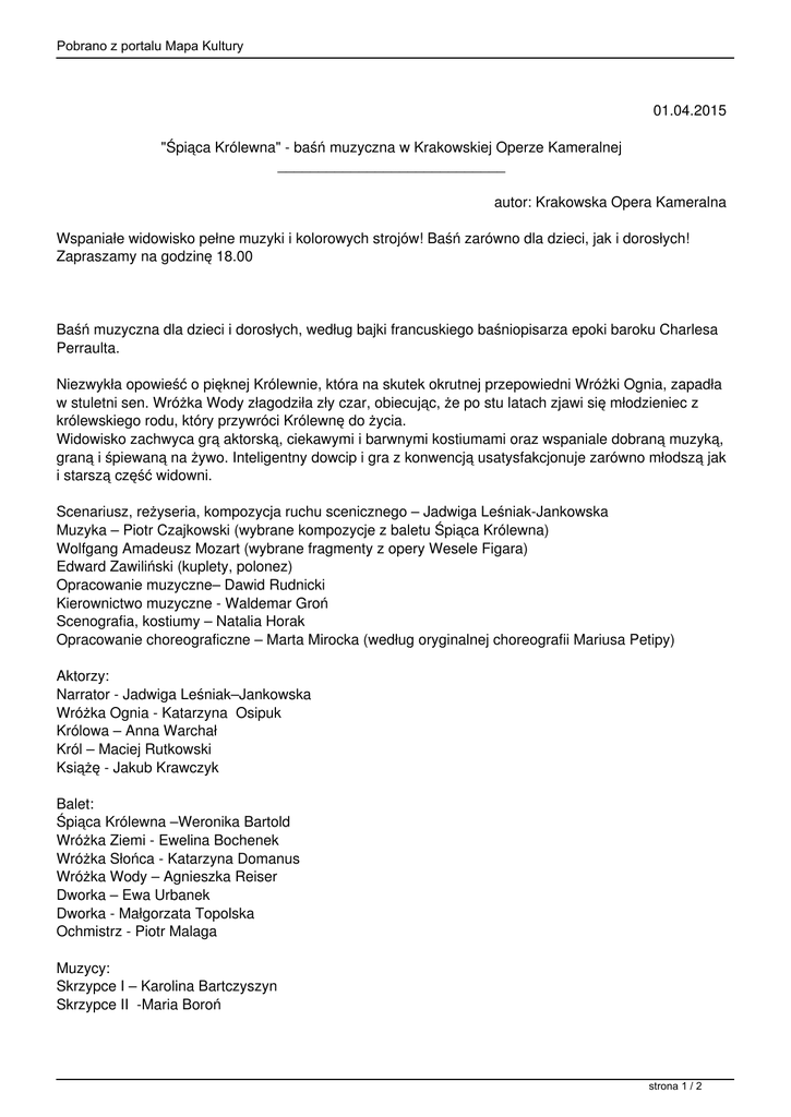Pobrano z portalu Mapa Kultury 01.04.2015 "Śpiąca Królewna" - baśń muzyczna w Krakowskiej Operze Kameralnej ____________________________ autor: Krakowska Opera Kameralna Wspaniałe widowisko pełne muzyki i kolorowych strojów! Baśń zarówno dla dzieci, jak i dorosłych! Zapraszamy na godzinę 18.00 Baśń muzyczna dla dzieci i dorosłych, według bajki francuskiego baśniopisarza epoki baroku Charlesa Perraulta. Niezwykła opowieść o pięknej Królewnie, która na skutek okrutnej przepowiedni Wróżki Ognia, zapadła w stuletni sen. Wróżka Wody złagodziła zły czar, obiecując, że po stu latach zjawi się młodzieniec z królewskiego rodu, który przywróci Królewnę do życia. Widowisko zachwyca grą aktorską, ciekawymi i barwnymi kostiumami oraz wspaniale dobraną muzyką, graną i śpiewaną na żywo. Inteligentny dowcip i gra z konwencją usatysfakcjonuje zarówno młodszą jak i starszą część widowni. Scenariusz, reżyseria, kompozycja ruchu scenicznego – Jadwiga Leśniak-Jankowska Muzyka – Piotr Czajkowski (wybrane kompozycje z baletu Śpiąca Królewna) Wolfgang Amadeusz Mozart (wybrane fragmenty z opery Wesele Figara) Edward Zawiliński (kuplety, polonez) Opracowanie muzyczne– Dawid Rudnicki Kierownictwo muzyczne - Waldemar Groń Scenografia, kostiumy – Natalia Horak Opracowanie choreograficzne – Marta Mirocka (według oryginalnej choreografii Mariusa Petipy) Aktorzy: Narrator - Jadwiga Leśniak–Jankowska Wróżka Ognia - Katarzyna Osipuk Królowa – Anna Warchał Król – Maciej Rutkowski Książę - Jakub Krawczyk Balet: Śpiąca Królewna –Weronika Bartold Wróżka Ziemi - Ewelina Bochenek Wróżka Słońca - Katarzyna Domanus Wróżka Wody – Agnieszka Reiser Dworka – Ewa Urbanek Dworka - Małgorzata Topolska Ochmistrz - Piotr Malaga Muzycy: Skrzypce I – Karolina Bartczyszyn Skrzypce II -Maria Boroń strona 1 / 2 Pobrano z portalu Mapa Kultury Altówka – Konrad Krzysztofiak Wiolonczela – Magdalena Cymer Flet - Ewa Tupik Klarnet - Mariusz Stępień Instrumenty klawiszowe - Dawid Rudnicki strona 2 / 2