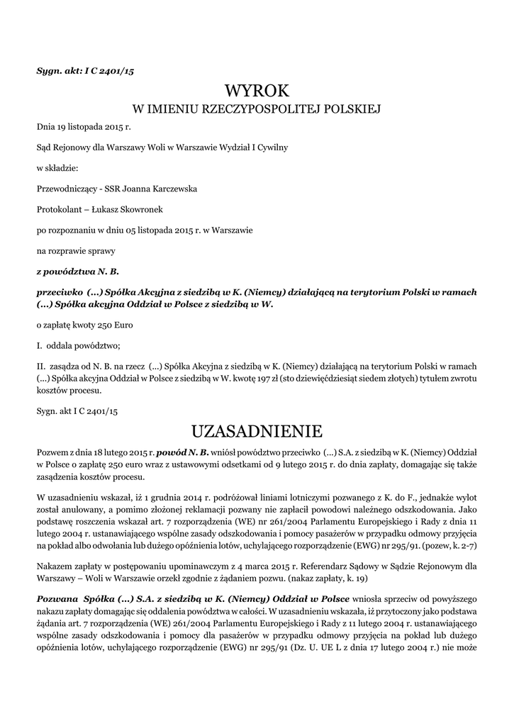 Sygn. akt: I C 2401/15 WYROK W IMIENIU RZECZYPOSPOLITEJ POLSKIEJ Dnia 19 listopada 2015 r. Sąd Rejonowy dla Warszawy Woli w Warszawie Wydział I Cywilny w składzie: Przewodniczący - SSR Joanna Karczewska Protokolant – Łukasz Skowronek po rozpoznaniu w dniu 05 listopada 2015 r. w Warszawie na rozprawie sprawy z powództwa N. B. przeciwko (...) Spółka Akcyjna z siedzibą w K. (Niemcy) działającą na terytorium Polski w ramach (...) Spółka akcyjna Oddział w Polsce z siedzibą w W. o zapłatę kwoty 250 Euro I. oddala powództwo; II. zasądza od N. B. na rzecz (...) Spółka Akcyjna z siedzibą w K. (Niemcy) działającą na terytorium Polski w ramach (...) Spółka akcyjna Oddział w Polsce z siedzibą w W. kwotę 197 zł (sto dziewięćdziesiąt siedem złotych) tytułem zwrotu kosztów procesu. Sygn. akt I C 2401/15 UZASADNIENIE Pozwem z dnia 18 lutego 2015 r. powód N. B. wniósł powództwo przeciwko (...) S.A. z siedzibą w K. (Niemcy) Oddział w Polsce o zapłatę 250 euro wraz z ustawowymi odsetkami od 9 lutego 2015 r. do dnia zapłaty, domagając się także zasądzenia kosztów procesu. W uzasadnieniu wskazał, iż 1 grudnia 2014 r. podróżował liniami lotniczymi pozwanego z K. do F., jednakże wylot został anulowany, a pomimo złożonej reklamacji pozwany nie zapłacił powodowi należnego odszkodowania. Jako podstawę roszczenia wskazał art. 7 rozporządzenia (WE) nr 261/2004 Parlamentu Europejskiego i Rady z dnia 11 lutego 2004 r. ustanawiającego wspólne zasady odszkodowania i pomocy pasażerów w przypadku odmowy przyjęcia na pokład albo odwołania lub dużego opóźnienia lotów, uchylającego rozporządzenie (EWG) nr 295/91. (pozew, k. 2-7) Nakazem zapłaty w postępowaniu upominawczym z 4 marca 2015 r. Referendarz Sądowy w Sądzie Rejonowym dla Warszawy – Woli w Warszawie orzekł zgodnie z żądaniem pozwu. (nakaz zapłaty, k. 19) Pozwana Spółka (...) S.A. z siedzibą w K. (Niemcy) Oddział w Polsce wniosła sprzeciw od powyższego nakazu zapłaty domagając się oddalenia powództwa w całości. W uzasadnieniu wskazała, iż przytoczony jako podstawa żądania art. 7 rozporządzenia (WE) 261/2004 Parlamentu Europejskiego i Rady z 11 lutego 2004 r. ustanawiającego wspólne zasady odszkodowania i pomocy dla pasażerów w przypadku odmowy przyjęcia na pokład lub dużego opóźnienia lotów, uchylającego rozporządzenie (EWG) nr 295/91 (Dz. U. UE L z dnia 17 lutego 2004 r.) nie może stanowić samodzielnej podstawy dochodzenia roszczenia. W ocenie pozwanej Spółki została spełniona przesłanka z art. 5 ust 3 rozporządzenia wyłączająca jej odpowiedzialność z tytułu odszkodowania za odwołany lot. Zgodnie z jego treścią: Obsługujący przewoźnik lotniczy nie jest zobowiązany do wypłaty rekompensaty przewidzianej w art. 7, jeżeli może dowieść, że odwołanie jest spowodowane zaistnieniem nadzwyczajnych okoliczności, których nie można było uniknąć pomimo podjęcia wszelkich racjonalnych środków. Podkreśliła, że przyczyną odwołania lotu na który powód miał wykupiony bilet był strajk pracowników powoda zrzeszonych w Niemieckim Związku Zawodowym – (...), a tym samym stosownie do regulacji wynikających z art. 5 ust. 3 (zaistnienia nadzwyczajnych okoliczności) nie jest on zobowiązany do zapłaty rekompensaty. Ponadto strona pozwana wskazała na treść pkt 14 Preambuły Rozporządzenia WE 261/2004, którego wynika, że ‘’Podobnie jak w konwencji montrealskiej, zobowiązania przewoźników lotniczych powinny być ograniczone lub ich odpowiedzialność wyłączona w przypadku gdy zdarzenie jest spowodowane zaistnieniem nadzwyczajnych okoliczności, których nie można było uniknąć pomimo podjęcia wszelkich racjonalnych środków. Okoliczności te mogą, w szczególności, zaistnieć w przypadku destabilizacji politycznej, warunków meteorologicznych uniemożliwiających dany lot, zagrożenia bezpieczeństwa, nieoczekiwanych wad mogących wpłynąć na bezpieczeństwo lotu oraz strajków mających wpływ na działalność przewoźnika’’. (sprzeciw, k. 22-24) Sąd ustalił następujący stan faktyczny: N. B. miał wykupiony bilet na lot nr (...) na godzinę 18:45, który miał być realizowany przez pozwaną Spółkę w dniu 1 grudnia 2014 r. z K. do F., który stanowił część jego podróży do K.. Lot został odwołany w związku ze strajkiem grupy pracowników pozwanej Spółki - pilotów D. L. zrzeszonych w Niemieckim Związku Zawodowym – (...). Strajk pilotów trwał od godziny 12:00 w dniu 1 grudnia 2014 r. do godziny 24:00 w dniu 2 grudnia 2014 r. Pozwana Spółka w dniu 30 listopada 2014 r. około godziny 14.00 została poinformowana przez związek zawodowy (...) o planowanym 36 – godzinnym strajku. Wobec informacji o strajku (...) S.A. z siedzibą w K. podjęła działania mające na celu poinformowanie pasażerów o zaistniałej sytuacji (informowała mailowo wieczorem 30 listopada lub rano 1 grudnia 2014 r.). Pozwany skorzystał z opcji zwrotu kosztów niewykorzystanej części biletu. W roku 2014 i 2015 aż do dnia zamknięcia rozprawy w niniejszej sprawie u pozwanego przewoźnika odbyło się co najmniej 12 strajków pilotów L.. Podłożem konfliktu był brak zgody pozwanego na zachowanie przywilejów emerytalnych przede wszystkim polegających na możliwości przejścia na wcześniejszą emeryturę tj. w wieku 55 lat przez pilotów zatrudnionych w spółce po 01 stycznia 2014 r., na co nie godzą się związki zawodowe pilotów. Brak zgody L. na zachowanie w.w. przywileju był spowodowany podejmowanymi działaniami o charakterze oszczędnościowym mającymi na celu utrzymanie pozycji na rynku i zachowanie konkurencyjności wobec przewoźników działających na tym samym obszarze. Z uwagi na częste strajki pozwana podjęła działania, które miały w możliwie jak największym zakresie minimalizować skutki strajków w postaci konieczności odwoływania dużej ilości lotów. Działan