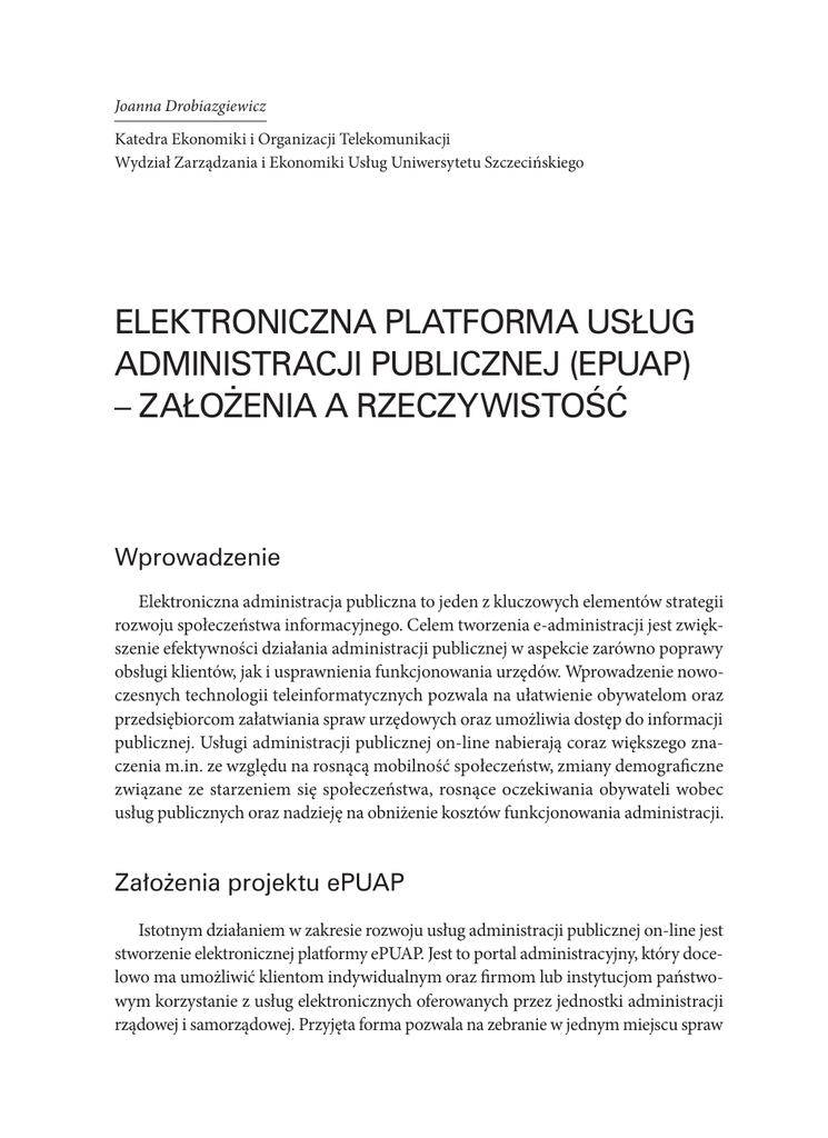 Joanna Drobiazgiewicz Katedra Ekonomiki i Organizacji Telekomunikacji Wydział Zarządzania i Ekonomiki Usług Uniwersytetu Szczecińskiego Elektroniczna Platforma Usług Administracji Publicznej (ePUAP) – założenia a rzeczywistość Wprowadzenie Elektroniczna administracja publiczna to jeden z kluczowych elementów strategii rozwoju społeczeństwa informacyjnego. Celem tworzenia e-administracji jest zwiększenie efektywności działania administracji publicznej w aspekcie zarówno poprawy obsługi klientów, jak i usprawnienia funkcjonowania urzędów. Wprowadzenie nowoczesnych technologii teleinformatycznych pozwala na ułatwienie obywatelom oraz przedsiębiorcom załatwiania spraw urzędowych oraz umożliwia dostęp do informacji publicznej. Usługi administracji publicznej on-line nabierają coraz większego znaczenia m.in. ze względu na rosnącą mobilność społeczeństw, zmiany demograficzne związane ze starzeniem się społeczeństwa, rosnące oczekiwania obywateli wobec usług publicznych oraz nadzieję na obniżenie kosztów funkcjonowania administracji. Założenia projektu ePUAP Istotnym działaniem w zakresie rozwoju usług administracji publicznej on-line jest stworzenie elektronicznej platformy ePUAP. Jest to portal administracyjny, który docelowo ma umożliwić klientom indywidualnym oraz firmom lub instytucjom państwowym korzystanie z usług elektronicznych oferowanych przez jednostki administracji rządowej i samorządowej. Przyjęta forma pozwala na zebranie w jednym miejscu spraw Joanna Drobiazgiewicz należących do kompetencji różnych jednostek administracji publicznej i udostępnienie ich procedur w Internecie. Idea Elektronicznej Platformy Usług Administracji Publicznej powstała na podstawie projektu Wrota Polski. Realizacja projektu ePUAP została podzielona na dwa etapy. Pierwszy to ePUAP obejmujący lata 2006–2008, a drugi to ePUAP2, który będzie wdrażany w latach 2008–2013, rozwijany zaś w ramach Programu Operacyjnego Innowacyjna Gospodarka na lata 2007–2013. Głównym celem zaprojektowanej i wdrażanej platformy ePUAP jest: − stworzenie nowoczesnego i bezpiecznego kanału dostępu do administracyjnych usług publicznych świadczonych obywatelom, przedsiębiorcom i tzw. klientom wewnętrznym, czyli innym urzędom; − umożliwienie szybkiego i mniej kosztownego dostępu do zasobów informacyjnych, − obniżenie kosztów funkcjonowania administracji publicznej, − zapewnienie interoperacyjności w zakresie wykorzystania systemów teleinformatycznych w procesach realizacji zadań publicznych dla wszystkich jednostek administracji publicznej. W aspekcie technicznym i organizacyjnym ePUAP to wspólna infrastruktura udostępnienia przez dowolne jednostki administracji publicznej usług publicznych w kanałach elektronicznych w relacjach z obywatelami, przedsiębiorcami i innymi jednostkami administracji publicznej. Ważną kwestią jest również zapewnienie pełnej koordynacji usług publicznych świadczonych przez kilka podmiotów publicznych. Mogą z niej korzystać jednostki administracji zarówno we wzajemnych relacjach, jak i w komunikacji z obywatelami lub przedsiębiorstwami. Rozwiązanie takie jest korzystne dla klientów ze względu na brak konieczności wizyty w urzędzie, standaryzację procedur administracyjnych oraz skrócenie czasu załatwiania sprawy, co w konsekwencji przyczynia się do wzrostu jakości świadczonych usług oraz obniżenia kosztów funkcjonowania administracji. Zgodnie z koncepcją ePUAP zakłada się przeniesienie na platformę elektroniczną 28 podstawowych usług publicznych. W pierwszej kolejności przewiduje się budowę infrastruktury oferującej procesy wspólne dla usług podstawowych. Procesy wspólne to niezbędne czynności, jakie są związane ze świadczeniem usług w przestrzeni elektronicznej. Są to m.in. takie czynności, jak: − jednorazowa rejestracja na portalu, − proces identyfikacji usługobiorcy (ustalenie deklarowanej tożsamości), − proces aktywacji i dezaktywacji usługi, − zmiana danych usługobiorcy, − proces realizacji płatności za usługę, − dostosowanie wyglądu portalu do osób niepełnosprawnych1. 1 Strategia rozwoju społeczeństwa informacyjnego w Polsce do roku 2013, Ministerstwo Spraw Wewnętrznych i Administracji, grudzień 2008, http://www.mswia.gov.pl/strategia/. 64 Elektroniczna Platforma Usług Administracji Publicznej (ePUAP) – założenia a rzeczywistość Listę podstawowych usług publicznych dla obywateli oraz przedsiębiorstw przedstawia tabela 1. Tabela 1. Lista podstawowych usług publicznych przewidzianych do wdrożenia na platformie ePUAP Usługi dla obywateli Usługi dla przedsiębiorstw zz proces rozliczania podatku zz proces ubezpieczeń społecznych dochodowego od osób fizycznych zz pośrednictwo pracy zz proces obsługi ubezpieczeń społecznych dla osób fizycznych zz proces zmiany zameldowania zz proces obsługi praw jazdy zz proces obsługi paszportów zz proces obsługi dowodów osobistych zz proces rejestracji lub wyrejestrowania pojazdu zz proces uzyskania pozwolenia na budowę lub rozbiórkę zz proces zgłoszenia na policję zz proces wypożyczenia publikacji z biblioteki zz proces uzyskania wymaganych dokumentów z urzędu cywilnego zz proces składania podania o przyjęcie na studia zz proces umówienia wizyty lekarskiej zz proces obsługi zasiłków rodzinnych i pielęgnacyjnych zz proces obsługi zasiłku dla bezrobotnych zz proces głosowania przez portal internetowy zz proces badania opinii publicznej zz proces obsługi forum publicznego dla osób fizycznych zatrudnionych przez pracodawcę zz proces rozliczania podatku dochodowego od osób prawnych zz proces rozliczania podatku VAT zz proces rejestracji działalności gospodarczej zz proces przekazania danych statystycznych do GUS zz proces przekazania deklaracji celnych zz proces uzyskania zezwoleń i realizacji płatności za korzystanie ze środowiska zz proces ob