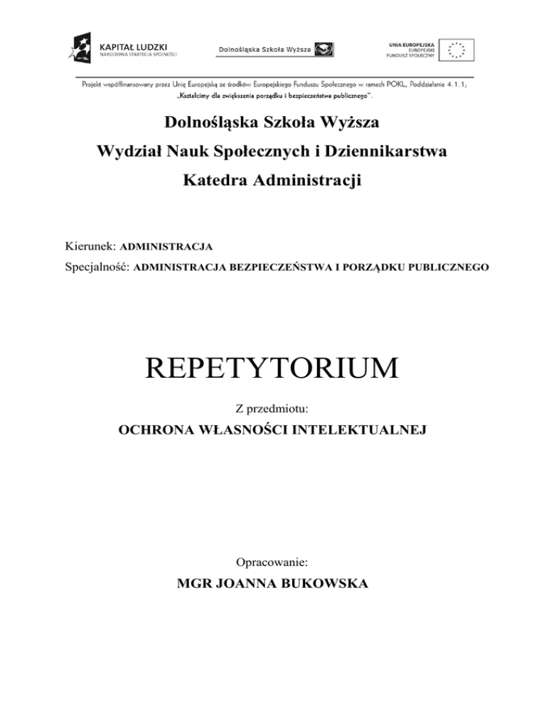 Dolnośląska Szkoła Wyższa Wydział Nauk Społecznych i Dziennikarstwa Katedra Administracji Kierunek: ADMINISTRACJA Specjalność: ADMINISTRACJA BEZPIECZEŃSTWA I PORZĄDKU PUBLICZNEGO REPETYTORIUM Z przedmiotu: OCHRONA WŁASNOŚCI INTELEKTUALNEJ Opracowanie: MGR JOANNA BUKOWSKA Spis treści 1. Pojęcie „własność intelektualna” oraz akty prawne zapewniające jej ochronę 3 2. Prawa autorskie i prawa pokrewne 5 3. Prawo własności przemysłowej 12 4. Prawnoautorska ochrona baz danych 15 5. Akty prawne 16 6. Literatura 16 2 1. Pojęcie „własność intelektualna” oraz akty prawne zapewniające jej ochronę Własność intelektualna – według Światowej Organizacji Własności Intelektualnej – to zbiór praw odnoszące się do: dzieł literackich, artystycznych i naukowych, interpretacji artystów interpretatorów oraz do wykonań artystów wykonawców, do fonogramów i do programów radiowych i telewizyjnych, wynalazków we wszystkich dziedzinach działalności ludzkiej, odkryć naukowych, wzorów przemysłowych, znaków towarowych i usługowych, jak również do nazw handlowych i oznaczeń handlowych, ochrony przed nieuczciwą konkurencją oraz wszelkie inne prawa dotyczące działalności intelektualnej w dziedzinie przemysłowej, naukowej, literackiej i artystycznej. Akty prawne: Akt sztokholmski zmieniający Konwencję paryską o ochronie własności przemysłowej z dnia 20 marca 1883 r. (Dz.U. 1975 Nr 9 poz. 51); Akt Paryski Konwencji Berneńskiej o Ochronie Dzieł Literackich i Artystycznych sporządzony w Paryżu dnia 24 lipca 1971 r. (Dz.U. 1990 Nr 82 poz. 474); Konwencja o udzieleniu patentów europejskich (Konwencja o patencie europejskim), sporządzona w Monachium dnia 5 października 1973 r. (Dz.U. 2004 Nr 79 poz. 737); Konwencja o ustanowieniu Światowej Organizacji Własności Intelektualnej, sporządzona w Sztokholmie dnia 14 lipca 1967 r. (Dz.U. 1975 Nr 9 poz. 49); Traktat Światowej Organizacji Własności Intelektualnej o Prawie Autorskim, sporządzony w Genewie dnia 20 grudnia 1996 r. (Dz.U. 2005 Nr 3 poz. 12); 3 Traktat Światowej Organizacji Własności Intelektualnej o artystycznych wykonaniach i fonogramach, sporządzony w Genewie dnia 20 grudnia 1996 r. (Dz.U. 2004 Nr 41 poz. 375); Ustawa z dnia 4 lutego 1994 r. o prawie autorskim i prawach pokrewnych (Dz.U. 1994 Nr 24 poz. 83 z późn. zm.); Ustawa z dnia 30 czerwca 2000 r. – Prawo własności przemysłowej (Dz.U. 2001 Nr 49 poz. 508 z późn. zm.); Ustawa z dnia 16 lutego 2007 r. o ochronie konkurencji i konsumentów (Dz.U. 2007 Nr 50 poz. 331 z późn. zm.); Ustawa z dnia 23 kwietnia 1964 r. – Kodeks Cywilny (Dz.U. 1964 Nr 16 poz. 93 z późn. zm.); Ustawa z dnia 27 lipca 2001 r. o ochronie baz danych (Dz.U. 2001 Nr 128 poz. 1402 z późn. zm.). 4 2. Prawa autorskie i prawa pokrewne Przedmiot ochrony – utwór – każdy przejaw działalności twórczej o indywidualnym charakterze, ustalony w jakiejkolwiek postaci, niezależnie od wartości, przeznaczenia i sposobu wyrażenia. W szczególności przedmiotem prawa autorskiego są utwory: 1) wyrażone słowem, symbolami matematycznymi, znakami graficznymi (literackie, publicystyczne, naukowe, kartograficzne oraz programy komputerowe); 2) plastyczne; 3) fotograficzne; 4) lutnicze; 5) wzornictwa przemysłowego; 6) architektoniczne, architektoniczno-urbanistyczne i urbanistyczne; 7) muzyczne i słowno-muzyczne; 8) sceniczne, sceniczno-muzyczne, choreograficzne i pantomimiczne; 9) audiowizualne (w tym filmowe). Ochroną uregulowaną w prawie autorskim objęty może być wyłącznie sposób wyrażenia utworu. W związku z powyższym prawnoautorska ochrona nie dotyczy odkryć, idei, procedur, metod, zasad działania, koncepcji matematycznych. Na gruncie prawnym istnieje konieczność rozróżnienia pomysłu od sposobu jego wyrażenia. Pomysł, który nie przybrał jeszcze określonej formy, nie jest utworem i nie podlega ochronie przewidzianej w prawie autorskim. Na uwagę zasługuje tu kwestia ochrony twórczości artystycznej, wynalazczej i racjonalizatorskiej przewidziana w przepisach kodeksu cywilnego regulujących ochronę „dóbr osobistych”. Ochrona „utworu” ma charakter normatywny, co oznacza, że jest on chroniony nawet w postaci nieukończonej od momentu ustalenia, utrwalenia, uzewnętrznienia w taki sposób by istniała możliwość zapoznania się z nim przez osoby trzecie przy użyciu zmysłów. Ochrona ta jest niezależna od jakichkolwiek formalności. W celach dowodowych można dokonać notarialnego poświadczenia daty pewnej ustalenia utworu. 5 Pojawiająca się często „nota copyrightowa” symbolizowana przez „©” nie ma znaczenia prawnego, a jedynie informacyjne, psychologiczne. Jej umieszczenie nie powoduje „lepszej” ochrony utworu, a jej brak nie pozbawia go ochrony. Dla przyszłych pracowników służb publicznych istotna jest informacja, że prawo autorskie nie zapewnia ochrony: 1) aktom normatywnym lub ich urzędowym projektom; 2) urzędowym dokumentom, materiałom, znakom i symbolom; 3) opublikowanym opisom patentowym lub ochronnym; 4) oraz prostym informacjom prasowym (np. komunikat urzędowy). Podmiot ochrony – twórca – osoba fizyczna, której przysługują prawa autorskie do utworu, chyba, że ustawa stanowi inaczej. Ustawodawca wprowadził domniemanie, iż twórcą jest osoba, której nazwisko w tym charakterze uwidoczniono na egzemplarzach utworu lub której autorstwo podano do publicznej wiadomości w związku z rozpowszechnianiem utworu. Jeśli twórca nie ujawnił swojego autorstwa wówczas producent lub wydawca, a w razie ich braku – właściwa organizacja zbiorowego zarządzania prawami autorskimi zastępuje go w wykonywaniu tych praw. W przypadku stworzenia utworu przez kilka osób mamy do czynienia z współtwórcami, którym prawa autorskie przysługują wspólnie i domniema się, że wielkości ich udziałów są równe. Twórcy/-om do stworzonego utworu przysługują dwa rodzaje praw 