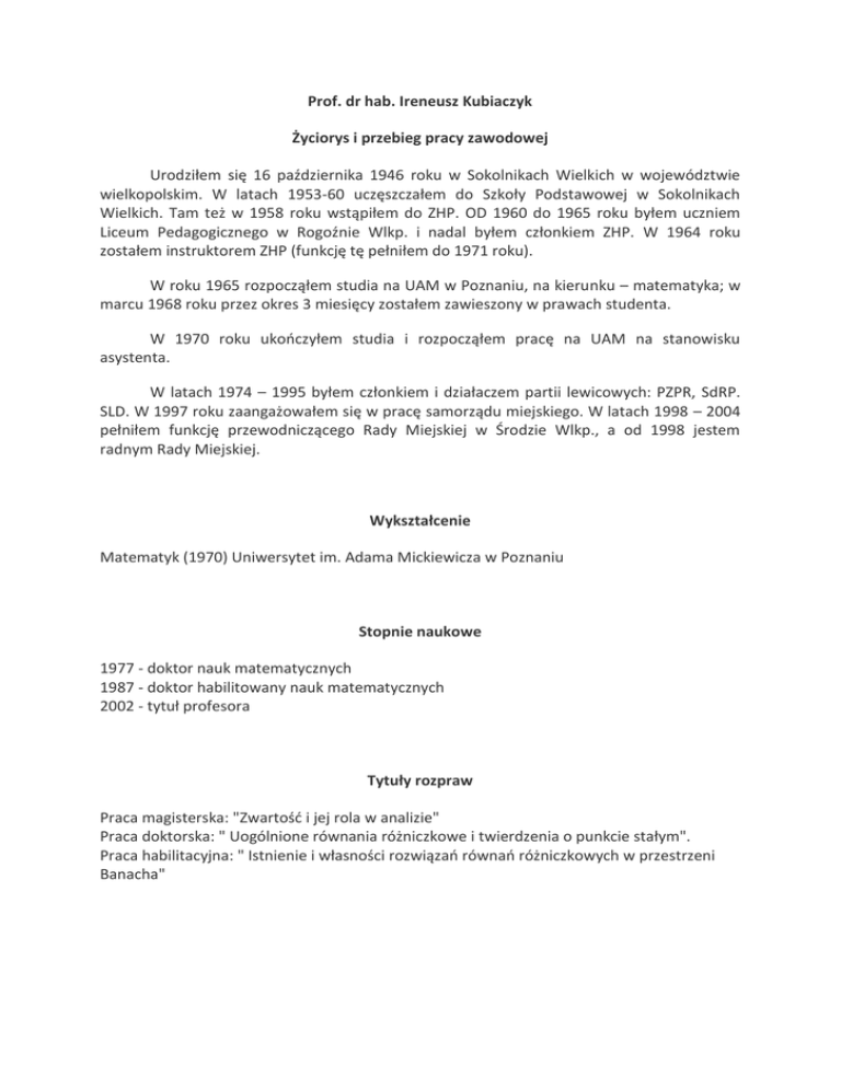 Prof. dr hab. Ireneusz Kubiaczyk Życiorys i przebieg pracy zawodowej Urodziłem się 16 października 1946 roku w Sokolnikach Wielkich w województwie wielkopolskim. W latach 1953-60 uczęszczałem do Szkoły Podstawowej w Sokolnikach Wielkich. Tam też w 1958 roku wstąpiłem do ZHP. OD 1960 do 1965 roku byłem uczniem Liceum Pedagogicznego w Rogoźnie Wlkp. i nadal byłem członkiem ZHP. W 1964 roku zostałem instruktorem ZHP (funkcję tę pełniłem do 1971 roku). W roku 1965 rozpocząłem studia na UAM w Poznaniu, na kierunku – matematyka; w marcu 1968 roku przez okres 3 miesięcy zostałem zawieszony w prawach studenta. W 1970 roku ukończyłem studia i rozpocząłem pracę na UAM na stanowisku asystenta. W latach 1974 – 1995 byłem członkiem i działaczem partii lewicowych: PZPR, SdRP. SLD. W 1997 roku zaangażowałem się w pracę samorządu miejskiego. W latach 1998 – 2004 pełniłem funkcję przewodniczącego Rady Miejskiej w Środzie Wlkp., a od 1998 jestem radnym Rady Miejskiej. Wykształcenie Matematyk (1970) Uniwersytet im. Adama Mickiewicza w Poznaniu Stopnie naukowe 1977 - doktor nauk matematycznych 1987 - doktor habilitowany nauk matematycznych 2002 - tytuł profesora Tytuły rozpraw Praca magisterska: "Zwartość i jej rola w analizie" Praca doktorska: " Uogólnione równania różniczkowe i twierdzenia o punkcie stałym". Praca habilitacyjna: " Istnienie i własności rozwiązań równań różniczkowych w przestrzeni Banacha" Prowadzone zajęcia dydaktyczne Analiza matematyczna, równania różniczkowe, funkcje analityczne, analiza funkcjonalna, rachunek prawdopodobieństwa, geometria, logika, ekonomia matematyczna, statystyka w Uniwersytecie im. Adama Mickiewicza w Poznaniu, Uniwersytecie Zielonogórskim, w WSSE w Warszawie, w WWSSE w Środzie Wlkp., w Zachodniopomorskiej Szkole Biznesu w Szczecinie. Stanowisko Profesor zwyczajny Uniwersytetu im. Adama Mickiewicza w Poznaniu i WWSSE w Środzie Wlkp. Uprawiana dziedzina Analiza matematyczna, równania różniczkowe, różnicowe i całkowe, równania na skali czasowej, teoria punktu stałego, zastosowania matematyki w ekonomii. Kształcenie kadry naukowej I. Promotorstwo w zakończonych przewodach doktorskich: 1. Mieczysław Cichoń (UAM, Poznań) " Zastosowanie miar niezwartości w teorii inkluzji różniczkowych w przestrzeni Banacha", 19.10.1990 - 26.06.1992. 2. Sławomir Krzyśka (UAM, Poznań), " Wybrane zastosowanie mocnych i słabych stron niezwartości", 17.12.1993 - 12.01.1996. 3. Nasr Mustafa Ali (Egipt), " Fixe point theorems and its applications", 15.03.1996 - 1998. 4. Aneta Sikorska (UAM, Poznań)," Całka typu Henstocka - Kurzweila, jej uogólnienia oraz zastosowania do równań różniczkowych i całkowych", 3.04.1998 - 20.06.2000. 5. Piotr Majcher, " Nielokalne zagadnienia dla równań różniczkowych i różnicowych w przestrzeni Banacha" (czerwiec 2002) 6. Samir Saker (Egipt)," Oscilation theory of delay differential and diffrence equations and some of their applications" (listopad 2002) 7. Magdalena Roszak (UAM, Poznań)," O własnościach zbiorów rozwiązań równań różniczkowo - całkowych i różnicowych w przestrzeniach Banacha" 2004r. II. Kierowanie stażem naukowym: 1. N. Mostafa Ali i Samir Saker - stypendium rządowe - Egipt. 2. Staże prof. Sushila Sharma - stypendium rządu Indii . 3. A. Yantir - stypendium rządu Turcji. 4. Opieka nad doktorantami Studium Doktoranckiego Matematyki III . Inne formy kształcenia kadry: - Recenzent rozpraw habilitacyjnych: Longina Rybińskiego i Ewy Piotrowskiej, - recenzent rozpraw doktorskich: Mariusza Michty, Ewy Schmeidel, Danuty Ozdarskiej, Agnieszki Szawioły, Małgorzaty Zbąszyniak, Andrzeja Kisielewicza, Grzegorza Grzegorczyka, Magdaleny Adamczak, Aliny Gleska, Anny Andruch Sobiło. - kierowanie Zakładem Równań Różniczkowych od 1991roku oraz prowadzenie seminarium z równań różniczkowych, w których uczestniczą także pracownicy Politechniki Poznańskiej. - Kierowanie Studium Podyplomowym z Matematyki i Studium Podyplomowym z Informatyki od 1991 roku. - Wykłady na konferencjach dla nauczycieli matematyki organizowanych przez WOM - Promotorstwo w ponad 200 pracach magisterskich z matematyki i jej zastosowań w ekonomii. Działalność organizacyjna 1987 -1991 - wicedyrektor Instytutu Matematyki; od 1991 - kierownik Zakładu Równań Różniczkowych; od 1991 - kierownik Studium Podyplomowego z Matematyki i Studium Podyplomowego z Informatyki; 1991-1992 - kierownik Zakładu Analizy Matematycznej w WSP w Zielonej Górze; 1997 - 2003 - Prezes Poznańskiego Oddziału Polskiego Towarzystwa Matematycznego - przez wiele lat praca w Komisji Kwalifikacyjnej do Spraw Stopni Specjalizacji Zawodowej dla Nauczycieli Matematyki; - od wielu lat praca w komisjach rekrutacyjnych na pierwszy rok studiów w Instytucie Matematyki UAM oraz na Wydziale Matematyki i Informatyki ( m. in. jako sekretarz komisji, egzaminator, przewodniczący), a także w Uniwersytecie Europejskim " Viadrina" we Frankfurcie nad Odrą (jako egzaminator) 2002 – założyciel Fundacji Edukacja w Środzie Wlkp. (instytucja pożytku publicznego) i jej prezes 2005 – Fundacja Edukacja utworzyła Wielkopolską Wyższą Szkołę Społeczno – Ekonomiczną w Środzie Wlkp. 2005-2007 - Rektor WWSSE w Środzie Wlkp. od 2007 - Prorektor WWSSE 2009 – 2011 Fundacja wybudowała nowy budynek dydaktyczny dla WWSSE w Środzie Wlkp. Inna działalność 1. Recenzowanie książek i prac naukowych dla: KBN, redakcji różnych czasopism matematycznych oraz Mathematical Reviews. 2. Członek Komitetu Redakcyjnego "Discussiones Mathematicae", "Próby i Szkice Humanistyczne", " Studies of economic and social processes". 3. Szereg wykładów na konferencjach i w różnych uniwersytetach m. in.: - Conference of Differentia Equations and their Applications, Equadiff 9 (1997) Brno; - Difference Equations (1998) Poznań; - Fifth International Conference Inclusions Gronów; - International Scientific C
