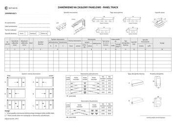 ZAMÓWIENIE NA ZASŁONY PANELOWE - PANEL TRACK Typy szyny górnej Sposób mocowania ........................................................................ ........................................................................ 88 ........................................................................ Termin realizacji ........................................................................ Sposób dostawy Anwis Spedycja Odbiór wł. System sterowania Nr paczki Szerokość całkowita (mm) Wysokość całkowita (mm) Ilość 1 2 3 4 lewa mm m 119 in. 179 m m dł. ax. m dł. 52 Symbol tkaniny jednostronny dwustronny 5 6 System i strona sterowania A B C lewa B B 55 42 Szyna 3 torowa Typ szyny elektryczne 2, 3, 4, 5 sznutorowa * sztyca rek 8 9 prawa Szyna 2 torowa Kolor profili Al. Typ obciążnika anoda tkaniny biały silver** Sterowanie jednostronne prawa A Szyna 4 torowa ręczne 7 Liczba paneli A Szyna 5 torowa Sterowanie Strona sterowania Panele rozsunięte Panele zsunięte Panele rozsunięte 10 11 Łącznik szyn 12 Sposób mocowania ściana 850 2010 3 1250 3010 4 1700 3950 5 2050 4850 A Uwagi sufit 13 Typy obciążnika tkaniny Min Max szerokość szerokość (mm) (mm) 2 14 Przekrój obciążnika 26 12 panel stały 10 B Sterowanie dwustronne C C Uwagi: 1. * W przypadku sterowania elektrycznego dostępne tylko profile białe. 2. ** Kolor anoda silver nie występuje w sterowaniu sznurkowym. edycja styczeń_2012 Liczba paneli Panele rozsunięte Panele zsunięte Min Max szerokość szerokość (mm) (mm) 6 2400 6000 8 3100 8000 panel stały 54 60 15 Data zamówienia 25 sufit 15 ........................................................................ 70 15 ściana Nr zamówienia Łącznik szyny 15 ZAMAWIAJĄCY: 15 ...................................................................... czytelny podpis zamawiającego