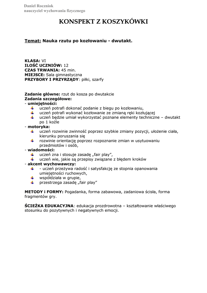 Daniel Roczniok nauczyciel wychowania fizycznego KONSPEKT Z KOSZYKÓWKI Temat: Nauka rzutu po kozłowaniu - dwutakt. KLASA: VI ILOŚĆ UCZNIÓW: 12 CZAS TRWANIA: 45 min. MIEJSCE: Sala gimnastyczna PRZYBORY I PRZYRZĄDY: piłki, szarfy Zadanie główne: rzut do kosza po dwutakcie Zadania szczegółowe: - umiejętności: uczeń potrafi dokonać podanie z biegu po kozłowaniu, uczeń potrafi wykonać kozłowanie ze zmianą ręki kozłującej uczeń będzie umiał wykorzystać poznane elementy techniczne – dwutakt po 1 koźle - motoryka: uczeń rozwinie zwinność poprzez szybkie zmiany pozycji, ułoŜenie ciała, kierunku poruszania się rozwinie orientację poprzez rozpoznanie zmian w usytuowaniu przedmiotów i osób, - wiadomości: uczeń zna i stosuje zasadę „fair play”, uczeń wie, jakie są przepisy związane z błędem kroków - akcent wychowawczy: - uczeń przeŜywa radość i satysfakcję ze stopnia opanowania umiejętności ruchowych, współdziała w grupie, przestrzega zasadę „fair play” METODY i FORMY: Pogadanka, forma zabawowa, zadaniowa ścisła, forma fragmentów gry. ŚCIEśKA EDUKACYJNA: edukacja prozdrowotna – kształtowanie właściwego stosunku do pozytywnych i negatywnych emocji. Tok lekcji Zadania szczegółowe Dozow. A) Część wstępna Zorganizowani Zbiórka, powitanie, sprawdzenie obecności e grupy i gotowości do zajęć, podanie tematy lekcji. Motywacja uczniów do zajęć. 12-14 min 2 min. Rozgrzewka Zabawa oŜywiająca 1. „Mistrz kozłowania” Wszyscy ćwiczący posiadają piłki, które kozłują nieprzerwanie, kaŜdy kaŜdemu stara się wybić piłkę kozłowaną. Osoba która straciła piłkę wykonuje zadanie dodatkowe (np. 5 przysiadów) i wraca do gry. Ćwiczenia kształt. i oswajające z piłką 1. W lekkim truchcie odmachy RR w bok. 2x szer. sali 2. W lekkim truchcie przekładanie piłki wokół własnej osi. W jedną stronę z RP do RL w drugą stronę z RL do RP. 2x szer. sali 3 min. Uwagi organizacyjnometodyczne Zbiórka w szeregu. KaŜda osoba posiada piłkę przez całą cześć wstępną. N wyjaśnia cele lekcji, omawia przebieg lekcji. Pogadanka, na czym polega doping? Co oznaczają słowa „fair play” Wygrywa ten zawodnik, który nie pozwoli sobie wybić piłki lub wykonał najmniej zadań dodatkowych N 3. W marszu, w wykroku przeładanie piłki pod PN i LN od wewnątrz. 2x szer. sali 4. W marszu przekładanie piłki z RP do RL wokół osi zaczynając od stawu skokowego 2x szer. sali 5. Kozłowanie PR – skip A, powrót j.w. LR – skip A 2x szer. sali 6. W rozkroku skłony tułowia w przód do PN i LN 1 min. 7. Skłon w tył, przerzucenie piłki między NN. Chwyt z przodu. 10x 8. Toczenie piłki w rozkroku „ósemki”, kolana wyprost. 30 sek. 9. Brzuszki z kozłowaniem PR i LR. 10 x PR 10 x LR 10. W siadzie równowaŜnym przekładamy piłkę pod PN i LN. 11. Scyzoryki – piłka trzymana w RR. W czasie kozłowania nie patrzymy na piłkę W rozsypce piłka w RR 10x 8x 13. W leŜeniu przodem kozłowanie przed sobą PR i LR. 8x 14. j.w. przetaczanie piersiową z LR do PR. 8x pod Ćwiczymy na szerokości Sali, tam i z powrotem. 10x PN i LN na zmianę 12. W leŜeniu przodem RR proste z piłką, unoszenie RR w górę piłki U klatką 15. Piłka leŜy na podłodze, przeskoki przez piłkę - róŜne 20x JednonóŜ, obunóŜ B) Część główna Kształtowanie i doskonalenie umiejętności oraz rozwijanie sprawności 26-28 min 1. Uczniowie ustawieni w dwójkach naprzeciw siebie wzdłuŜ sali gimnastycznej w odległości 2m, kaŜdy z piłką. Naprzemianstronne podania jednorącz PR i LR. 2. Uczeń U1 podaje piłkę oburącz sprzed klatki piersiowej, U2 kozłem 3. Uczniowie ustawieni w dwójkach na liniach bocznych (3-4 m) od siebie. U1 wykonuje kozłowanie P i LR. ZbliŜając się do współćw. kozłuje ręką dalszą wokół współćwiczącego do połowy odległości dzielącej. U wykonuje zatrzymanie na 1 tempo, obrót i oddaje piłkę U2. tyłem wraca na swoje miejsce. U1 2 min. U2 2 min. Zmobilizować do zwiększonej koncentracji i szybkości podań poprzez zabawę. N nadzoruje i kontroluje czas trwania i dokładność ćwiczenia. Zmiana ćwicz. w parze po 1 2 min. U. odstawiają 1 piłkę w wyznaczone miejsce przez N. 1 piłka na parę. W czasie kozłowania nie patrzymy na piłkę. Uczniowie ćwiczą na zmianę. 4. Ustawienie z prawej strony boiska, kaŜdy z piłką – kozłowanie litery S poza kołami w zaznaczonych miejscach wykonujemy zmianę ręki kozłującej, na końcu wykonujemy rzut po zatrzymaniu z półdystansu. 4 min. 5. Dwutakt Najpierw uczniowie ustawiają piłkę przed sobą na parkiecie i ćwiczą dwutakt bez piłki 6 min. a) 1 krok - LN PN 10x U. chwyta oburącz piłkę odbitą od podłoŜa, wykonując równocześnie 1 krok dwutaktu (długi i płaski pozwalający zbliŜyć się do kosza), następnie stawia drugi krok na nodze lewej (krótki, pozwalający odbić się graczowi w dynamicznie górę). Po odbiciu z nogi lewej naleŜy przenieść kolano nogi prawej zgięte pod kątem 90o do przodu. W trakcie 2 kroku piłka powinna być przeniesiona nad głowę i rzucona do kosza w taki sposób jak przy rzucie jednorącz z miejsca. Po dwutakcie U. powinien znaleźć się w pozycji wygodnej do rzutu (barki prostopadłe do kierunku rzutu), pod kątem 45o do tablicy i rzucać piłkę o tablicę. Lądowanie powinno odbyć się na dwie NN w miejscu odbicia. b) 1 krok + 2 krok LN PN Metoda zadaniowa KaŜdy uczeń posiada piłkę Ćwiczą równocześnie dwie grupy. Uczeń po zakończeniu ćwicz. pozost. na końcu przeciwnego rzędu. Po wykonaniu kaŜdej fazy nauczania dwutaktu z prawej strony w czasie tej samej lekcji wykonujemy rzut z lewej strony kosza, którego technika jest odbiciem lustrzanym rzutu z prawej strony tzn. kozioł wykonujemy RL, rzut RL a dwutakt rozpoczynamy od LN. 10x LN c) LN, kozioł, PN+LN-->wyskok i rzut do kosza 10x d) wykonanie dwutaktu po 2 i 3 koźle 10x Forma fragm. gry 6. U. dobierają się 