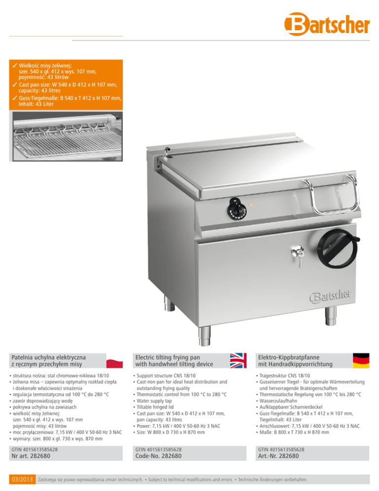 ✓ Wielkość misy żeliwnej: szer. 540 x gł. 412 x wys. 107 mm, pojemność: 43 litrów ✓ Cast pan size: W 540 x D 412 x H 107 mm, capacity: 43 litres ✓ Guss-Tiegelmaße: B 540 x T 412 x H 107 mm, Inhalt: 43 Liter Patelnia uchylna elektryczna z ręcznym przechyłem misy • struktura nośna: stal chromowo-niklowa 18/10 • żeliwna misa – zapewnia optymalny rozkład ciepła i doskonałe właściwości smażenia • regulacja termostatyczna od 100 °C do 280 °C • zawór doprowadzający wodę • pokrywa uchylna na zawiasach • wielkość misy żeliwnej: szer. 540 x gł. 412 x wys. 107 mm pojemność misy: 43 litrów • moc przyłączeniowa: 7,15 kW / 400 V 50-60 Hz 3 NAC • wymiary: szer. 800 x gł. 730 x wys. 870 mm GTIN 4015613585628 Nr art. 282680 03/2013 Electric tilting frying pan with handwheel tilting device • Support structure CNS 18/10 • Cast-iron pan for ideal heat distribution and outstanding frying quality • Thermostatic control from 100 °C to 280 °C • Water supply tap • Tiltable hinged lid • Cast pan size: W 540 x D 412 x H 107 mm, pan capacity: 43 litres • Power: 7,15 kW / 400 V 50-60 Hz 3 NAC • Size: W 800 x D 730 x H 870 mm GTIN 4015613585628 Code-No. 282680 Elektro-Kippbratpfanne mit Handradkippvorrichtung • Tragestruktur CNS 18/10 • Gusseiserner Tiegel - für optimale Wärmeverteilung und hervorragende Brateigenschaften • Thermostatische Regelung von 100 °C bis 280 °C • Wasserzulaufhahn • Aufklappbarer Scharnierdeckel • Guss-Tiegelmaße: B 540 x T 412 x H 107 mm, Tiegelinhalt: 43 Liter • Anschlusswert: 7,15 kW / 400 V 50-60 Hz 3 NAC • Maße: B 800 x T 730 x H 870 mm GTIN 4015613585628 Art.-Nr. 282680 Zastrzega się prawo wprowadzania zmian technicznych. • Subject to technical modifications and errors. • Technische Änderungen vorbehalten.
