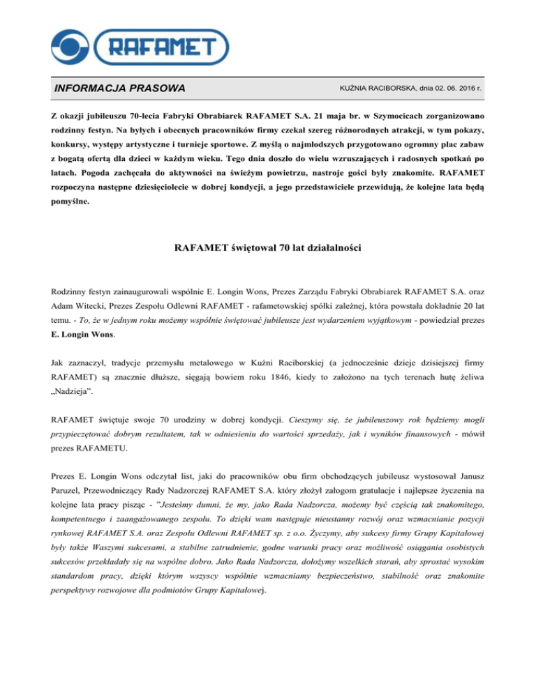 INFORMACJA PRASOWA RAFAMET świętował 70 lat działalności
