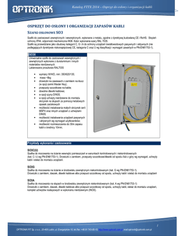 Katalog FTTX 2014 – Osprzęt do osłony i organizacji kabli OSPRZĘT DO OSŁONY I ORGANIZACJI ZAPASÓW KABLI SZAFKI OSŁONOWE SO3 Szafki do zastosowań zewnętrznych i wewnętrznych, wykonane z metalu, zgodne z dyrektywą budowlaną CE i RoHS. Stopień ochrony IP44, odporność mechaniczna IK08. Kolor wykonania szary RAL 7035. Szafki są przewidziane jako obudowy kategorii C, G i A do ochrony urządzeń światłowodowych pasywnych i aktywnych (nie podlegających dyrektywie niskonapięciowej CE, kategoria C oraz U wg klasyfikacji i wymagań zawartych w PN-EN61753-1). SO3X Uniwersalne szafki do zastosowań wewnętrznych i zewnętrznych wykonane z duraluminium i innych materiałów nierdzewnych. Lakierowane proszkowo RAL7035 • • • • • • • • • • wymiary W/H/D, mm: 350/620/135; masa ~6kg drzwiczki na zawiasach z zamkiem na klucz (w opcji zamki Master Key); przepusty szczotkowe na kable; dowolne dławiki kablowe; w opcji szyny DIN35; w opcji uchwyty nierdzewne do montaŜu skrzynek na słupach za pomocą metalowych opasek zaciskowych moŜliwość instalowania małych skrzynek serii MSPX oraz innych urządzeń z uchwytami DIN35; moŜliwość instalowania urządzeń pasywnych i aktywnych wg wymagań uŜytkowników; moŜliwość rozmieszczenia do 30m zapasu kabli o średnicy 10mm; Przykłady wykonania i zastosowanie SO3C(U) Szafka do mocowania na ścianie wewnątrz pomieszczeń w warunkach kontrolowanych i niekontrolowanych (kat. C i U wg PN-EN61753-1). Drzwiczki z zamkiem, przepusty szczotkowe/dławiki od spodu i/lub z góry wg wymagań, uchwyty kabli i stelaŜ do montaŜu urządzeń. SO3G Szafka do mocowania na ścianie w środowisku zewnętrznym niekontrolowanym (kat. G wg PN-EN61753-1). Drzwiczki z zamkiem, daszek, dławiki kablowe albo przepust szczotkowy od spodu, uchwyty kabli i stelaŜ do montaŜu urządzeń SO3A Szafka do mocowania na słupach w środowisku zewnętrznym niekontrolowanym (kat. A wg PN-EN61753-1) Drzwiczki z zamkiem, daszek, dławiki kablowe albo przepust szczotkowy od spodu, uchwyty kabli, stelaŜ do montaŜu urządzeń, komplet uchwytów nasłupowych w wykonaniu nierdzewnym (INOX). 1 OPTRONIK PIT Sp. z o.o., 20-468 Lublin, ul. Energetyków 10, tel./fax: +48 81 743-85-15; http://www.optronik.com.pl; mail:[email protected] Katalog FTTX 2014 – Osprzęt do osłony i organizacji kabli STELAŻE I SKRZYNKI ZAPASÓW KABLA StelaŜe i skrzynie osłonowe słuŜą do porządkowania i zabezpieczania zapasów kabli w pomieszczeniach, studniach kablowych oraz na słupach linii napowietrznych. Oferujemy stelaŜe regulowane z moŜliwością dostosowania do wielkości studni, promieni gięcia i długości zapasów kabli optycznych. StelaŜe zapasów kabli SZK • • • • • • • • StelaŜe stalowe cynkowane SZK300 – stelaŜ regulowany w zakresie 250-350mm. W opcji wyposaŜenie do montaŜu stelaŜa na słupach, drabinkach kablowych i w szafach. SZK600 – stelaŜ regulowany w zakresie 500-700mm SZK900 - stelaŜ regulowany w zakresie 800-1000mm do magazynowania zapasów kabli optycznych o średnicach powyŜej 16mm; SZKn - opcje wyposaŜenia stelaŜy do montaŜu na słupach linii napowietrznych; wykonanie z elementów stalowych giętych i spawanych, ocynkowanych galwanicznie lub ogniowo StelaŜe stalowe nierdzewne SZKI300 – stelaŜ regulowany w zakresie 250-350mm wykonany z blachy nierdzewnej. SZKI500 – stelaŜ nieregulowany 500x500mm wykonany z blachy nierdzewnej metodą przetłaczania i zgrzewania SZKI600 – stelaŜ nieregulowany 600x600mm wykonany z blachy nierdzewnej metodą przetłaczania i zgrzewania Pokrywy PZK • • • • pokrywy do montaŜu na stelaŜach SZK600; PZK 600 o wymiarach 610x610x105; PZK 700 o wymiarach 710x710x105; wykonane z blachy duralowej PA11 zabezpieczonej lakierem proszkowym w kolorze RAL 7032. Skrzynie zapasów SZK/PZK • • SZK/PZK600 – skrzynka o wymiarach 610x610x105mm; SZK/PZK700 – skrzynka o wymiarach 710x710x105mm; Skrzynia zapasów SZKO600 • • • stelaŜ pełny o wymiarach 600x600x105mm w komplecie z pokrywą PZK600; w opcji zamknięcie na kłódkę przemysłową wykonanie w całości z blach duralowych zabezpieczonych powłoką elektrochemiczną i lakierem proszkowym w kolorze RAL 7032. Przykład zamówienia SZKO600K StelaŜ pełny oraz pokrywa PZK 600, zamknięcie na kłódkę przemysłową. 2 OPTRONIK PIT Sp. z o.o., 20-468 Lublin, ul. Energetyków 10, tel./fax: +48 81 743-85-15; http://www.optronik.com.pl; mail:[email protected] Katalog FTTX 2014 – Osprzęt do osłony i organizacji kabli STELAŻ ZAPASÓW KABLI NAPOWIETRZNYCH SZKN StelaŜ do montaŜu złączy i zapasów kabli ADSS i OPGW na słupach linii napowietrznych. • • • • wykonany z elementów stalowych spawanych ocynkowanych ogniowo oraz kształtowników ze stali nierdzewnej lekka aŜurowa konstrukcja o małym oporze aerodynamicznym; moŜliwość zainstalowania dwóch uchwytów USKn do muf złączowych; bezkolizyjny montaŜ i demontaŜ zapasów kabla i osłon złączowych Dane techniczne 1. 2. 3. Szyna montaŜowa – 1 szt. Kabłąk zapasów – 2 szt. Wieszak mufy USKn – 1 lub 2 szt. 4. Mufa kablowa 5. Słup Przykład zamówienia SZKN-1 StelaŜ zapasów kabli ADSS i OPGW - komplet zawierający szynę nośną, dwa elementy łukowe, jeden uchwyt typu USKn do mocowania osłony złączowej, obejmy słupowe oraz komplet śrub do montaŜu. 3 OPTRONIK PIT Sp. z o.o., 20-468 Lublin, ul. Energetyków 10, tel./fax: +48 81 743-85-15; http://www.optronik.com.pl; mail:[email protected] Katalog FTTX 2014 – Osprzęt do osłony i organizacji kabli RURY OSŁONOWE I TRANSPORTOWE Rury zbrojone S661 • • • • • • materiał PVC; giętkie ze zbrojeniem spiralnym; typy wg średnic zewnętrznych i wewnętrznych: S661-24/16mm S661-26/18mm duŜa wytrzymałość mechaniczna; bardzo duŜa odporność na ekstremalne warunki środowiskowe, oleje, smary i rozpuszczalniki; zalecane do stosowania w studniach kablowych, bezpośrednio w gruncie oraz w