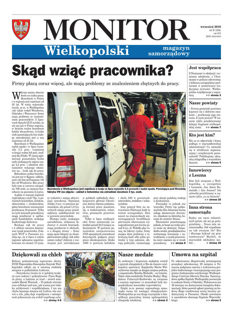 wrzesień 2016 nr 9 (184) rok XVI ISSN 1642-0918 Skąd wziąć pracownika? Firmy płacą coraz więcej, ale mają problemy ze znalezieniem chętnych do pracy. W Z Niemcami w edukacji i wymianie młodzieży; z Ukraińcami w polityce zdrowotnej; z kilkoma europejskimi partnerami w promowaniu tradycyjnej żywności. Wielkopolska współpracuje z zagranicą. >> strona 3 Nasze powiaty – Powiat gostyński powinien kojarzyć się z dobrymi smakami – przekonuje jego starosta. Z czym jeszcze? W naszym cyklu przedstawiamy kolejny fragment wielkopolskiej ziemi. >> strona 7 Kto jest kim? Kto za co odpowiada i komu podlega w marszałkowskiej administracji? Co zmieniło się w strukturze organizacyjnej i urzędniczych personaliach? Publikujemy aktualną infografikę z wszystkimi >> strona 9 danymi. Innowiercy z Leszna FOT. A. BOIŃSKI kraju mamy obecnie boom na rynku pracy. Bezrobocie w Polsce i w regionie jest najniższe od 25 lat. W wielu województwach, m.in. w Wielkopolsce (ale także wokół Wrocławia, Gdańska i Warszawy) firmy mają problemy ze znalezieniem pracowników. Z lipcowych danych GUS wynika, że nie ma już w Polsce regionu, w którym realne bezrobocie byłoby dwucyfrowe. A liczba osób pozostających bez stałego zatrudnienia jest u nas najniższa od 25 lat. Bezrobocie w Wielkopolsce nadal spada i w lipcu wynosiło 5,3 proc. (najmniej w kraju) wobec 8,6 proc. średniej dla Polski. W samej aglomeracji poznańskiej liczba osób szukających zajęcia sięga 2,2 proc. i zdaniem ekonomistów wskazuje właściwie na… brak rąk do pracy. Rekordowo niskie bezrobocie jest też w Kępnie, oddalonym 145 km od Poznania i 85 km od Wrocławia. Bez pracy było tam w czerwcu niespełna 700 osób, co oznacza bezrobocie na poziomie 2,4 proc. A gdzie w naszym regionie najtrudniej o etat? Np. w powiatach konińskim, kolskim, złotowskim i chodzieskim, gdzie bezrobocie nieznacznie przekracza 10 procent. Tylko na tych terenach pracodawcy mogą przebierać w aplikacjach kandydatów, szukając konkretnego fachowca. Brakuje rąk do pracy i w efekcie zaczyna dominować rynek pracownika. Z danych WUP w Poznaniu wynika np., że w lipcu w całym regionie zgłoszono zapotrzebowanie na niemal 13 tysię- Jest współpraca Bezrobocie w Wielkopolsce jest najniższe w kraju (w lipcu wynosiło 5,3 procent) i nadal spada. Powstająca pod Wrześnią fabryka VW (na zdjęciu – zakład w Antoninku) ma zatrudniać docelowo 3 tys. osób. cy wakatów i miejsc aktywizacji zawodowej. Najwięcej (blisko 3 tys.) w powiecie poznańskim, ale ponad 1,2 tys. wolnych miejsc pracy przedsiębiorcy zadeklarowali też w powiecie jarocińskim. Dlatego osoby szukające zatrudnienia, zwłaszcza fachowcy w swoich branżach, mogą przebierać w ofertach, a z drugiej strony – firmy mają spore kłopoty ze skompletowaniem załogi. Jak sobie zatem radzą? Jednym z rozwiązań jest zatrudnianie w polskich zakładach obcokrajowców, głównie Ukraińców, którzy chętnie podejmują również prace sezonowe, np. w budownictwie, rolnictwie, przemyśle przetwórczym. Tylko w lipcu wielkopolskie firmy zamierzały zatrudnić ponad 10,5 tysiąca cudzoziemców. W powiecie poznańskim zarejestrowano 3705 specjalnych oświadczeń dotyczących podjęcia pracy przez obcokrajowców, blisko 1000 w powiecie kaliskim i około 500 w powiatach: ostrowskim, średzkim i wolsztyńskim. Inny pomysł firm na zatrzymanie fluktuacji kadr to wzrost wynagrodzeń. Dziś nawet na stanowiskach niewymagających kwalifikacji pierwszym oferowanym wynagrodzeniem jest kwota ponad 2 tys. zł. Widełki płac rosną, bo liderzy rynku, firmy mające duże problemy z rekrutacją kadr albo pilne potrzeby w tym zakresie, oferują podwyżki, wymuszając przy okazji podobną reakcję u konkurencji. Pieniądze to jednak nie wszystko. Firmy (np. podpoznańska filia Amazona) kuszą załogę darmowymi dowozami, obiadami za złotówkę, bonami do centrów fitness. Ekonomiści przestrzegają jednak, że boom na rynku pracy może się skończyć. Gospodarka zwolni, przedsiębiorstwa wstrzymają inwestycje i zatrudnienie, a rynek pracownika znów zamieni się w rynek pracodawcy. >> strona 8 Kim byli związani z Wielkopolską, a szczególnie z Lesznem, Jan Amos Komeński i Jan Jonson? Ich sylwetki przybliżamy w naszym cyklu „co za historia”. >> strona 10 Inna strona samorządu Radny nie znosi infantylnych pytań, ale my go przepytaliśmy… Nowa rola wicemarszałka. Jak wypadamy na tak zwanym tle? Kto i dlaczego kołysał się przy tamburynie? Myśleli, że marszałek zdobędzie me> strona 16 dal… Nasze medale Umowa na szpital Rolnicy podsumowują tegoroczne zbiory. XVIII Wojewódzko-Diecezjalne Dożynki Wielkopolskie odbyły się w ostatnią niedzielę sierpnia w podkaliskim Liskowie. – Dożynkowe święto to w polskiej tradycji czas radości i podziękowań: Panu Bogu za plony, a ludziom za trud – mówił marszałek Marek Woźniak. – To jednak również czas refleksji nad tym, jak ważna jest ludzka solidarność i współdziałanie. I nie ma chyba lepszego miejsca niż Lisków, aby mówić o sile, jaką daje współpraca i umiejętność jednoczenia się wokół wspólnego celu. >> strony 4-5 Ze srebrnym i brązowym medalem wrócili z igrzysk olimpijskich w Rio de Janeiro wielkopolscy sportowcy. Kajakarka Marta Walczykiewicz stanęła na drugim miejscu podium, a zapaśniczka Monika Michalik – na trzecim. Także złote medalistki Natalia Madaj i Magdalena Fularczyk-Kozłowska są związane z naszym regionem i w przeszłości były stypendystkami marszałka województwa. Dzięki m.in. pomocy regionalnego samorządu rosną też następcy olimpijczyków: Wielkopolska po raz drugi zwyciężyła w klasyfikacji generalnej letniej ogólnopolskiej olimpiady młodzieży. >> strona 2 Po zakończeniu długotrwałej przetargowej procedury odwoławczej, 29 sierpnia w Poznaniu podpisano umowę z wykonawcą projektu budowlanego i koncepcyjnego oraz programu funkcjonalno-użytkowego Wiel