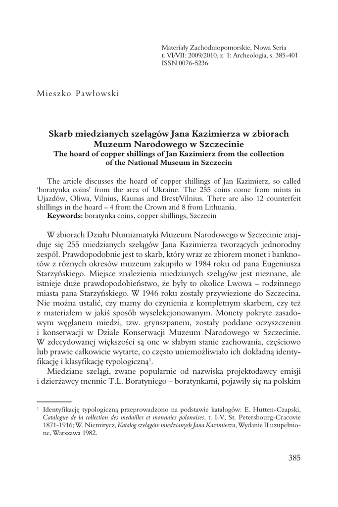 Materiały Zachodniopomorskie, Nowa Seria t. VI/VII: 2009/2010, z. 1: Archeologia, s. 385-401 ISSN 0076-5236 Mieszko Pawłowski Skarb miedzianych szelągów Jana Kazimierza w zbiorach Muzeum Narodowego w Szczecinie The hoard of copper shillings of Jan Kazimierz from the collection of the National Museum in Szczecin The article discusses the hoard of copper shillings of Jan Kazimierz, so called ‘boratynka coins’ from the area of Ukraine. The 255 coins come from mints in Ujazdów, Oliwa, Vilnius, Kaunas and Brest/Vilnius. There are also 12 counterfeit shillings in the hoard – 4 from the Crown and 8 from Lithuania. Keywords: boratynka coins, copper shillings, Szczecin W zbiorach Działu Numizmatyki Muzeum Narodowego w Szczecinie znajduje się 255 miedzianych szelągów Jana Kazimierza tworzących jednorodny zespół. Prawdopodobnie jest to skarb, który wraz ze zbiorem monet i banknotów z różnych okresów muzeum zakupiło w 1984 roku od pana Eugeniusza Starzyńskiego. Miejsce znalezienia miedzianych szelągów jest nieznane, ale istnieje duże prawdopodobieństwo, że były to okolice Lwowa – rodzinnego miasta pana Starzyńskiego. W 1946 roku zostały przywiezione do Szczecina. Nie można ustalić, czy mamy do czynienia z kompletnym skarbem, czy też z materiałem w jakiś sposób wyselekcjonowanym. Monety pokryte zasadowym węglanem miedzi, tzw. grynszpanem, zostały poddane oczyszczeniu i konserwacji w Dziale Konserwacji Muzeum Narodowego w Szczecinie. W zdecydowanej większości są one w słabym stanie zachowania, częściowo lub prawie całkowicie wytarte, co często uniemożliwiało ich dokładną identyfikację i klasyfikację typologiczną1. Miedziane szelągi, zwane popularnie od nazwiska projektodawcy emisji i dzierżawcy mennic T.L. Boratyniego – boratynkami, pojawiły się na polskim 1 Identyfikację typologiczną przeprowadzono na podstawie katalogów: E. Hutten-Czapski, Catalogue de la collection des medailles et monnaies polonaises, t. I-V, St. Petersbourg-Cracovie 1871-1916; W. Niemirycz, Katalog szelągów miedzianych Jana Kazimierza, Wydanie II uzupełnione, Warszawa 1982. 385 rynku pieniężnym za panowania Jana Kazimierza. Był to dla Królestwa Polskiego ciężki okres. Krajem uwikłanym w wojny z potężnymi sąsiadami, Rosją i Szwecją, dodatkowo wstrząsały konflikty wewnętrzne, co wpływało negatywnie na gospodarkę i finanse państwa. Wojny wyczerpały rezerwy pieniężne, Królestwo Polskie było słabe i zadłużone. Konieczna była reforma pieniężna, a zwłaszcza nasycenie kraju drobną monetą, której nie bito za panowania poprzednika Jana Kazimierza, Władysława IV. Jednak reforma pieniężna z 1650 roku, a zwłaszcza zamiar emisji monety drobnej z dobrego kruszcu, nie powiodła się. Rosnące wydatki wojenne sprawiały, że na rynku pojawiała się coraz większa ilość coraz gorszego pieniądza (Kurpiewski 1988, 66). Z pomocą skarbowi państwa przyszedł Tytus Liwiusz Boratyni (Burattini), jeden z dzierżawców mennicy krakowskiej 2, który zaproponował wybicie podwartościowych miedzianych szelągów o kursie przymusowym, pokrycie nimi długów, zapłacenie zaległych żołdów i zlikwidowane deficytu skarbowego. W 1659 roku rozpoczęto produkcję monety miedzianej o ciężarze 1,34 g i w liczbie 150 sztuk z grzywny, a więc o połowę lżejszej niż zakładano w reformie z 1650 roku (Żabiński 1983, 54). Pomysł wprowadzenia na rynek monety miedzianej, który przeprowadził Boratyni nie był nowy. Pojawił się już w założeniach reformy w 1650 roku. Rynek był zresztą częściowo przygotowany na ten krok, jako że od początku XVII wieku polski szeląg był w zasadzie monetą miedzianą. Poza tym, do obiegu przenikały miedziane szkockie turnery, odgrywając rolę pieniądza zdawkowego. Miedziana moneta miała więc rację bytu, jednakże jej emisja i zasady obiegu musiały podlegać ścisłemu nadzorowi (Mikołajczyk 1983a, 175-176; Żabiński 1983, 55). Plan Boratyniego, aby finanse państwa ratować emisją szelągów na kwotę 2 milionów złotych, nie stanowił więc większego zagrożenia dla systemu finansowego kraju. 2 Boratyni (Burattini), wywodzący się z miasta Agordo w północnych Włoszech, pojawił się w Polsce za czasów Władysława IV. Był nietuzinkowym, gruntownie jak na owe czasy wykształconym człowiekiem. Studiował nauki matematyczno-fizyczne, astronomię, języki obce oraz literaturę klasyczną. Z zapałem oddawał się badaniom naukowym i utrzymywał kontakty z ludźmi nauki swoich czasów. Walczył też ze Szwedami na czele własnym sumptem wystawionego oddziału piechoty. Jako architekt na dworze Jana Kazimierza kierował budową pałacu królewskiego i odbudową zamku ujazdowskiego. W 1652 roku dzierżawił olborę olkuską. W 1658 roku wraz z Pawłem del Buono, byłym dzierżawcą kopalń i mennic cesarskich, otrzymał także w roczną dzierżawę mennicę krakowską. W tym samym roku uzyskał tytuł sekretarza królewskiego. Prawdopodobnie w celu uzdrowienia finansów państwa, na sejmie w 1658 roku chciał przedstawić projekt wprowadzenia w Królestwie Polskim pieniędzy papierowych. Na tym samym sejmie w uznaniu licznych zasług dla Korony nadano mu szlachectwo. Wtedy też dokonała się oficjalna zmiana nazwiska na polsko brzmiące – z Burattini na Boratyni (Hniłko 1921, 98-122). 386 Pierwsze szelągi koronne wybito w Krakowie w 1659 roku, ale produkcja na wielką skalę ruszyła dopiero po otwarciu mennicy w Ujazdowie (1659-1666), gdzie bito monetę tak dla Korony, jak i Litwy, oraz w innych mennicach produkujących wyłącznie miedziane szelągi litewskie – w Wilnie (1664-1666), Oliwie (1663), Malborku (1666), Kownie (1665-1667) oraz w Brześciu Litewskim (1665-1666) (ryc. 1; por. Mikołajczyk 1983a, 180). Szybko jednak okazało się, że Boratyni (za milczącą zgodą władzy [?]) nie zamierzał respektować umowy dzierżawy. W mennicy ujazdowskiej w latach 1659-1661 podniesiono pr