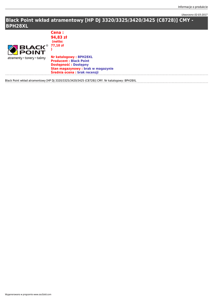 Informacje o produkcie Utworzono 02-03-2017 Black Point wkład atramentowy [HP DJ 3320/3325/3420/3425 (C8728)] CMY BPH28XL Cena : 94,83 zł (netto: 77,10 zł ) Nr katalogowy : BPH28XL Producent : Black Point Dostępność : Dostępny Stan magazynowy : brak w magazynie Średnia ocena : brak recenzji Black Point wkład atramentowy [HP DJ 3320/3325/3420/3425 (C8728)] CMY. Nr katalogowy: BPH28XL Wygenerowano w programie www.oscGold.com