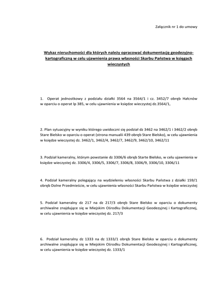 Załącznik nr 1 do umowy Wykaz nieruchomości dla których należy opracować dokumentację geodezyjnokartograficzną w celu ujawnienia prawa własności Skarbu Państwa w księgach wieczystych 1. Operat jednostkowy z podziału działki 3564 na 3564/1 i cz. 3452/7 obręb Hałcnów w oparciu o operat lp 385, w celu ujawnienia w księdze wieczystej dz.3564/1, 2. Plan sytuacyjny w wyniku którego uwidoczni się podział dz 3462 na 3462/1 i 3462/2 obręb Stare Bielsko w oparciu o operat (strona manualii 439 obręb Stare Bielsko), w celu ujawnienia w księdze wieczystej dz. 3462/1, 3462/4, 3462/7, 3462/9, 3462/10, 3462/11 3. Podział kameralny, którym powstanie dz 3306/6 obręb Starte Bielsko, w celu ujawnienia w księdze wieczystej dz. 3306/4, 3306/5, 3306/7, 3306/8, 3306/9, 3306/10, 3306/11 4. Podział kameralny polegający na wydzieleniu własności Skarbu Państwa z działki 159/1 obręb Dolne Przedmieście, w celu ujawnienia własności Skarbu Państwa w księdze wieczystej 5. Podział kameralny dz 217 na dz 217/3 obręb Stare Bielsko w oparciu o dokumenty archiwalne znajdujące się w Miejskim Ośrodku Dokumentacji Geodezyjnej i Kartograficznej, w celu ujawnienia w księdze wieczystej dz. 217/3 6. Podział kameralny dz 1333 na dz 1333/1 obręb Stare Bielsko w oparciu o dokumenty archiwalne znajdujące się w Miejskim Ośrodku Dokumentacji Geodezyjnej i Kartograficznej, w celu ujawnienia w księdze wieczystej dz. 1333/1 7. Podział kameralny w wyniku którego powstanie działka ozn. jako 301/3 obręb Stare Bielsko, w celu ujawnienia jej w księdze wieczystej 8. Operat z nazwania części działki 660/5 obręb Mikuszowice Krakowskie powstałej operatem Ep. 85/87 z dnia 27.05.1987r, w celu ujawnienia w księdze wieczystej dz. 386/9 9. Podział kameralny, którym powstanie działka 269/5 obręb Stare Bielsko, w celu ujawnienia jej w księdze wieczystej 10. Podział kameralny w wyniku którego powstanie działka 3338/1 a następnie dz 3338/2-4 obręb Stare Bielsko, w celu ujawnienia w księdze wieczystej dz. 3338/2 i 3338/3 11. Plan sytuacyjny z podziału dz 2001 na 2001/1 obręb Stare Bielsko w oparciu o operat poregulacyjny (str. 4A z maja 1995r.), w celu ujawnienia w księdze wieczystej dz. 2001/8 i 2001/9 12. Operat z nazwania części działki 787/1 obręb Mikuszowice Śląskie powstałej operatem 626/68 z 1968r. w celu ujawnienia w księdze wieczystej dz 103/129 13. Podział kameralny w wyniku którego powstanie działka 284/2, obręb Stare Bielsko w celu ujawnienia jej w księdze wieczystej 14. Plan sytuacyjny na podstawie operatu Ep 201/84 dla dz 958/1, 958/2, 958/3, 958/4 obręb Mikuszowice Krakowskie w celu ujawnienia ich w księdze wieczystej 15. Plan podziału dz 3456/1 na dz 3456/11-13 obręb Stare Bielsko, w celu ich ujawnienia w księdze wieczystej 16. Opracowanie dokumentacji zmieniającej dz 1044/18 na dz 1044/25 obręb Kamienica, która wchłonie błędnie opisaną dz 2650/1 (na podst. operatu 100a), a następnie wykonanie dokumentacji zmieniającej nr powstałej dz 1044/25 ze względu na podwójną numerację w celu ujawnienia w księdze wieczystej dz 2650/1 17. Opracowanie dokumentacji zmieniającej konfigurację i pow. dz 820/1 obręb Kamienica (na podstawie operatu 100a), a następnie wykonać zmianę pow. i oznaczenia (zgodnie z operatem 690 EP.139/82) w celu ujawnienia w księdze wieczystej dz 820/13.