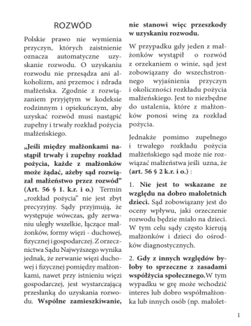 Rozwód Polskie prawo nie wymienia przyczyn, których zaistnienie oznacza automatyczne uzyskanie rozwodu. O uzyskaniu rozwodu nie przesądza ani alkoholizm, ani przemoc i zdrada małżeńska. Zgodnie z rozwiązaniem przyjętym w kodeksie rodzinnym i opiekuńczym, aby uzyskać rozwód musi nastąpić zupełny i trwały rozkład pożycia małżeńskiego. „Jeśli między małżonkami nastąpił trwały i zupełny rozkład pożycia, każde z małżonków może żądać, ażeby sąd rozwiązał małżeństwo przez rozwód” (Art. 56 § 1. k.r. i o.) Termin „rozkład pożycia” nie jest zbyt precyzyjny. Sądy przyjmują, że występuje wówczas, gdy zerwaniu uległy wszelkie, łączące małżonków, formy więzi - duchowej, fizycznej i gospodarczej. Z orzecznictwa Sądu Najwyższego wynika jednak, że zerwanie więzi duchowej i fizycznej pomiędzy małżonkami, nawet przy istnieniu więzi gospodarczej, jest wystarczającą przesłanką do uzyskania rozwodu. Wspólne zamieszkiwanie, nie stanowi więc przeszkody w uzyskaniu rozwodu. W przypadku gdy jeden z małżonków wystąpił o rozwód z orzekaniem o winie, sąd jest zobowiązany do wszechstronnego wyjaśnienia przyczyn i okoliczności rozkładu pożycia małżeńskiego. Jest to niezbędne do ustalenia, które z małżonków ponosi winę za rozkład pożycia. Jednakże pomimo zupełnego i trwałego rozkładu pożycia małżeńskiego sąd może nie rozwiązać małżeństwa jeśli uzna, że (art. 56 § 2 k.r. i o.) : 1. Nie jest to wskazane ze względu na dobro małoletnich dzieci. Sąd zobowiązany jest do oceny wpływu, jaki orzeczenie rozwodu będzie miało na dzieci. W tym celu sądy często kierują małżonków i dzieci do ośrodków diagnostycznych. 2. Gdy z innych względów byłoby to sprzeczne z zasadami współżycia społecznego.W tym wypadku w grę może wchodzić interes lub dobro współmałżonka lub innych osób (np. małolet1 nich dzieci jednego z małżonSkutki rozwodu ków, lub dzieci pełnoletnich). •Prawo do zawarcia nowego Za sprzeczne z zasadami współmałżeństwa. Po orzeczeniu życia można np. uznać orzeczerozwodu można zawrzeć ponie rozwodu, gdy małżonek powtórnie związek małżeński. zwany jest nieuleczalnie chory, wymaga moralnego lub finan- •Powstaje rozdzielność majątkowa pomiędzy małżonkasowego wsparcia. mi. Od momentu orzeczenia 3. Gdy rozwodu żąda małżorozwodu każdy z małżonków nek wyłącznie winny rozkłazarabia tylko na swój majądu pożycia. W tym przypadku tek osobisty. Majątek wspólny kodeks przewiduje wyjątki. małżonków z okresu sprzed Małżonek wyłącznie winny rozrozwodu może ulec podziakładu pożycia może otrzymać łowi (w drodze umownej lub rozwód, jeżeli: drugi małżonek sądownie). wyraża przed sądem zgodę na rozwód, drugi małżonek nie •Wyłączenie od dziedziczenia. Małżonkowie nie dziedziczą wyraża zgody na rozwód, ale po sobie (chyba, że na podstajego odmowa jest w określonej wie testamentu). sytuacji sprzeczna z zasadami współżycia społecznego (np. •Alimenty pomiędzy małżonmałżonek pozwany nie kocha kami. W określonych przez współmałżonka, dokucza mu prawo przypadkach pomiędzy itp., a na rozwód nie zgadza się małżonkami po rozwodzie poz czystej złośliwości, małżonek wstaje obowiązek płacenia aliżądający rozwodu ma na swomentów. Po pierwsze małżonek im utrzymaniu pozamałżeńskie rozwiedziony, który nie został dzieci). Wówczas, pomimo że uznany za wyłącznie winnego rozwodu domaga się małżorozkładu pożycia i który znajnek wyłącznie winny rozkładu duje się w niedostatku, może pożycia, rozwód może zostać żądać od drugiego małżonka orzeczony. rozwiedzionego dostarczania 2 środków utrzymania w zakre- •Władza rodzicielska. Sąd rozstrzyga o władzy rodzicielskiej sie odpowiadającym usprawienad wspólnym małoletnim dliwionym potrzebom uprawdzieckiem obojga małżonków. nionego oraz możliwościom Może przykładowo powierzyć zarobkowym i majątkowym wykonywanie władzy jednezobowiązanego. Po drugie, jemu z rodziców ograniczając żeli jeden z małżonków został władzę rodzicielską drugiego uznany za wyłącznie winnego do określonych obowiązków rozkładu pożycia, a rozwód i uprawnień w stosunku do pociąga za sobą istotne poosoby dziecka. Możliwe jest gorszenie sytuacji materialnej też uregulowanie kontaktów małżonka niewinnego, sąd na z dzieckiem. żądanie małżonka niewinnego może orzec, że małżonek wy• Wspólne mieszkanie małłącznie winny obowiązany jest żonków. Jeżeli małżonkowie przyczyniać się w odpowiedzajmują wspólne mieszkanie, nim zakresie do zaspokajania sąd w wyroku orzekającym rozusprawiedliwionych potrzeb wód orzeka także o sposobie małżonka niewinnego (czyli korzystania z tego mieszkania płacenia alimentów), chociażprzez czas wspólnego w nim by ten nie znajdował się w niezamieszkiwania małżonków po dostatku. rozwodzie. W wypadkach wyjątkowych, gdy jeden z małżon•Alimenty na dzieci. Sąd orzeków swym rażąco nagannym ka, w jakiej wysokości każdy postępowaniem uniemożliwia z małżonków obowiązany jest wspólne zamieszkiwanie, sąd do ponoszenia kosztów utrzymoże nakazać jego eksmisję na mania i wychowania dziecka. żądanie drugiego małżonka. W praktyce oznacza to, że na Na zgodny wniosek stron sąd jednego z małżonków nałomoże w wyroku orzekającym żony jest obowiązek płacenia rozwód orzec również o podziaalimentów do rąk drugiego le wspólnego mieszkania albo małżonka, z którym mieszkają o przyznaniu mieszkania jeddzieci. 3 nemu z małżonków, jeżeli drugi małżonek wyraża zgodę na jego opuszczenie bez dostarczenia lokalu zamiennego i pomieszczenia zastępczego, o ile podział, bądź jego przyznanie jednemu z małżonków, są możliwe. Postępowanie sądowe w sprawie separacji może toczyć się w dwóch trybach: - w trybie spornym, gdy tylko jeden z m