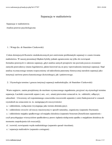 www.radiomaryja.pl/audycje.php?id=27707 2011-10-04 Separacja w małżeństwie Separacja w małżeństwie. Analiza prawno-psychologiczna 1. Wstęp (ks. dr Stanisław Cierkowski) Celem dzisiejszych Rozmów niedokończonych jest omówienie problematyki separacji w czasie trwania małżeństwa. W naszej prezentacji błędem byłoby jednak ograniczenie się tylko do rozwiązań formalno-prawnych w zakresie separacji, gdyż analiza samych przepisów nie pozwala jeszcze zrozumieć zamysłu prawodawcy (mens legislatoris), jakim kierował się on przy wprowadzeniu instytucji separacji. Stąd analizę wyznaczonego tematu rozpoczniemy od nakreślenia panoramy historycznej narodzin separacji jako instytucji zarówno prawa kanonicznego (kościelnego), jak i państwowego. 2. Etymologia terminu i geneza instytucji separacji małżeńskiej(ks. dr Stanisław Cierkowski) Warto najpierw, zanim przejdziemy do meritum wyznaczonego zagadnienia, przyjrzeć się etymologii terminu separacja. Łaciński czasownik separo (-are, -avi, -atum) pierwotnie oznaczał m. in.: oddzielić, odłączyć, odosobnić . Utworzony od wspomnianego czasownika rzeczownik separatio (-onis) funkcjonował w czasach rzymskich na oznaczenie m. in. następujących rzeczywistości: a. oddzielenie, rozłączenie (występując jako termin abstrakcyjny); b. oddzielenie owoców od rzeczy macierzystej w sposób naturalny, organiczny (separatio fructuum); c. oddzielenie majątku spadkowego od majątku dziedzica (separatio bonorum [beneficium separationis czyli przysługujące wierzycielom spadkodawcy prawo żądania niełączenia spadku z majątkiem dziedzica do momentu zaspokojenia ich roszczeń]); d. rozwód, rozwiązanie węzła małżeńskiego (separatio quoad vinculum); e. separacja małżonków (separatio coniugum) . www.radiomaryja.pl Strona 1/11 Trzeba dodać, iż chociaż sam termin separatio pochodzi z języka łacińskiego, to jednak prawo rzymskie nie znało instytucji separacji małżonków. W prawie rzymskim istniał jedynie rozwód (divortium), który zawsze prowadził do rozwiązania małżeństwa . W Imperium Rzymskim: "Rozwód polegał na tym, że faktycznie zostawała usunięta wspólnota małżeńska przez jedną ze stron lub przez obie w drodze woli skierowanej na rozwiązanie małżeństwa. Na skutek tego znikała affectio maritalis" . Jeśli chodzi o formę tegoż aktu, to: "Rozwód dochodził do skutku przez akt czysto prywatny (w szczególności bez udziału sądu), bez obowiązku zachowania określonej formy. Istniały tylko formy zwyczajowe" , z których na początku stosowano odebranie kluczy żonie , a następnie wręczenie jej listu rozwodowego (n.b. w okresie postklasycznym prawo sporządzenia tegoż listu uzyskała także żona) . Jednocześnie - pod wpływem chrześcijan - zaczęto w późnym prawie rzymskim wprowadzać obostrzenia w zakresie prawa rozwodowego . Podobne rozwiązania obowiązywały w prawie żydowskim Starego Testamentu (n.b. problem ten dobrze jest znany z Pisma Św. zarówno Starego, jak i Nowego Testamentu).U Żydów zatem mąż mógł oddalić żonę, gdy: "znalazł u niej coś odrażającego" (Pwt 24, 1) , a oddalenie to skutkowało rozwiązaniem małżeństwa. Formą tego oddalenia było albo zadeklarowanie przez męża woli przeciwnej niż w akcie zawarcia małżeństwa, np. przez wypowiedzenie słów: "Ona bowiem już nie jest moją żoną, a Ja już nie jestem jej mężem" (Os. 2, 4) , albo przez sporządzenie i wręczenie żonie listu rozwodowego . W Nowym Testamencie faryzeusze, z jednej strony wystawiając Jezusa na próbę, a drugiej strony sami mając wątpliwości zwłaszcza co do przyczyn oddalenia żony, zapytali: "Czy wolno oddalić swoją żonę z jakiegokolwiek powodu?" (Mt 19, 3). Jezus, korzystając z okazji, w odpowiedzi wyjawił zamysł Stwórcy co do instytucji małżeństwa: "Czy nie czytaliście, że Stwórca od początku stworzył ich jako mężczyznę i kobietę?(...)dlatego opuści człowiek ojca i matkę i złączy się ze swoją żoną, i będą oboje jednym ciałem. A tak już nie są dwoje, lecz jedno ciało. Co więc Bóg złączył, niech człowiek nie rozdziela" (Mt 19, 4-6) . Jezus zatem w sposób zdecydowany potwierdza przymiot nierozerwalności jako istniejący w zamyśle Stwórcy już podczas aktu stworzenia pierwszej pary ludzkiej. Chrześcijanie zatem, wiernie aplikując nauczanie Jezusa, już od początku istnienia Kościoła (czyli jeszcze pod panowaniem Imperium Rzymskiego) zaczęli głosić naukę o nierozerwalności małżeństwa (zwłaszcza naturalnego i sakramentalnego). Dla chrześcijan bowiem, także w dzisiejszym świecie,rozwód nie może być przewidziany jako ucieczka od trudnych nieraz problemów małżeńskich. Prawo kanoniczne zatem, kierując się zarówno dążeniem do nierozerwalności małżeństwa, jak i zaradzeniem konfliktom małżeńskim, już w pierwszych wiekach chrześcijaństwa wprowadziło instytucję separacjijako nie przekreślającą zamysłu Stwórcy, który: "od początku stworzył ich jako mężczyznę i kobietę" (Mt 19, 4), czyli jako nierozerwalną wspólnotę życia i miłości . www.radiomaryja.pl Strona 2/11 3. Separacja w prawie kanonicznym (ks. dr Stanisław Cierkowski) Doktrynalna definicja separacji - wg ks. prof. W. Góralskiego - jest następująca: "Separacja, inaczej rozdział, jest to zerwanie lub zaniechanie wspólnego pożycia małżonków mimo dalszego trwania ich węzła małżeńskiego i wynikającej zeń przeszkody [do zawarcia kolejnego małżeństwa - wł.]" . Warto sprecyzować zatem, że w przypadku separacji nierozerwalny z mocy prawa boskiego ważny węzeł małżeński nadal trwa , a następuje jedynie rozdzielenie (oddzielenie) małżonków od łoża i stołu (separatio coniugum quoad torum et mensam). Doktryna prawa kanonicznego określa, że wspomniany rozdział małżonków: "może być dozgonny, bez obowiązku wznawiania kiedykolwiek wspólnoty życia, lub też czasowy, kończący się 