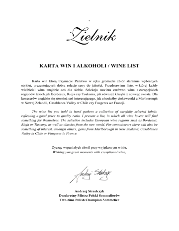 ` KARTA WIN I ALKOHOLI / WINE LIST Karta win którą trzymacie Państwo w ręku gromadzi zbiór starannie wybranych etykiet, prezentujących dobrą relację ceny do jakości. Przedstawiam listę, w której każdy wielbiciel wina znajdzie coś dla siebie. Selekcja zawiera zarówno wina z europejskich regionów takich jak Bordeaux, Rioja czy Toskania, jak również klasyki z nowego świata. Dla koneserów znajdzie się również coś interesującego, jak chociażby ciekawostki z Marlborough w Nowej Zelandii, Casablanca Valley w Chile czy Faugeres we Francji. The wine list you hold in hand gathers a collection of carefully selected labels, reflecting a good price to quality ratio. I present a list, in which all wine lovers will find something for themselves. The selection includes European wine regions such as Bordeaux, Rioja or Tuscany, as well as classics from the new world. For connoisseurs there will also be something of interest, amongst others, gems from Marlborough in New Zealand, Casablanca Valley in Chile or Faugeres in France. Życząc wspaniałych chwil przy wyjątkowym winie, Wishing you great moments with exceptional wine, Andrzej Strzelczyk Dwukrotny Mistrz Polski Sommelierów Two-time Polish Champion Sommelier Aperitiff Whisky sour (Ballantines, syrop tempranillo, białko jajka,) 25,- Negroni Sbagliato (Martini Rosso, Campari, prosecco) 25,- French 75 (Beefeater Gin, prosecco, syrop cukrowy, sok z cytryny) 25,- Garibaldi (Campari, świeży sok pomarańczowy) 25,- Caipirinha (Canario Cachaca, limonka) 25,- Martini (Wyborowa, Martini Dry Bianco) 25,- Margharita (Olmeca Silver, Cointreau) 25,- NV Prosecco Gancia Extra Dry, Italy kiel. 15,- NV G.H. Mumm Cordon Rouge Brut, Champagne, France kiel. 45,- NV Alain Bernard Brut, Dizy, Champagne, France kiel. 47,- Denatile, Grillo/Chardonnay, Italy kiel. 15,- Ventisquero Reserva, Sauvignon Blanc, Casablanca Valley, Chile kiel. 18,- Rocca Ventosa, Pinot Grigio, Cantina Tollo, Abruzzo, Italy kiel. 19,- Messer del Fauno, DOC Salice Salentino, Italy kiel. 15,- Ventisquero Reserva, Cabernet Sauvignon, Do Maipo Valley, Chile kiel. 19,- Pago de Cirsus Oak Aged, DO Navarra , Spain 20,- Wina domowe / House wines kiel. Wina deserowe / Dessert wines 2011 Tokaji Samorodni Sweet, Oremus kiel. 27,- 129,- 2010 Porto LBV, Quinta do Passadouro, Douro Valley kiel. 35,- 265,- Szampany i wina musujące / Champagne and sparkling wines NV Prosecco Gancia Brut, Veneto, Italy 89,- NV G.H. Mumm Cordon Rouge Brut, Champagne, France 290,- NV Alain Bernard Brut Tradition Premier Cru, Grande Vallée, Dizy 295,- NV G.H. Mumm Demi-Sec, Champagne, France 295,- NV G.H. Mumm Blanc de Blanc, Champagne, France 760,- NV G.H. Mumm Rosé, Champagne, France 439,- 2006 G.H. Mumm Millésimé, Champagne, France 379,- NV 399,- Perrier Jouët Grand Brut, Champagne, France 2006 Perrier Jouët Belle Epoque, Champagne, France 990,- Wina białe / White wines Polska / Poland 2015 Wrestling XV , Riesling , Winnica Modła , Małopolski Przełom Wisły 149,- Francja / France 2014 Chardonnay, Moulin de Gassac, Languedoc 95,- 2013 Attitude Sauvignon Blanc, Pascal Jolivet, Loire Valley 145,- 2014 Pouilly Fume, Domaine de Fines Coillates, Loire Valley 199,- 2015 Chablis Domaine Fevre, Burgundy 179,- Włochy / Italy 2015 Roccaperciata Grillo, Terre Siciliane 79,- 2015 Pinot Grigio “Rocca Ventosa”, Cantina Tollo, Abruzzo 95,- Hiszpania / Spain 2015 Viña Esmeralda, Torres, D.O. Penedès 129,- Niemcy / Germany 2015 Kendermanns Riesling Kabinett, Mosel 109,- 2015 Riesling halbtrocken “Zeppelinwein”, Mülheimer Sonnenlay, Mosel 139,- Austria 2015 Grüner Veltliner, Domaene Gobelsburg, Kamptal 109,- Chile 2015 Augustinos Sauvignon Blanc, Central Valley 2015 Adobe Reserva Chardonnay, Casablanca Valley, Emiliana 89,109,- Nowa Zelandia/ New Zealand 2015 Sauvignon Blanc Satellite, Spy Valley, Marlborough 139,- 2015 Sauvignon Blanc, Matua, Marlborough 149,- Wina czerwone / Red wines Francja / France 2014 Moulin de Gassac Classic Rouge, Languedoc 95,- 2013 Château de Carmarsac, Thierry Lurton, Bordeaux Supérieur 115,- 2008 Château Dauzac 5-eme GCC, Margaux 429,- 2011 Clarendelle by Haut-Brion, Bordeaux 179,- 2012 Châteauneuf-du-Pape, Domaine de Nalys, Rhone Valley 249,- 2010 Domaine Leon Barral, Faugeres, Languedoc-Roussillon 235,- Włochy / Italy 2012 Chianti Riserva, Castellani, Toscana 99,- 2013 Chianti Classico “Peppoli”, Antinori, Toscana 185,- 2014 Barbera d’Alba Lavai, Azienda Agricola Ghiomo, Piedmont 145,- 2006 Barolo “Monvigliero”, Bel Colle, Piedmont 325,- 2010 Amarone Monte Gradela, Bonazzi, Veneto 349,- 2012 Campofiorin Ripasso, MASI, Veneto 159,- 2009 Brunello di Montalcino Vigna Soccorso, Toscana 349,- 2015 Primitivo Lucarelli, Terre di Sava, Puglia 109,- Hiszpania / Spain 2013 Castillo de Monte de la Reina, Toro 125,- 2013 Viña Bujanda Crianza, Rioja 139,- 2009 Viña Alberdi Reserva, Rioja Alta 199,- 2011 Alion, Ribera del Duero 495,- 2008 Pintia, Toro 395,- Chile 2013 Ventisquero Clasico Cabernet Sauvignon, Casablanca Valley 2013 Montes Reserva Cabernet Sauvignon, Colchagua Valley 89,129,- Argentyna / Argentina 2014 Finca El Origen Malbec, Mendoza 2014 Amalaya, Malbec Syrah Cabernet Sauvignon, Salta 99,119,- Australia 2012 Bremerviev Shiraz, Bleasdale, Langhorne Creek 175,- Stany Zjednoczone / United States 2013 Zinfandel, Mauro Americano, California 99,- Wódki / Vodkas Wódka Wyborowa 40ml 9,- Wyborowa Exquisite 40ml 17,- Ostoya 40ml 15,- Absolut Vodka 40ml 11,- Absolut Elyx 40ml 21,- Żubrówka 40ml 10,- Beefeater 40ml 19,- Beefeater 24 40ml 23,- Havana Club Anejo 3 Anos 40ml 17,- Havana Club Anejo 7 Anos 40ml 20,- Havana Selection de Maestros 40ml 23,- Malibu 40ml 15,- Dictador 20 Y.O. 40ml 25,- Olmeca Silver 40ml 17,- Olmeca Gold 40ml 18,- Gin Rum Tequila Whisky blended Ballantine's Finest 40ml 17,- Ballantine's 12 Y.O. 40ml 21,- Chivas Extra 40ml 25,- Chivas Regal 12 Y.O. 40ml 23,- Chivas Regal 18 Y.O. 40ml 35,- The Glenlivet Founders Reserve 40ml 24,- The Gl