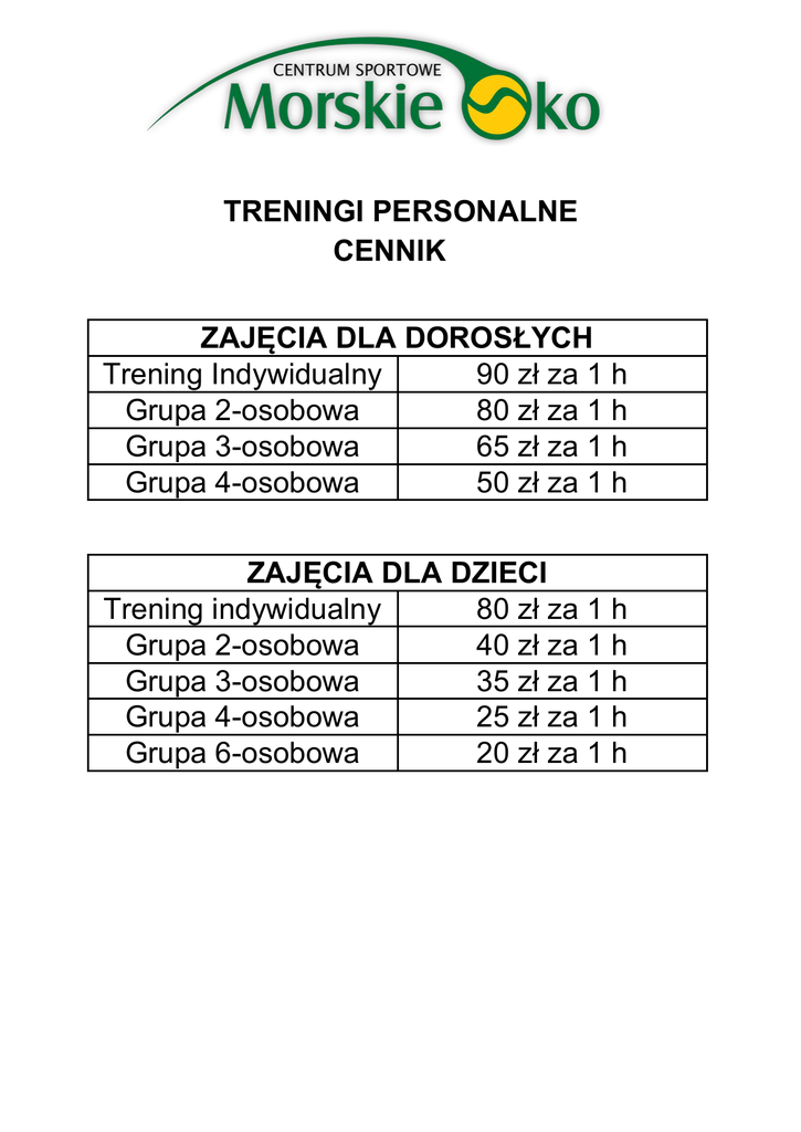TRENINGI PERSONALNE CENNIK ZAJĘCIA DLA DOROSŁYCH Trening Indywidualny 90 zł za 1 h Grupa 2-osobowa 80 zł za 1 h Grupa 3-osobowa 65 zł za 1 h Grupa 4-osobowa 50 zł za 1 h ZAJĘCIA DLA DZIECI Trening indywidualny 80 zł za 1 h Grupa 2-osobowa 40 zł za 1 h Grupa 3-osobowa 35 zł za 1 h Grupa 4-osobowa 25 zł za 1 h Grupa 6-osobowa 20 zł za 1 h